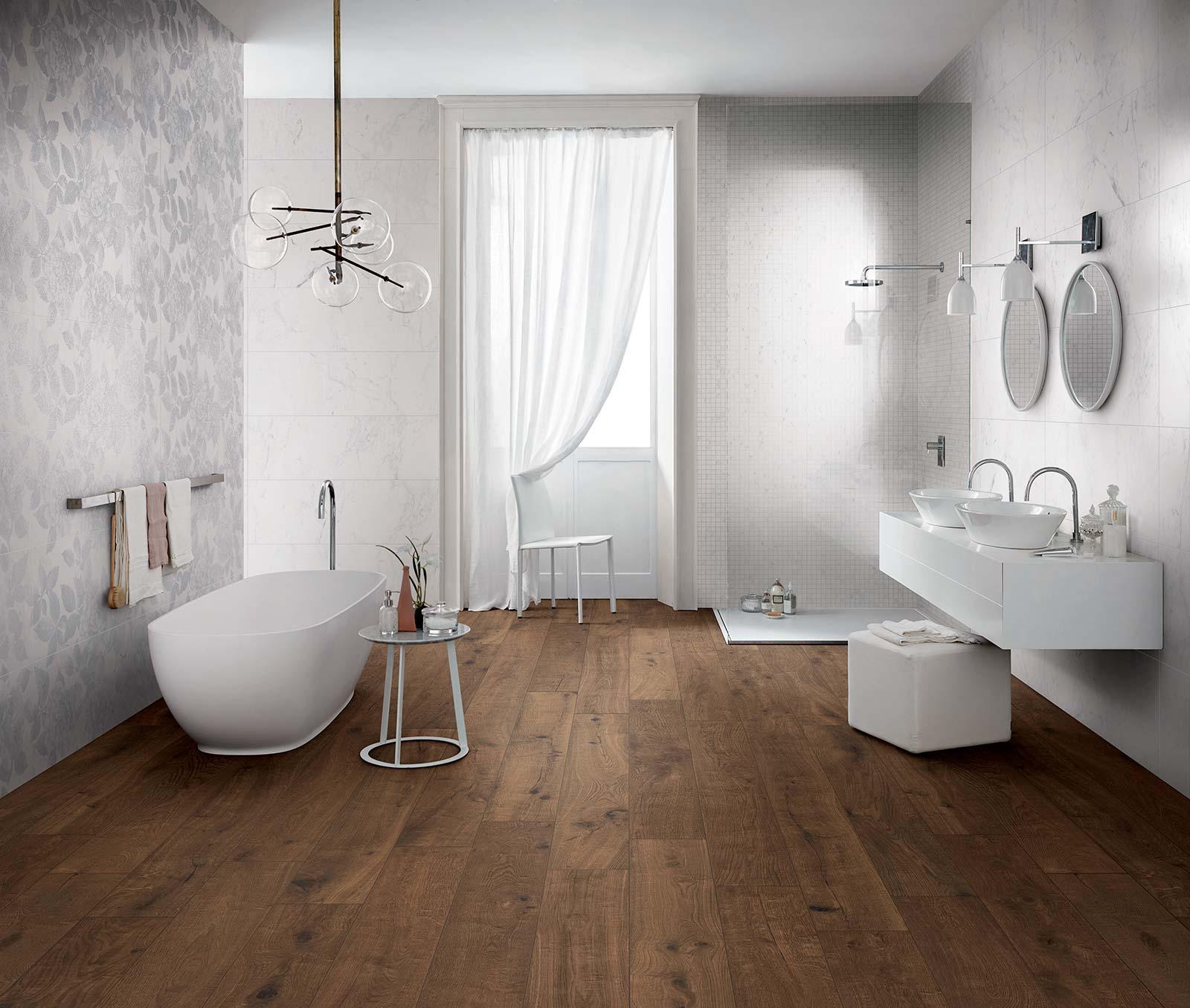 Per questa ispirazione il rivestimento per il bagno effetto spa non può che essere il marmo, ricco di venature, nelle varianti del bianco-beige, bianco-grigio, marrone o nero. La collezione in ceramica effetto marmo Allmarble Wall Marazzi lo suggerisce sotto forma di piastrelle in grande formato 40×120 cm opache o lucide, da abbinare a pavimenti realizzati con la collezione gemella in gres porcellanato effetto marmo Allmarble o con altre linee sempre in gres tipo pietra o marmo.