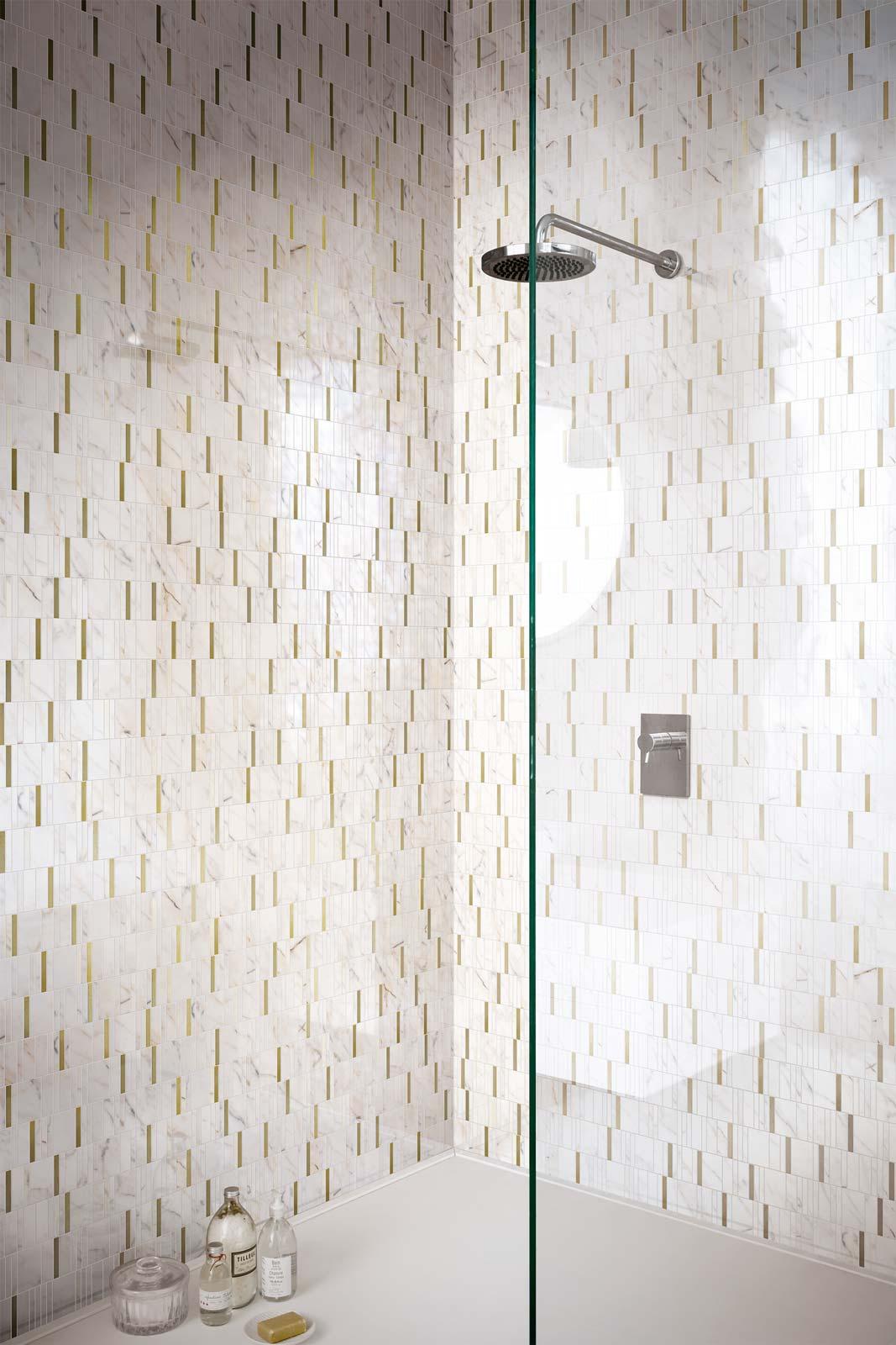 Se nel bagno moderno stile spa si installa una doccia con idromassaggio verticale, per delimitarne il vano, Magnifica di Marazzi propone degli originali mosaici a tessere circolari o a micro-listelli.