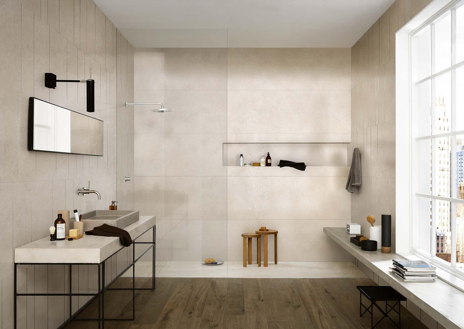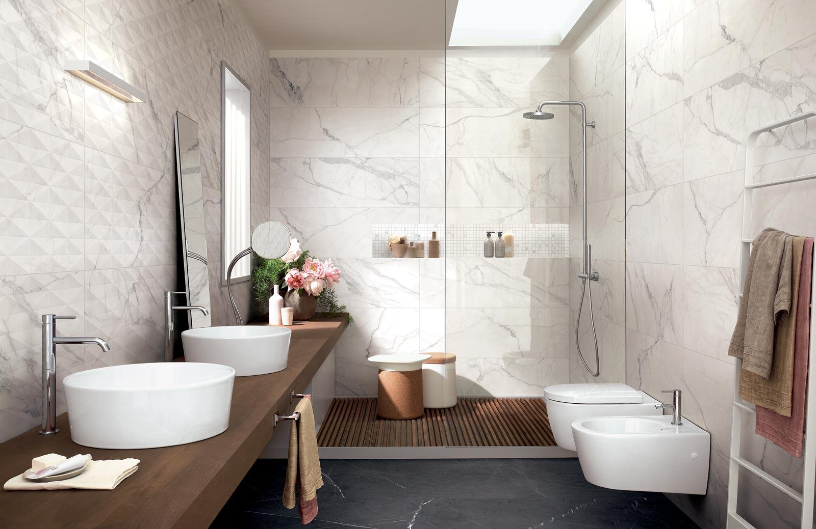 Per le pareti puoi scegliere dei rivestimenti chiari – bianco, dorato o sabbia – oppure tonalità più profonde come il taupe o il grigio scuro quasi nero. Come le piastrelle di grande formato 60×180 cm in ceramica effetto marmo e pietra Magnifica, nella semplicità della texture naturale oppure in versione 3D con righe a rilievo.