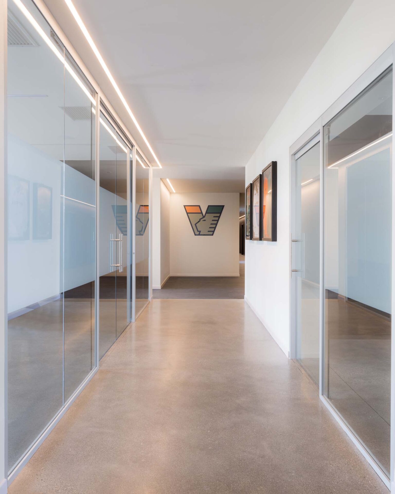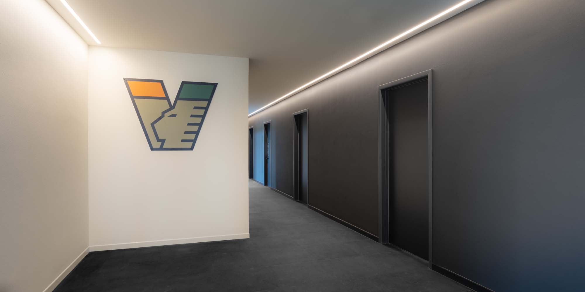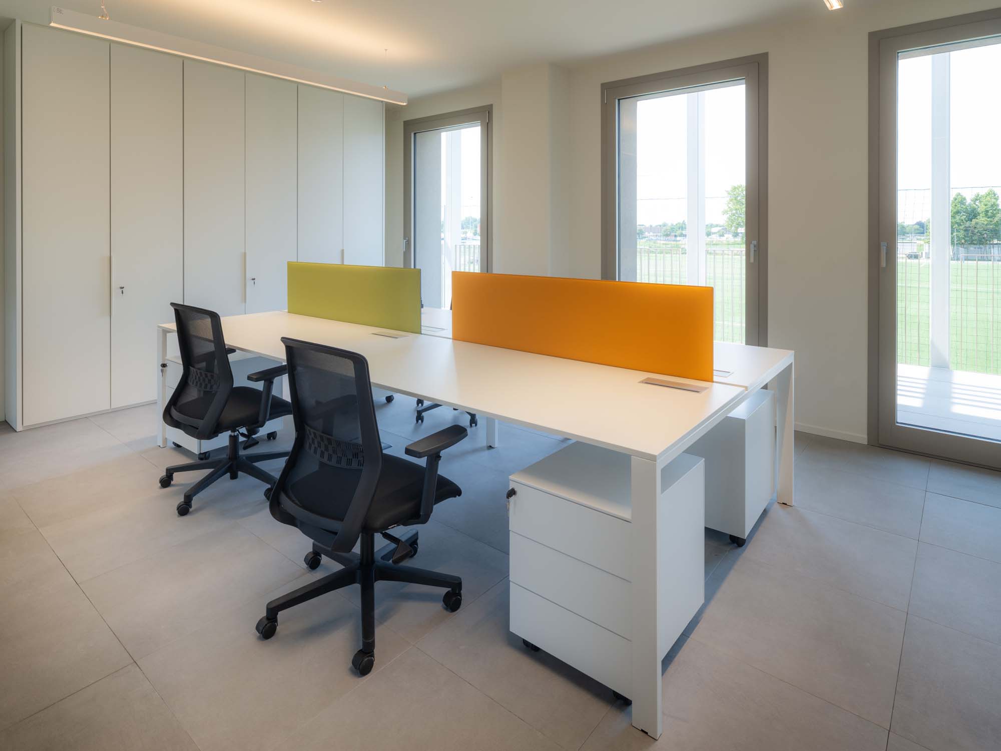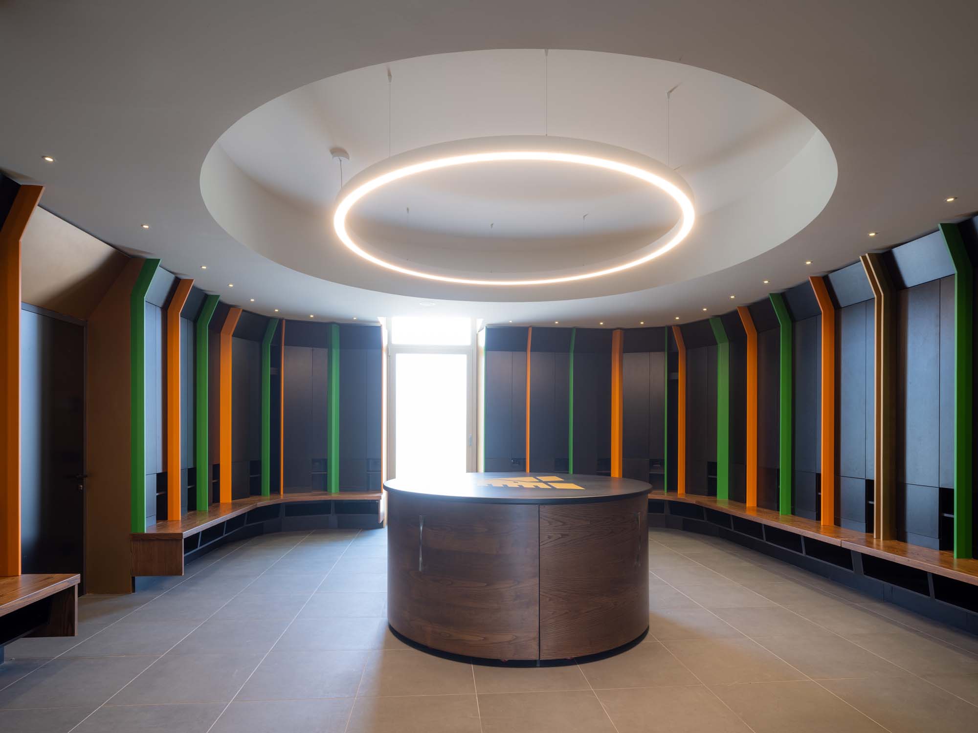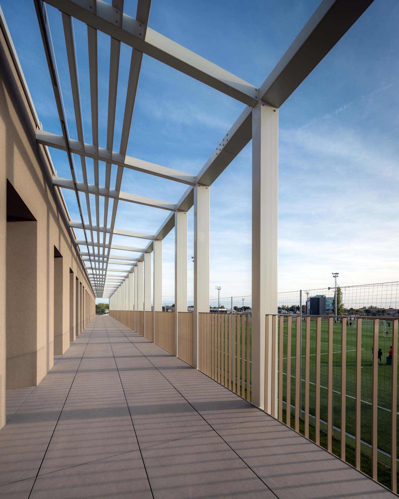 Elemento architettonico distintivo del progetto è il loggiato che circonda l’edificio, offrendo vedute panoramiche dei campi da calcio circostanti. Per gli esterni, i progettisti hanno optato per un pavimento galleggiante usando la stessa collezione effetto cemento nel formato 60×120 cm in versione 20 mm (Cementum20). Il pavimento sopraelevato ha una tecnologia di grande efficacia in quanto permette di creare, sotto la superficie di calpestio, un volume tecnico continuo in cui alloggiare l’impiantistica.