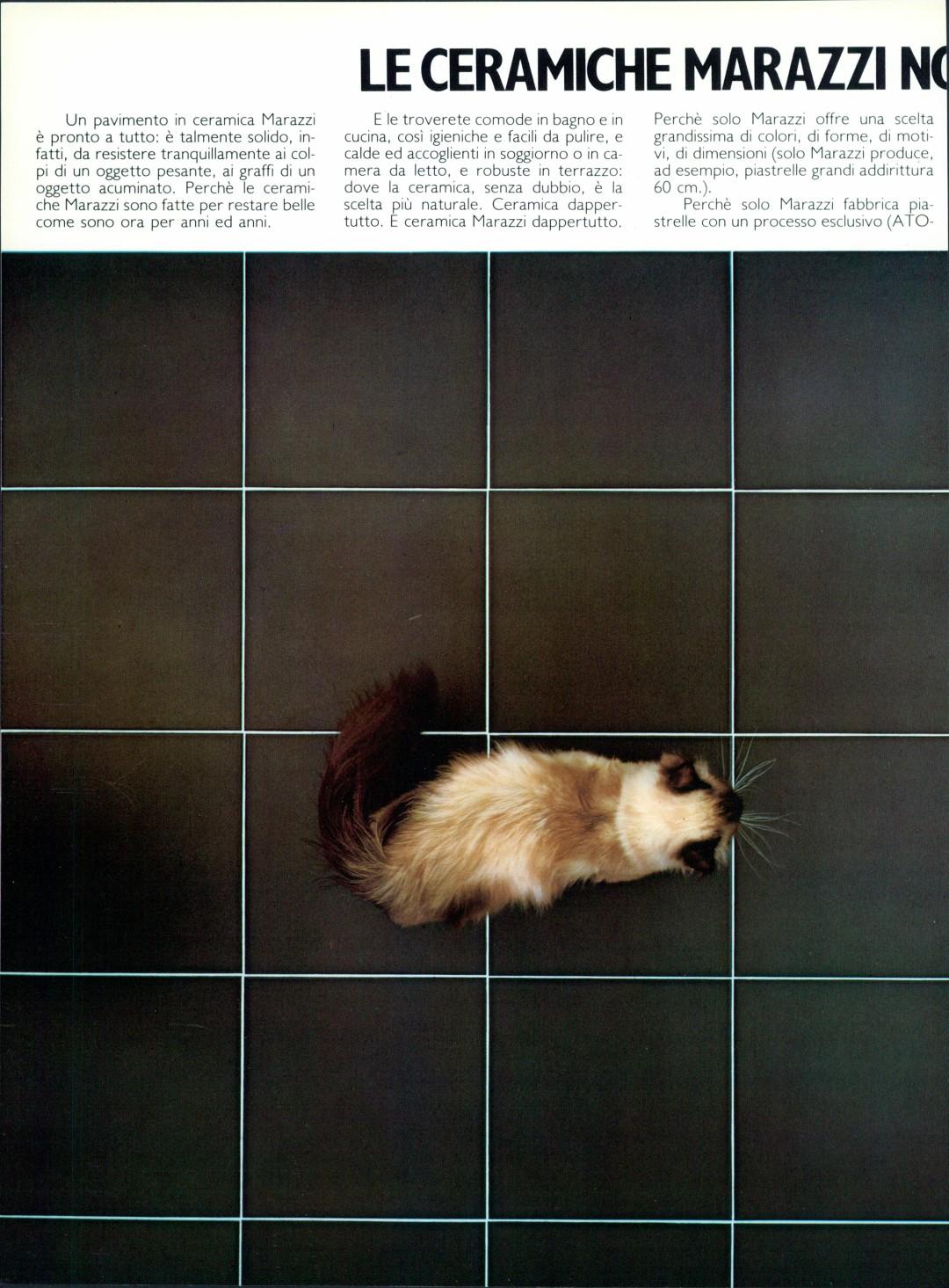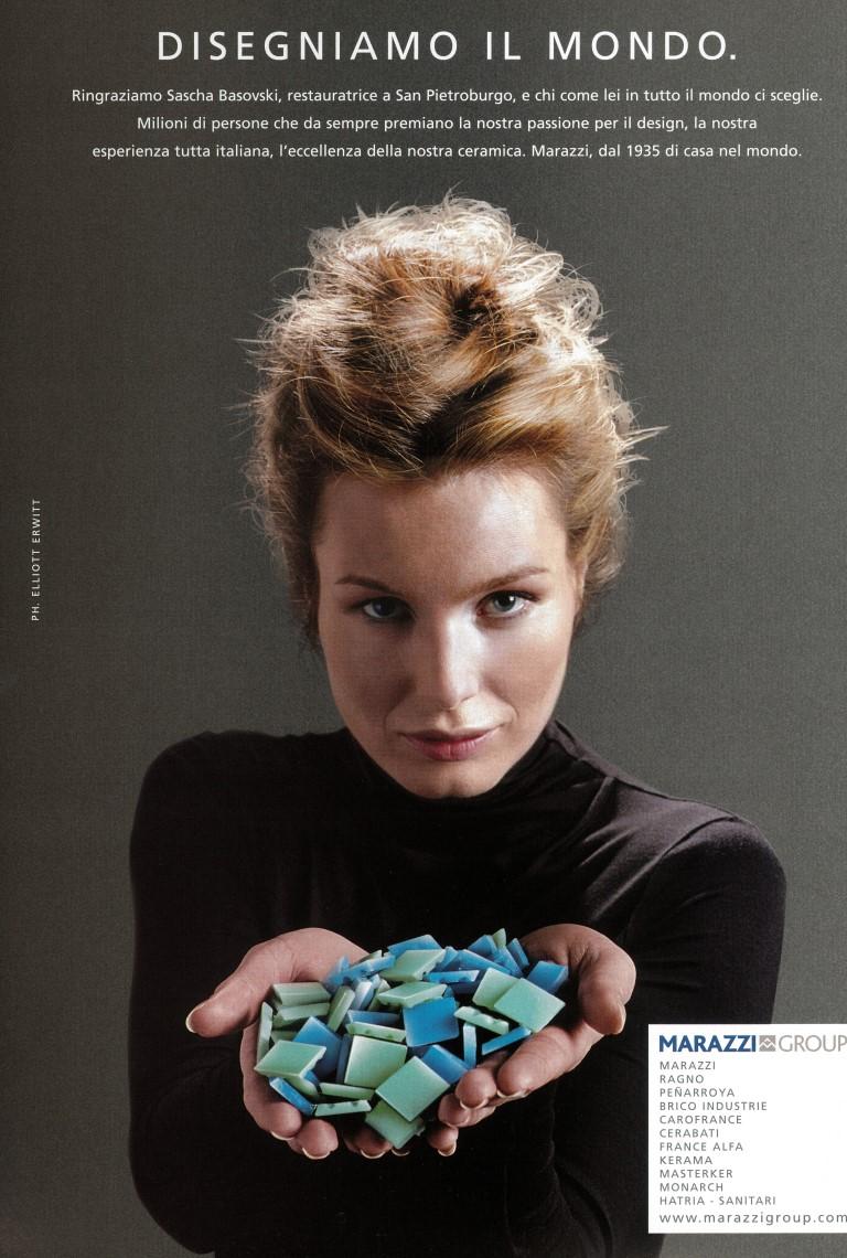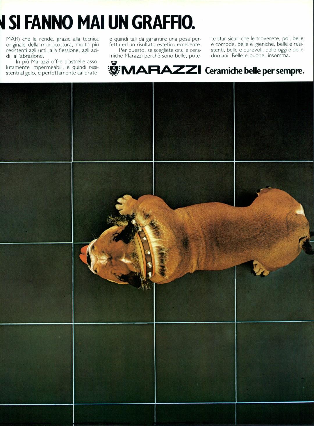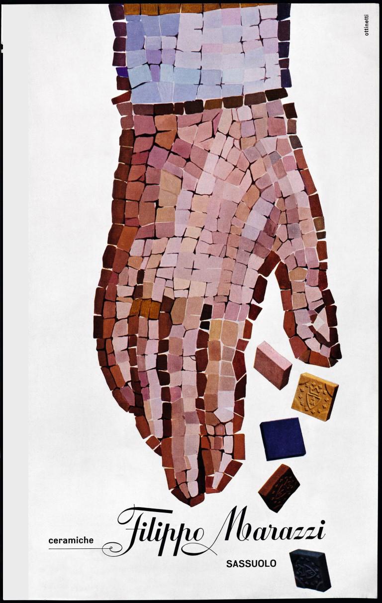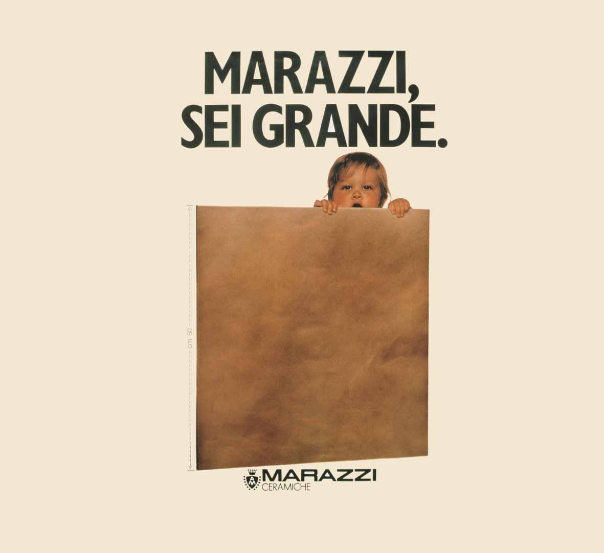Così Piero Ottinetti, già pubblicitario di famosi manifesti per la Pirelli, negli Anni 50 raffigura in una mano le tessere del mosaico 2x2cm, spostando il significato dall'oggetto, il mosaico, al saper-fare di chi lo realizza e promuovendo una comunicazione più metaforica che realistica. Celeberrima la campagna pubblicitaria “Marazzi, sei grande.” del 1975, che gioca sul duplice riferimento al grande formato 60x60cm e all'eccellenza dell'azienda che ha conseguito tale risultato. Come qui si inserisce la figura di un bambino a simboleggiare un nuovo inizio, così nella campagna “Non si fanno mai un graffio.” del 1980, si usano le figure di cane e gatto per conferire l'idea di tenerezza ma anche di prosaicità degli animali domestici. Un'immagine simpatica che cristallizza il concetto di resistenza del materiale.