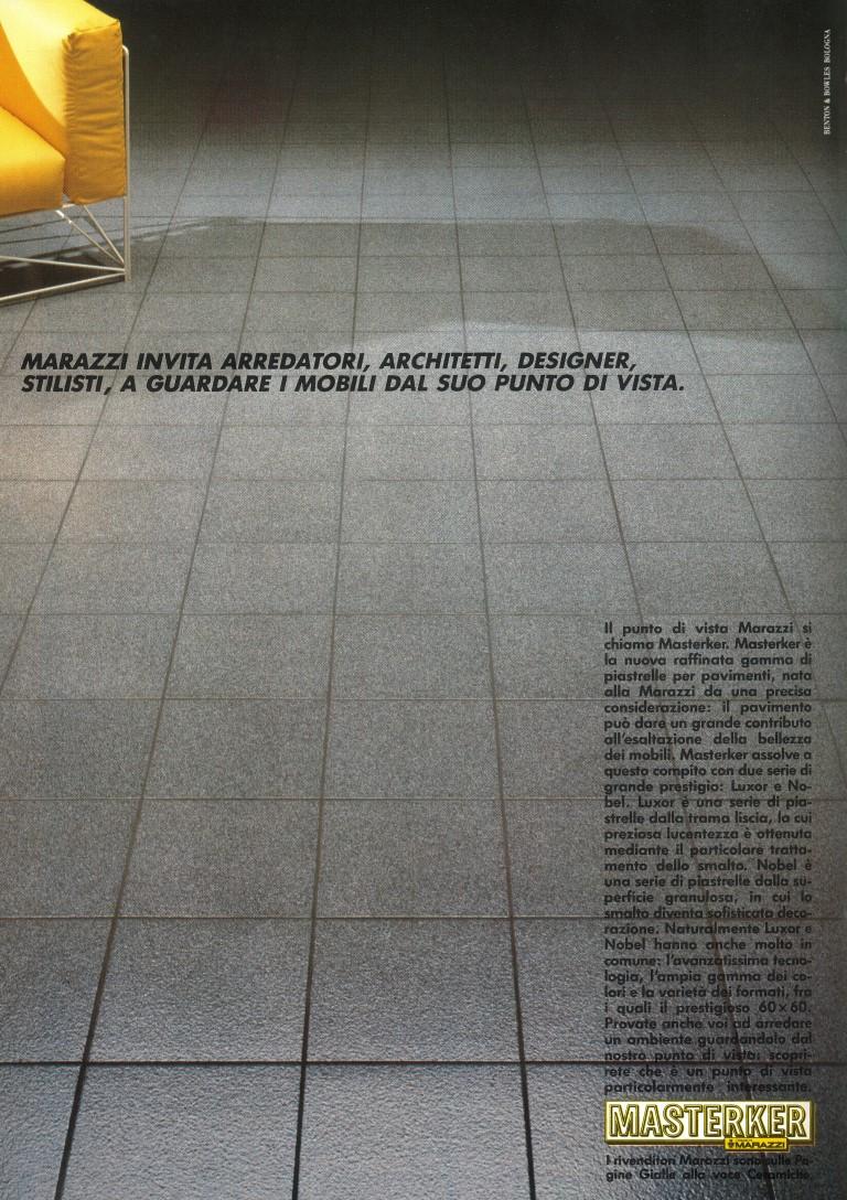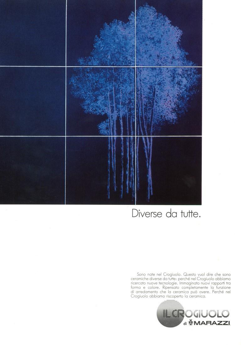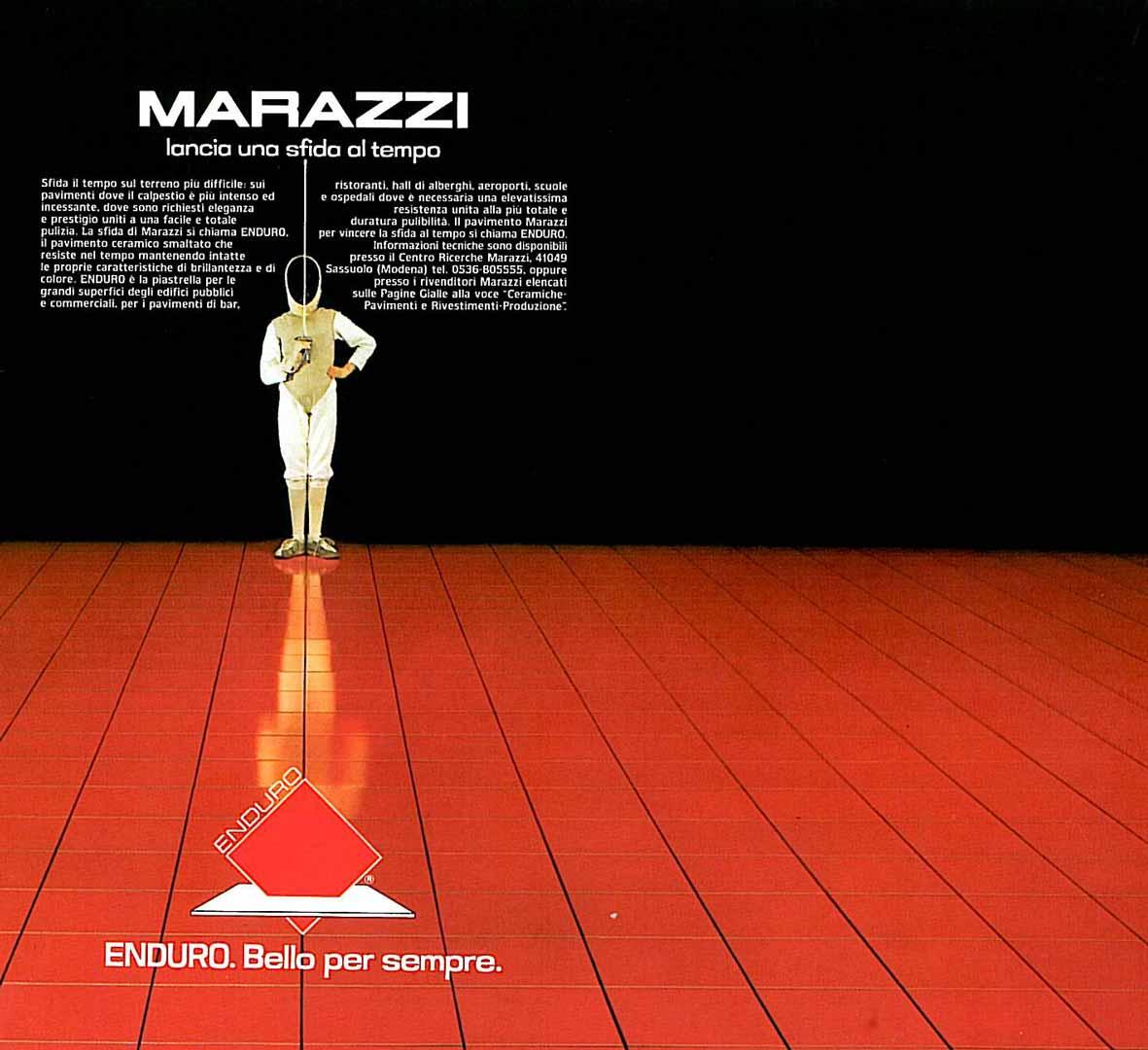 La relazione tra immagine e testo delle campagne pubblicitarie ci riporta lo Zeitgeist, lo spirito del tempo e il relativo rapporto con le parole. Negli Anni 80, descrizioni lunghe e dettagliate come moderni “advertorial” riportano in tono assertivo le caratteristiche tecniche, di manutenzione e di uso dei materiali. Chiamando direttamente in causa il lettore: “Marazzi invita arredatori, architetti, designer, stiliti, a guardare i mobili dal suo punto di vista”, recita la campagna Marazzi Masterker del 1985. E con il “tone of voice” di chi lancia sfide tecnologiche – “Marazzi lancia una sfida la tempo”, claim della campagna “Enduro, Bello per sempre” del 1986 – e di chi ha il coraggio di percorrere strade alternative: “Sono nate nel Crogiuolo. Questo vuol dire che sono ceramiche diverse da tutte: perché nel Crogiuolo abbiamo ricercato nuove tecnologie. Immaginato nuovi rapporti tra forma e colore. Ripensato completamente la funzione di arredamento che la ceramica può avere. Perché nel Crogiuolo abbiamo riscoperto la ceramica”, declama la campagna “Diverse da tutte” de Il Crogiuolo Marazzi del 1982.