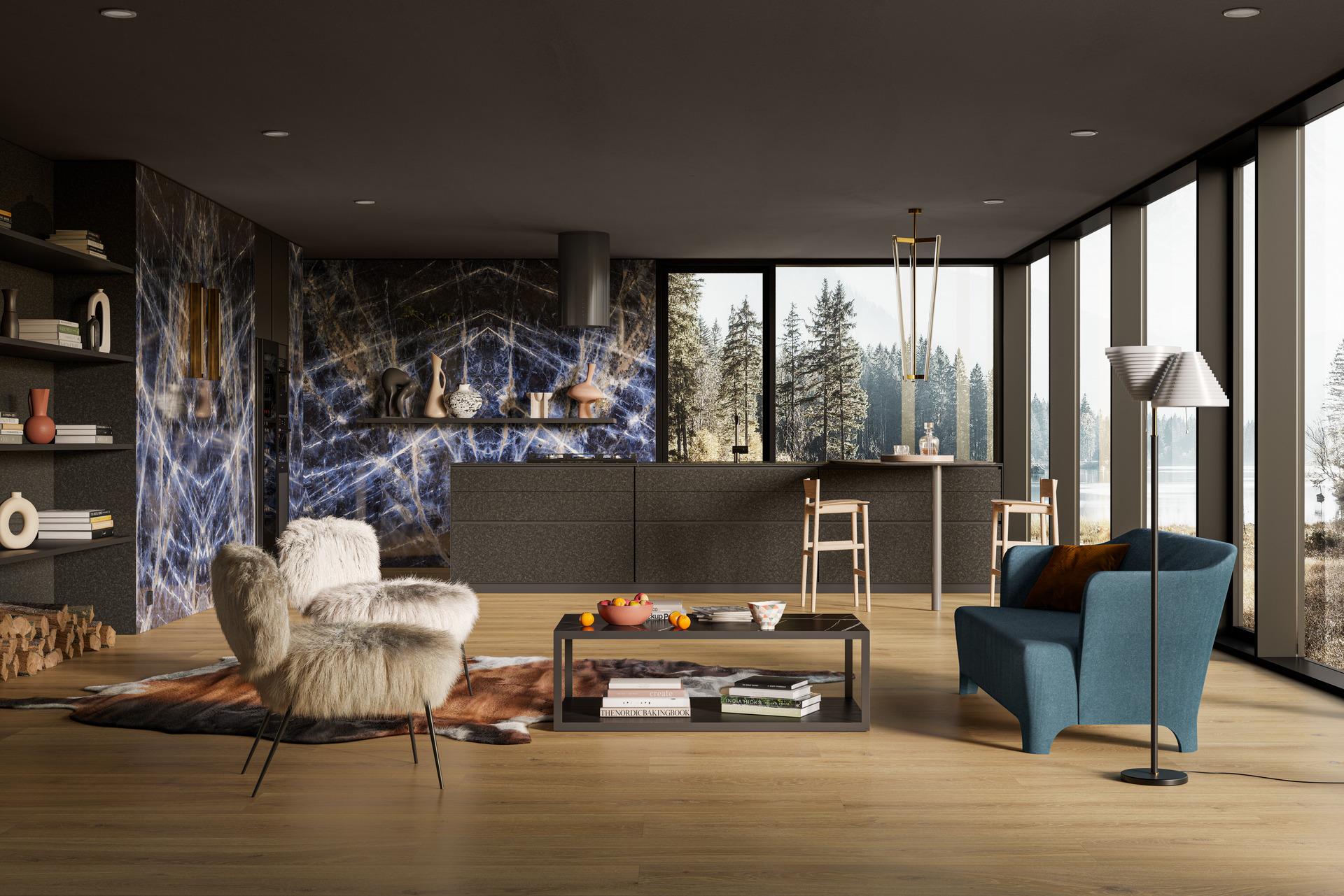 Le sfumature e le venature della collezione Grande Marble Look Sodalite Blu connotano fortemente le pareti d’angolo, quasi a definire un paravento. A pavimento torna la tattilità e la perfetta rispondenza alle essenze lignee della serie Oltre, nella tonalità Sand. Non meno importante il blocco della cucina e il suo top, entrambi rivestiti dalle lastre di Grande Stone Look Granito Black 12 mm, nella finitura Satin; in contrasto con la quinta in Sodalite Blu.