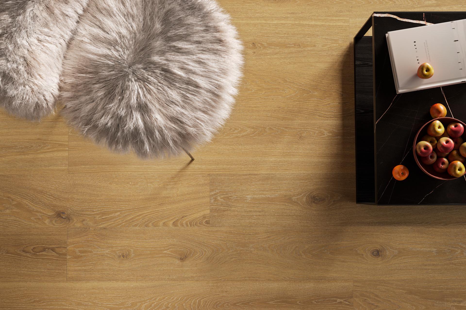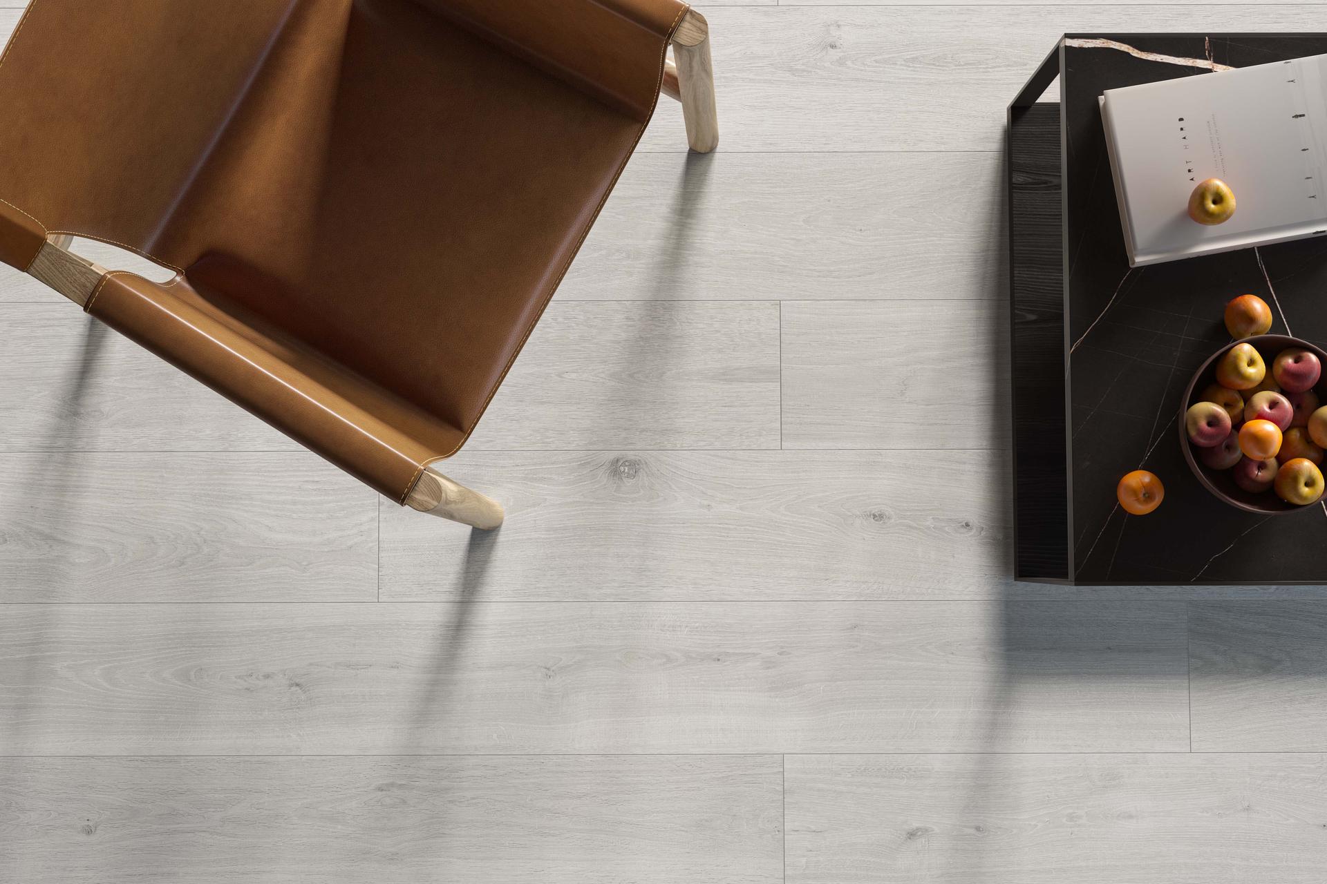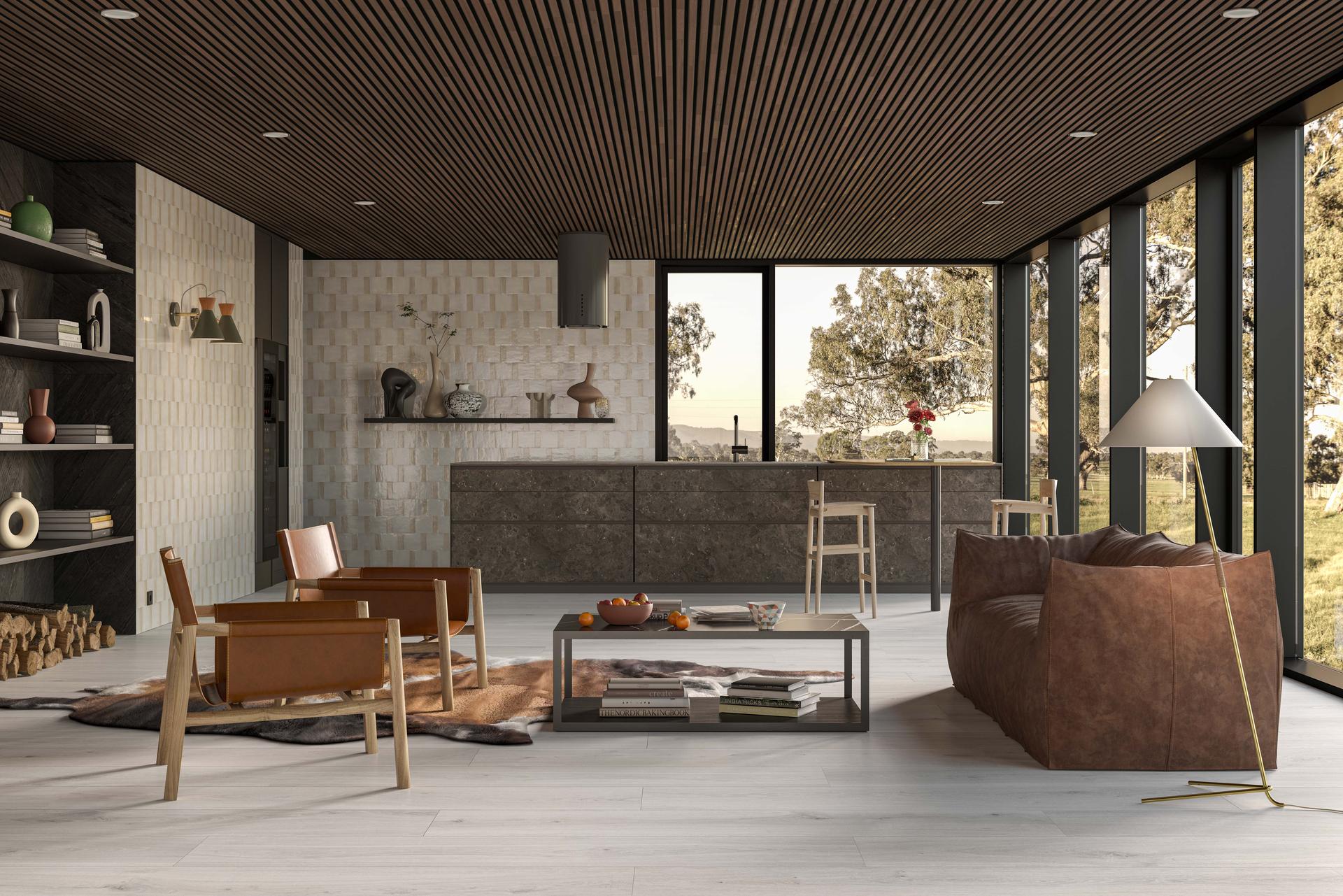 I piccoli formati di Crogiolo Rice, Naturale e Bianco Lux, sono posati a parete. A pavimento il legno di Oltre, nella colorazione White, la più chiara a catalogo. Le lastre di Grande Stone Look, Gris du Gent, nella finitura Satin, completano il Top e il rivestimento del blocco cucina.