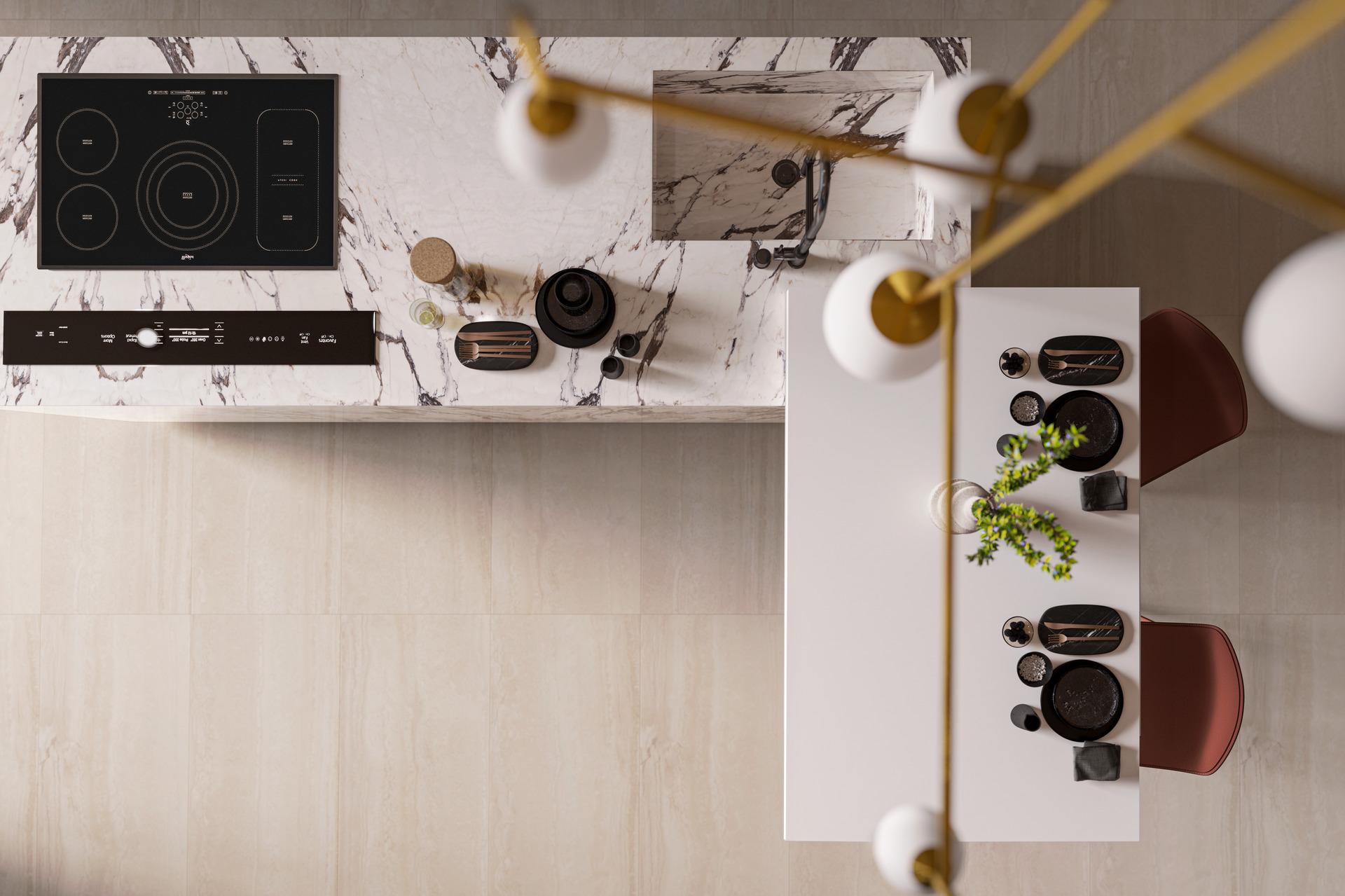 Grande Marble Look Capraia si conferma la soluzione per il rivestimento del blocco cucina e del top, mentre per il tavolo snack si è scelta la morbidezza della linea Grande Solid Color Look White Satin, nello spessore dei 12 mm.