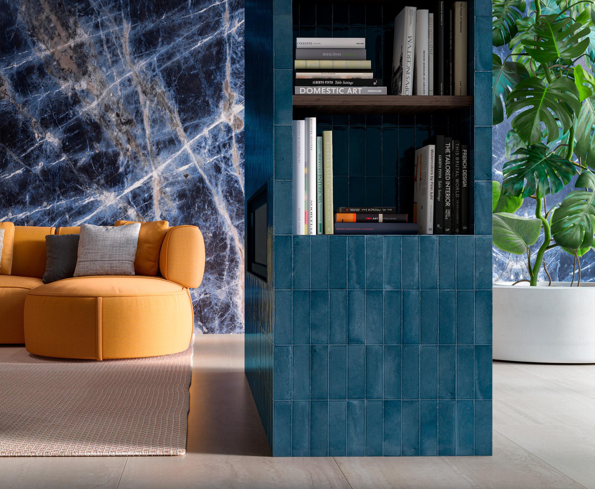 La serie Mystone Travertino Navona completa le superfici dell’ampio pavimento e delle pareti, dove si fanno largo le sorprendenti sfumature e venature delle lastre di Grande Marble Look Sodalite Blu.