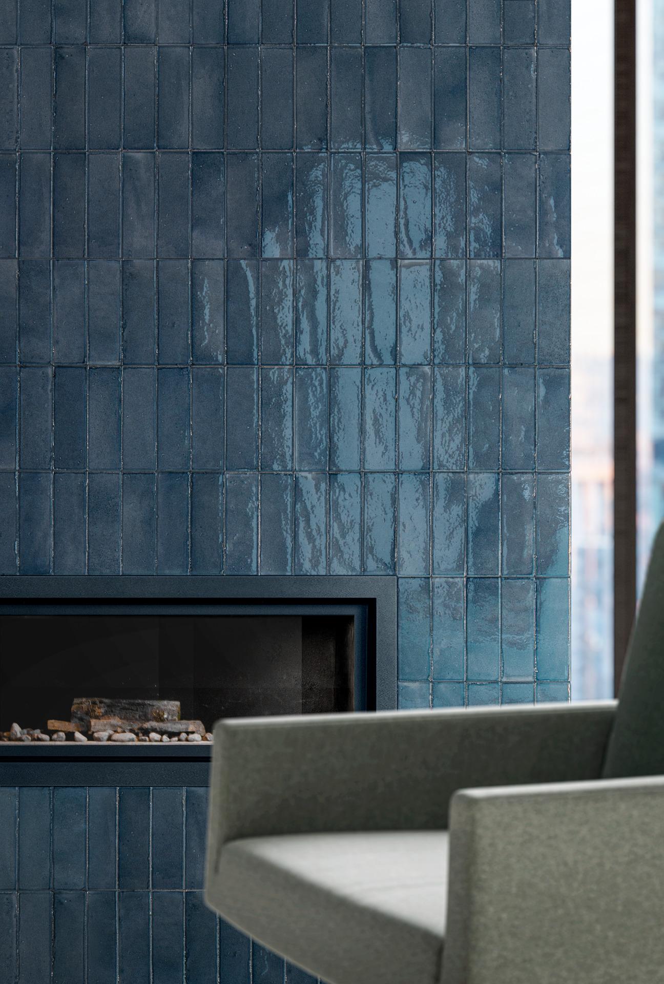 Nella prima versione torna il colore. Lo smalto morbido che ricorda le maioliche fatte a mano delle tessere di Crogiolo Rice, in colore Blue, e nella finitura Lux, rivestono il camino.