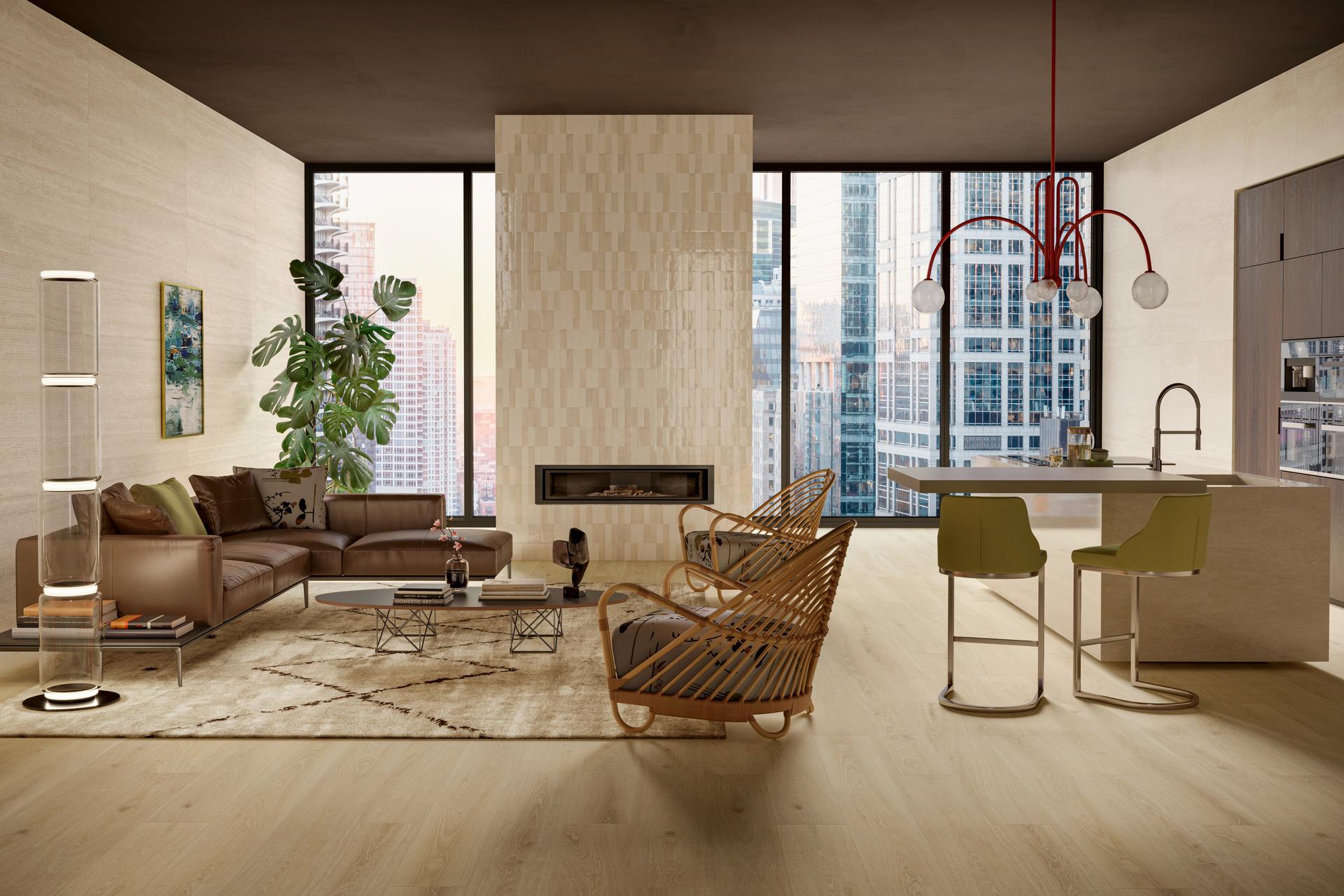 Questa tipologia abitativa è stata di ispirazione per la preview nella quale, con un gusto contemporaneo, si declina in due versioni un grande spazio living con un ampio affaccio sulla città. Uno spazio moderno dove il grande camino diventa elemento centrale di congiunzione tra l’area relax e lo spazio funzionale della cucina che vi si affaccia.