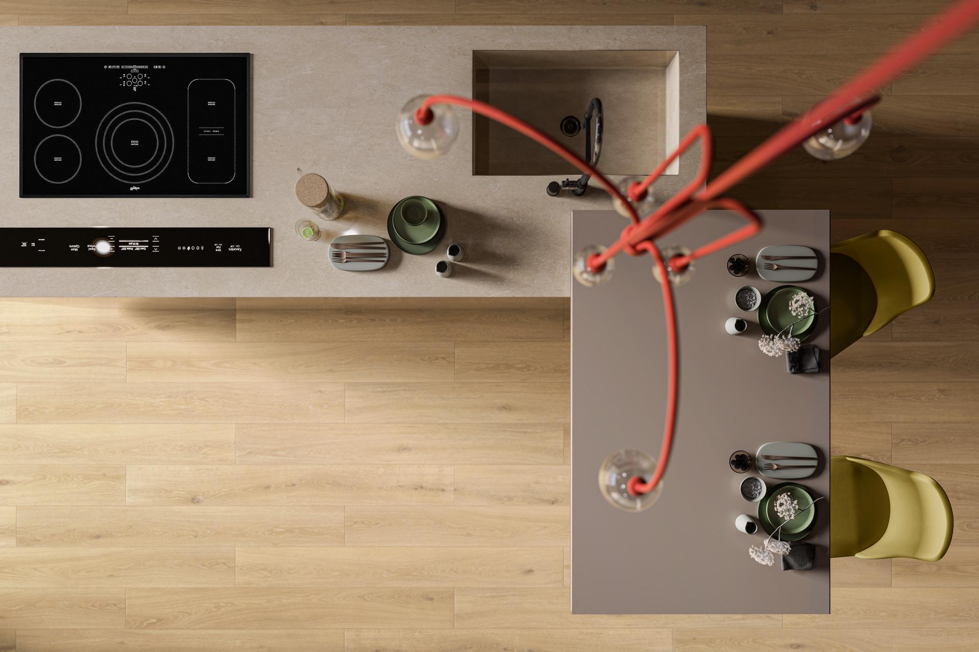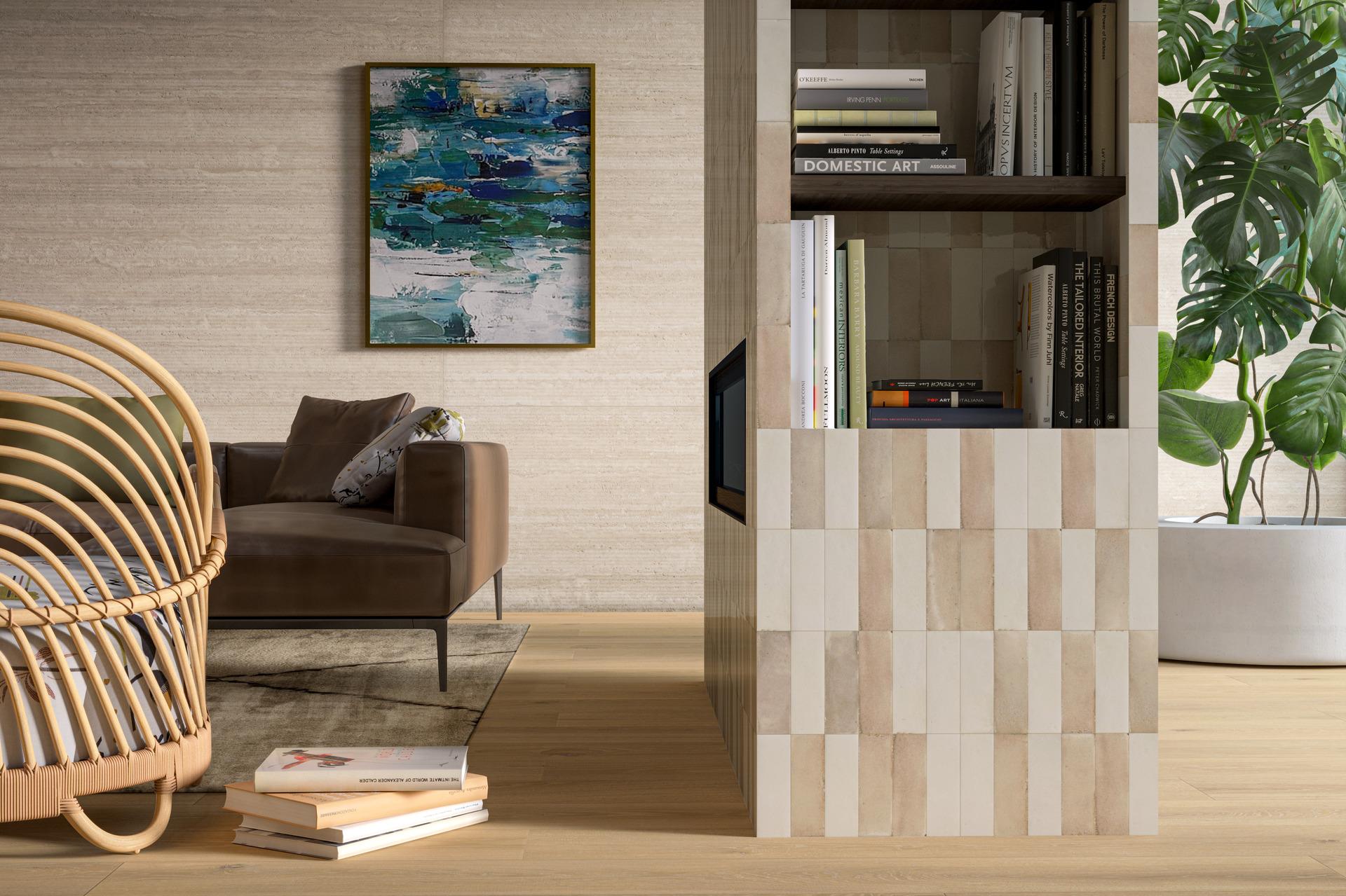 Le lastre Mystone Travertino Classico, che si presenta nella finitura 3D, sono posate a parete e la suggestione, anche tattile, del legno di Oltre, nella colorazione Sand, definisce l’ampia superficie della pavimentazione. In accordo con le tonalità chiare dell’interior design, il blocco della cucina e il Top sono rivestiti dalla texture litica di Grande Stone Look Limestone, nella colorazione Sand.