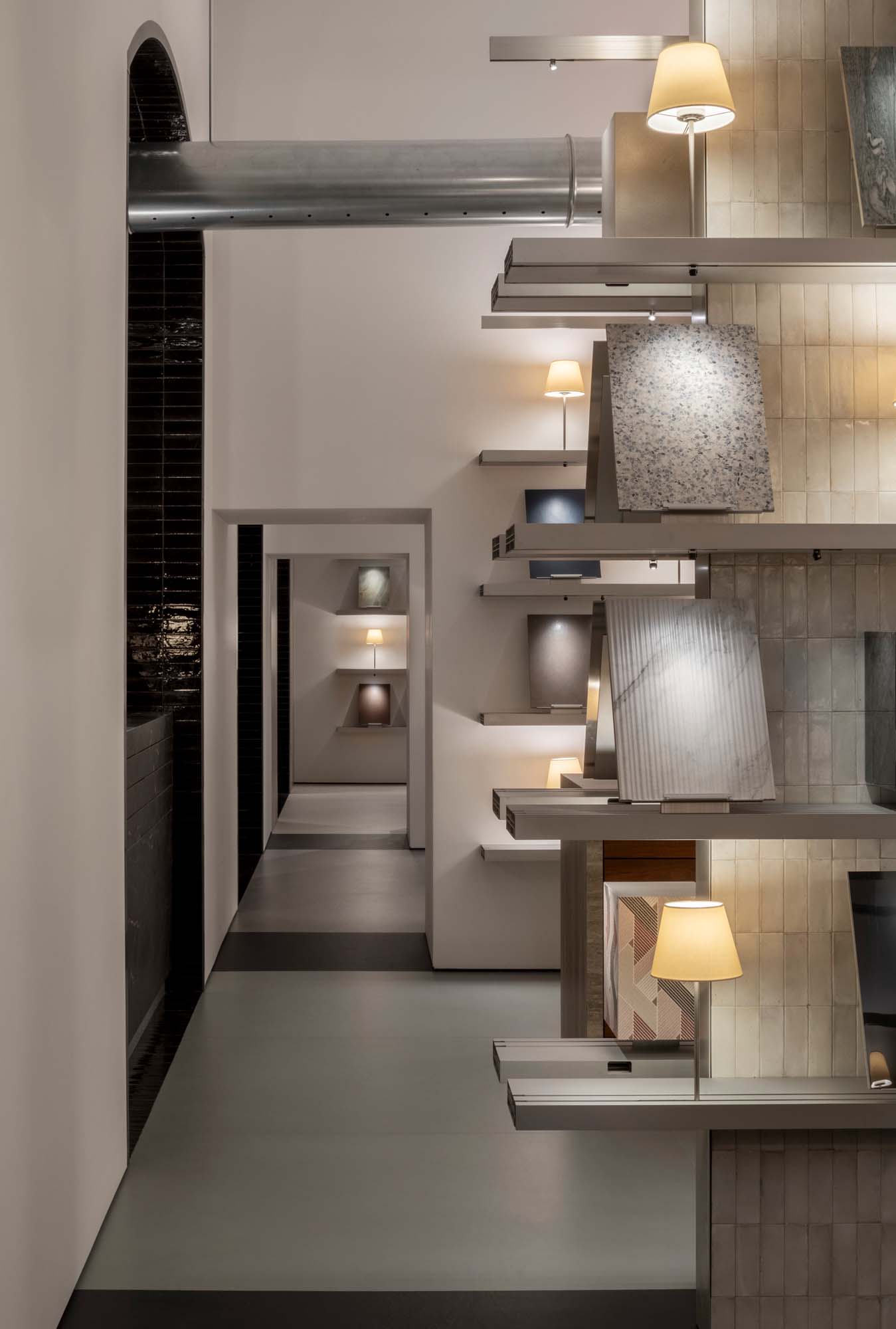 Ogni stanza tematica offre un’esperienza unica che mette in risalto l’eccellenza dei materiali. Le maxi lastre, disposte come ricchi tappeti orientali, sono accuratamente illuminate per esaltarne la bellezza, così come le mensole museali che espongono una selezione esclusiva di finiture, superfici e colori e trasformano lo spazio espositivo in una wunderkammer di colori e materiali, che evoca lavorazioni artigianali, marmi pregiati, intarsi elaborati e strutture tridimensionali.