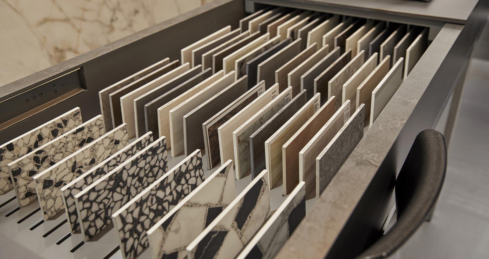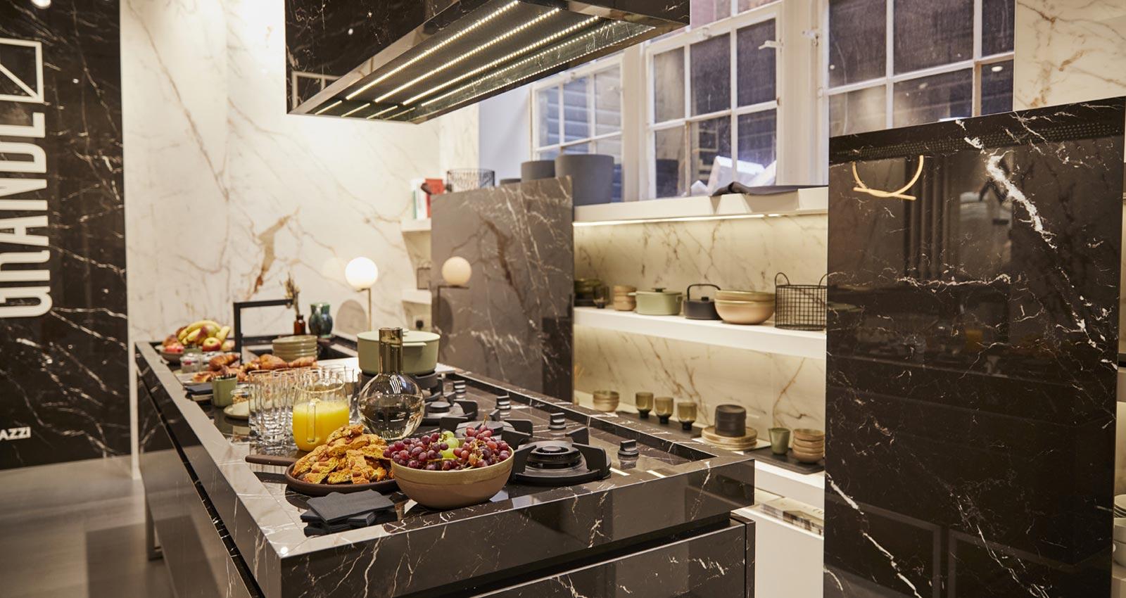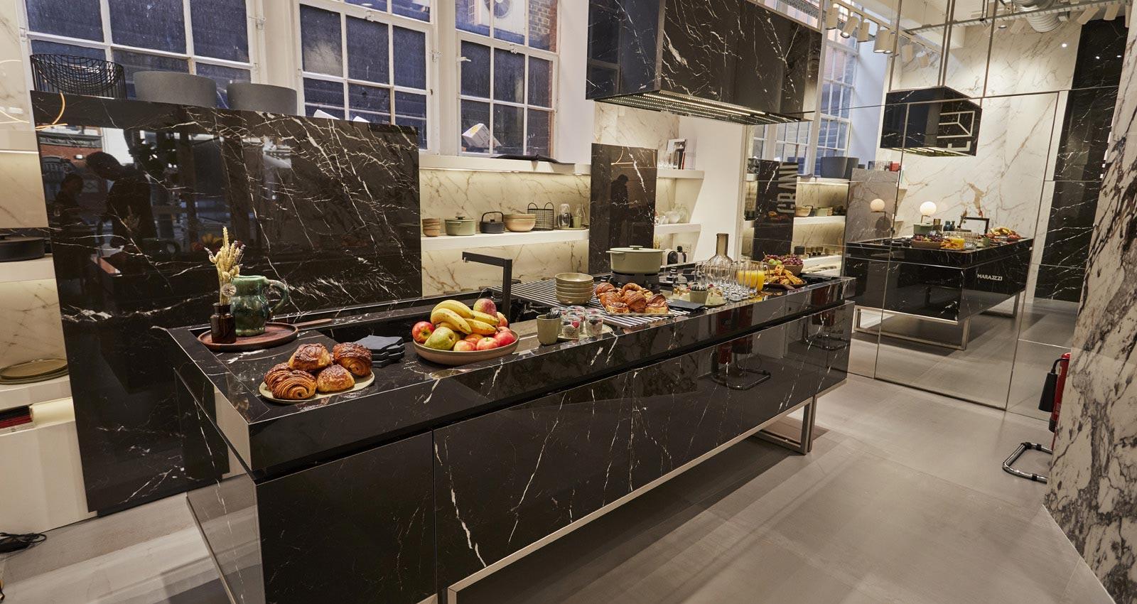 I piani dell’area cucina che arreda il nuovo spazio sono completamente realizzati con le lastre Grande Marble Look Elegant Black della nuova linea The Top, grandi lastre in gres porcellanato contraddistinte da superfici matt, satinate e lucide di estrema raffinatezza destinate alla progettazione di top, backsplash, tavoli, ante e infinite opzioni di arredo tailor made per spazi residenziali e commerciali.