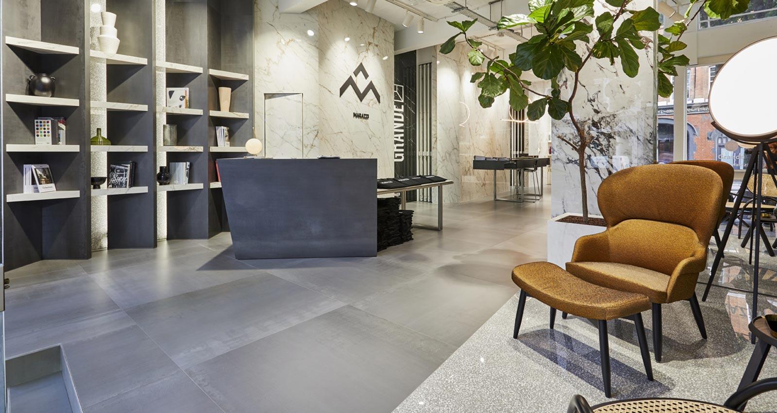 Marazzi, leader internazionale nel design e nella produzione di piastrelle di ceramica, ridisegna il suo showroom londinese, inaugurato nel 2017 nel cuore di Clerkenwell, per la presentazione delle nuove lastre extra large della collezione Grande e delle soluzioni The Top, pensate per piani cucina, tavoli, top bagno ed elementi d’arredo.