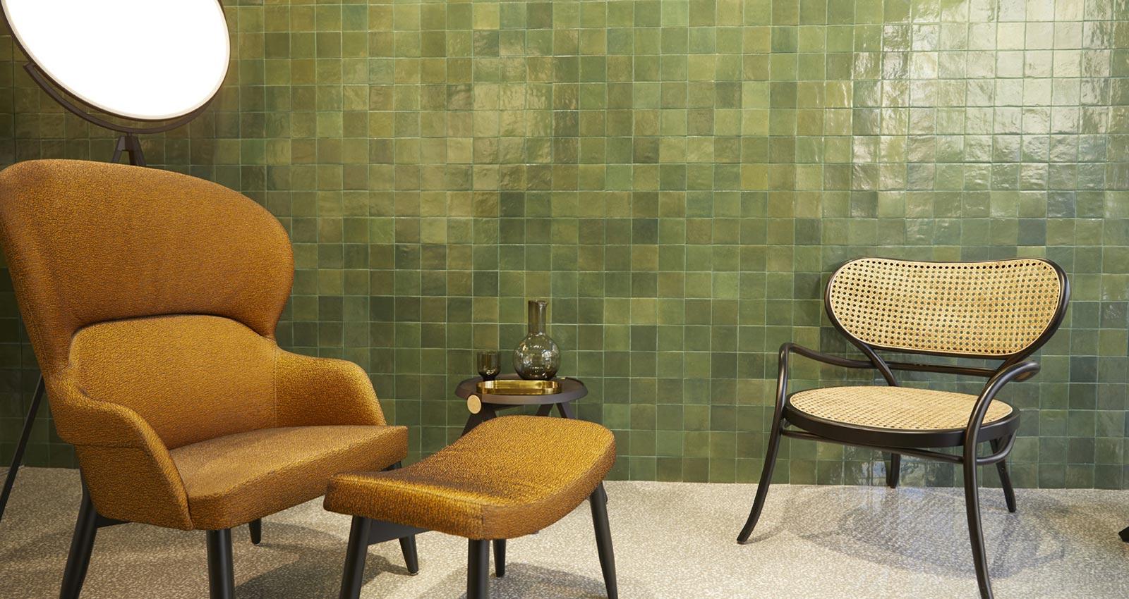 All’ingresso, spicca la superficie lucida e il sorprendente effetto handmade delle piastrelle Zellige della nuovissima collezione “Crogiolo”, la ricerca di Marazzi sull’artigianato industriale che riscopre la bellezza della ceramica autentica, colorata, decorata, frutto dell’incontro tra sapere artigianale e tecnologia industriale.