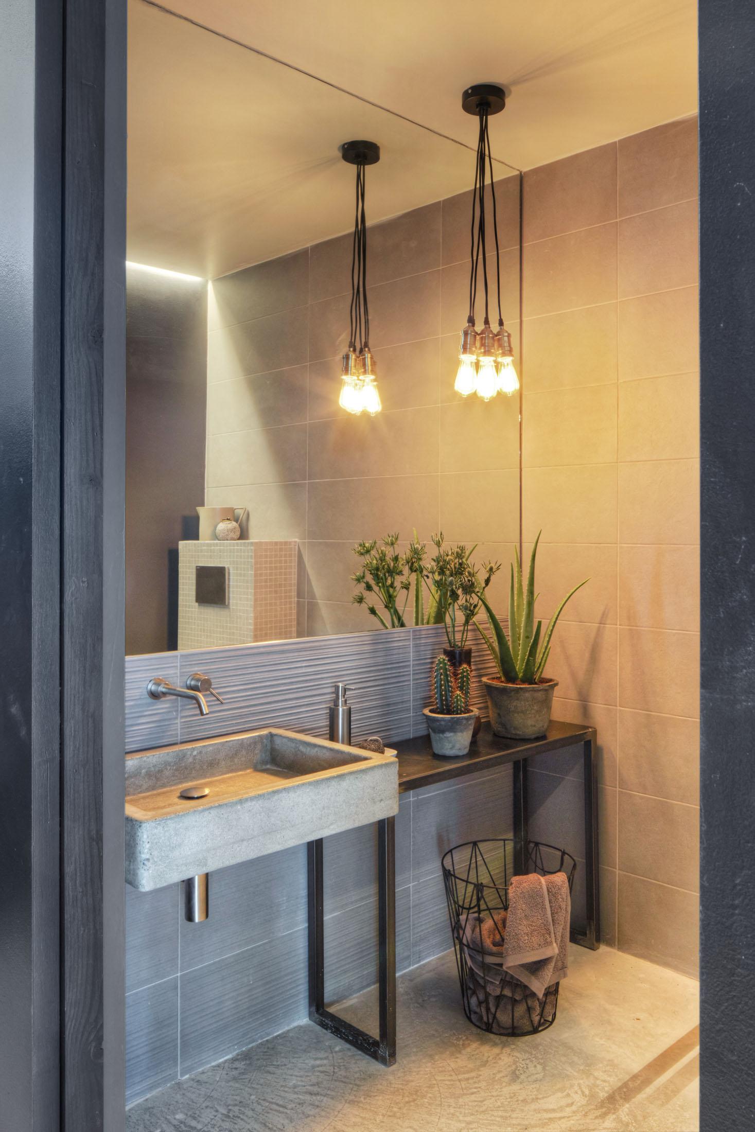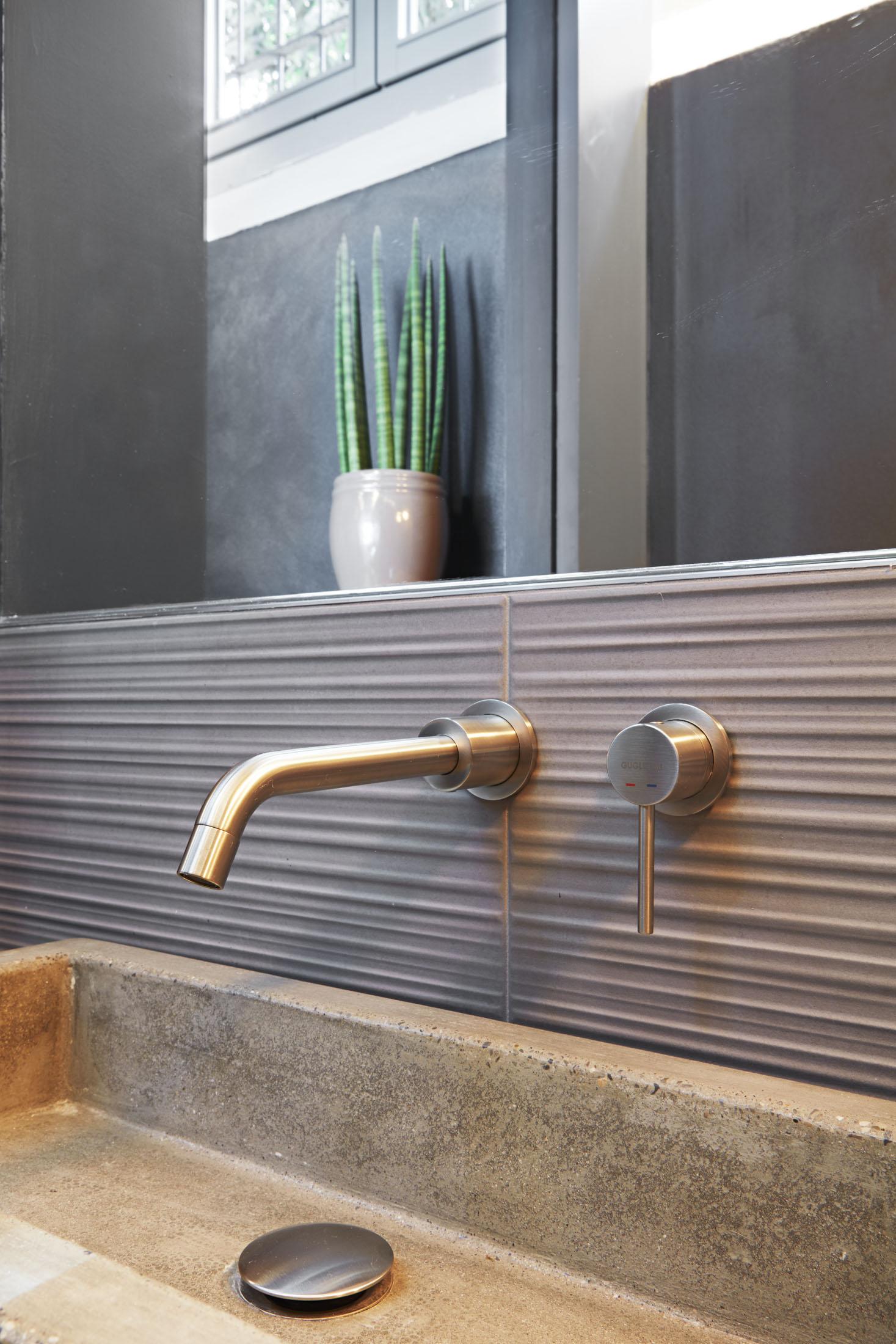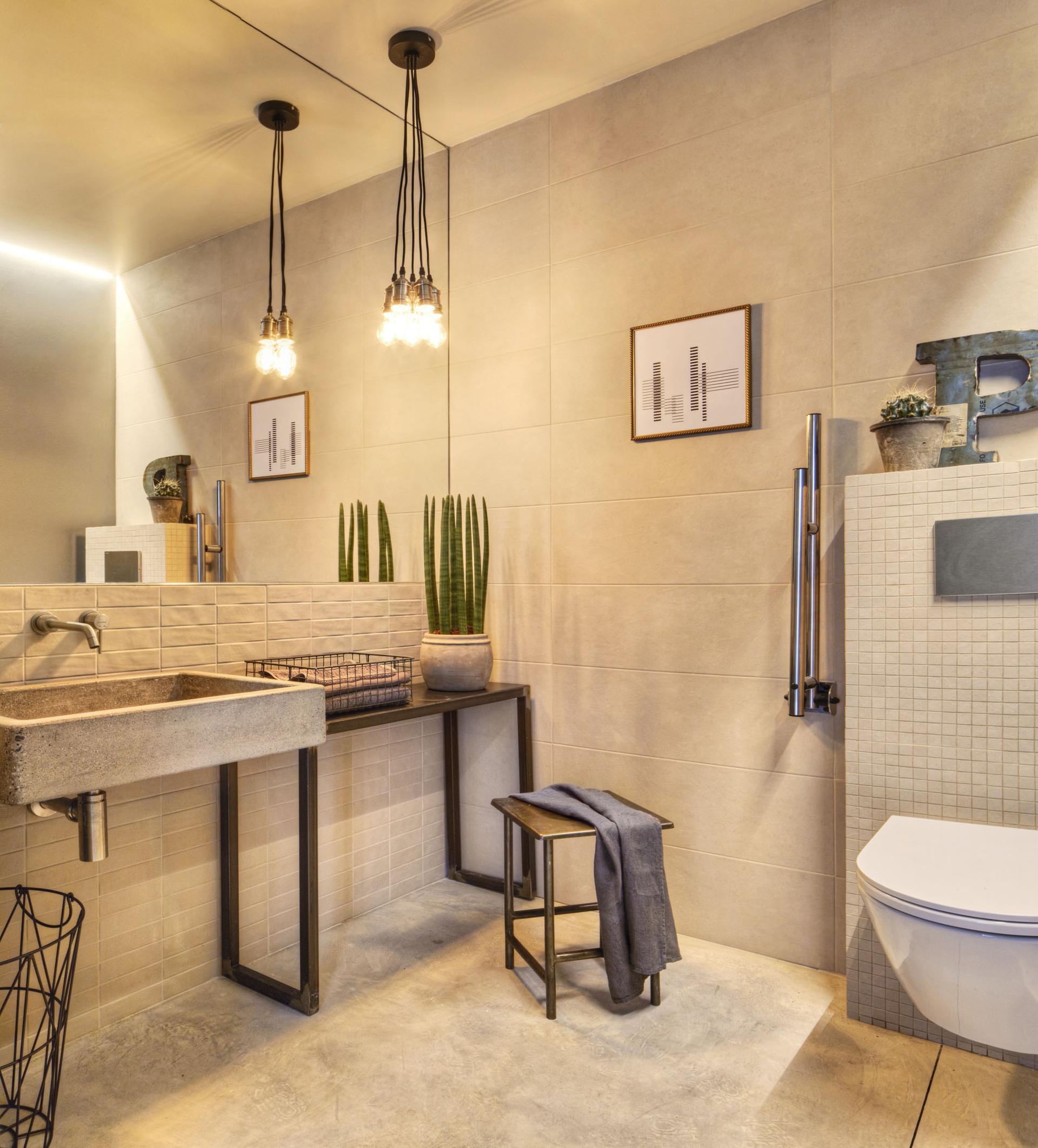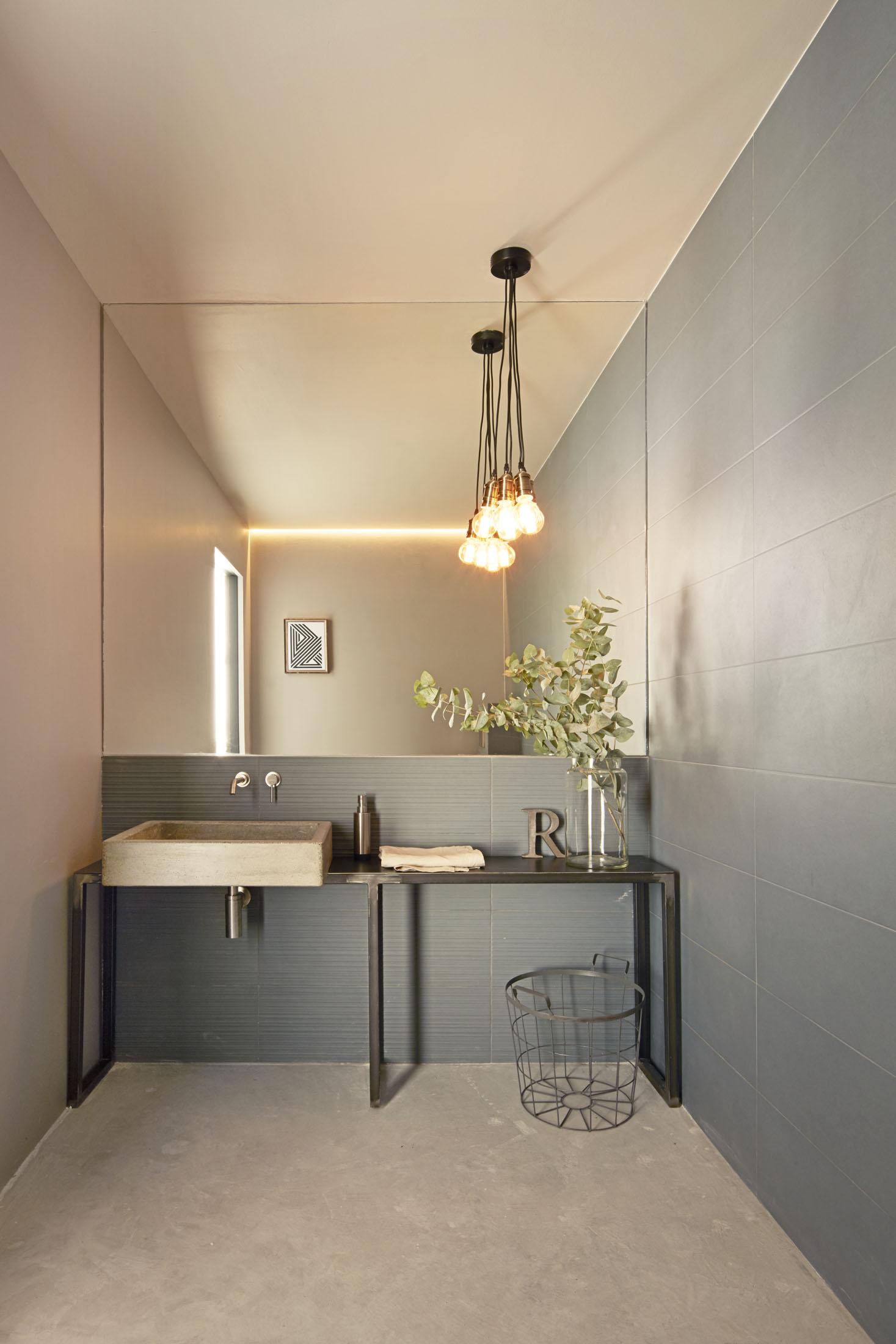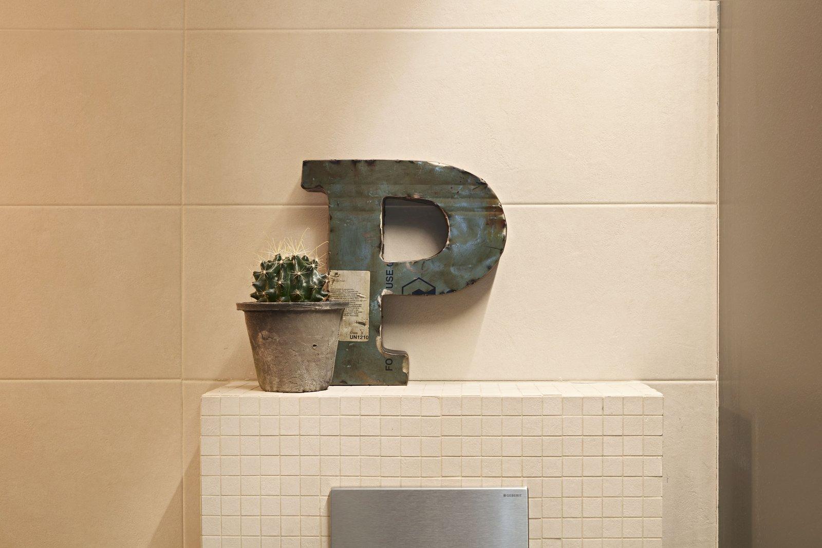 Il progetto dei bagni ha mantenuto il carattere industriale, semplice e rigoroso dell'intero complesso, anche nella scelta dei rivestimenti ceramici. La collezione effetto cemento Chalk di Marazzi, nei colori Smoke, Avio e Sand, con le due strutture 3D Fiber e Brick, e' stata posata in orizzontale sulle pareti per conferire agli spazi, in se' molto contenuti, ordine e profondità sfruttando anche l’effetto chiaro-scuro del 3D. Il mosaico Chalk, negli stessi colori, e' stato utilizzato a rivestimento del volume quadrato che funge da schienale per il sanitario.