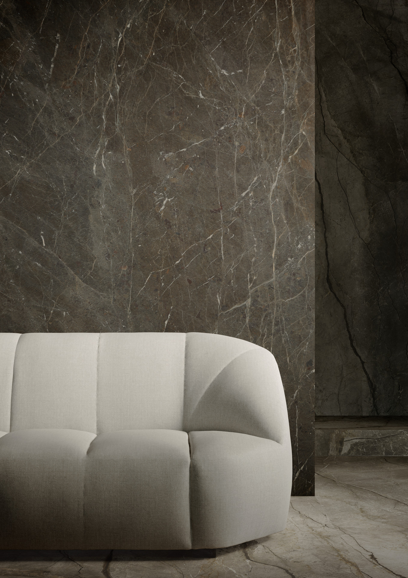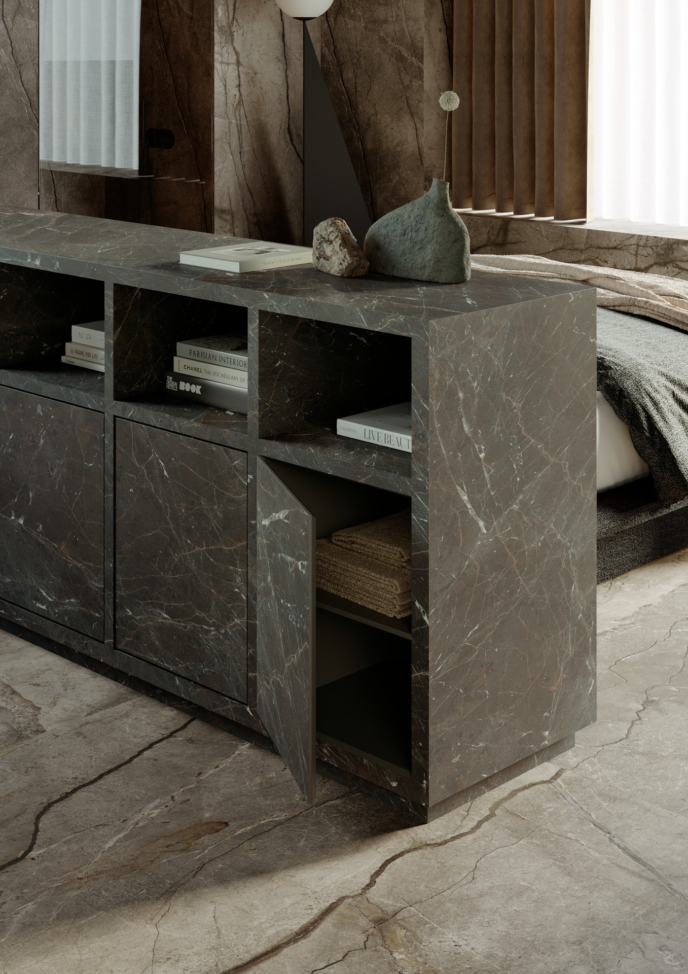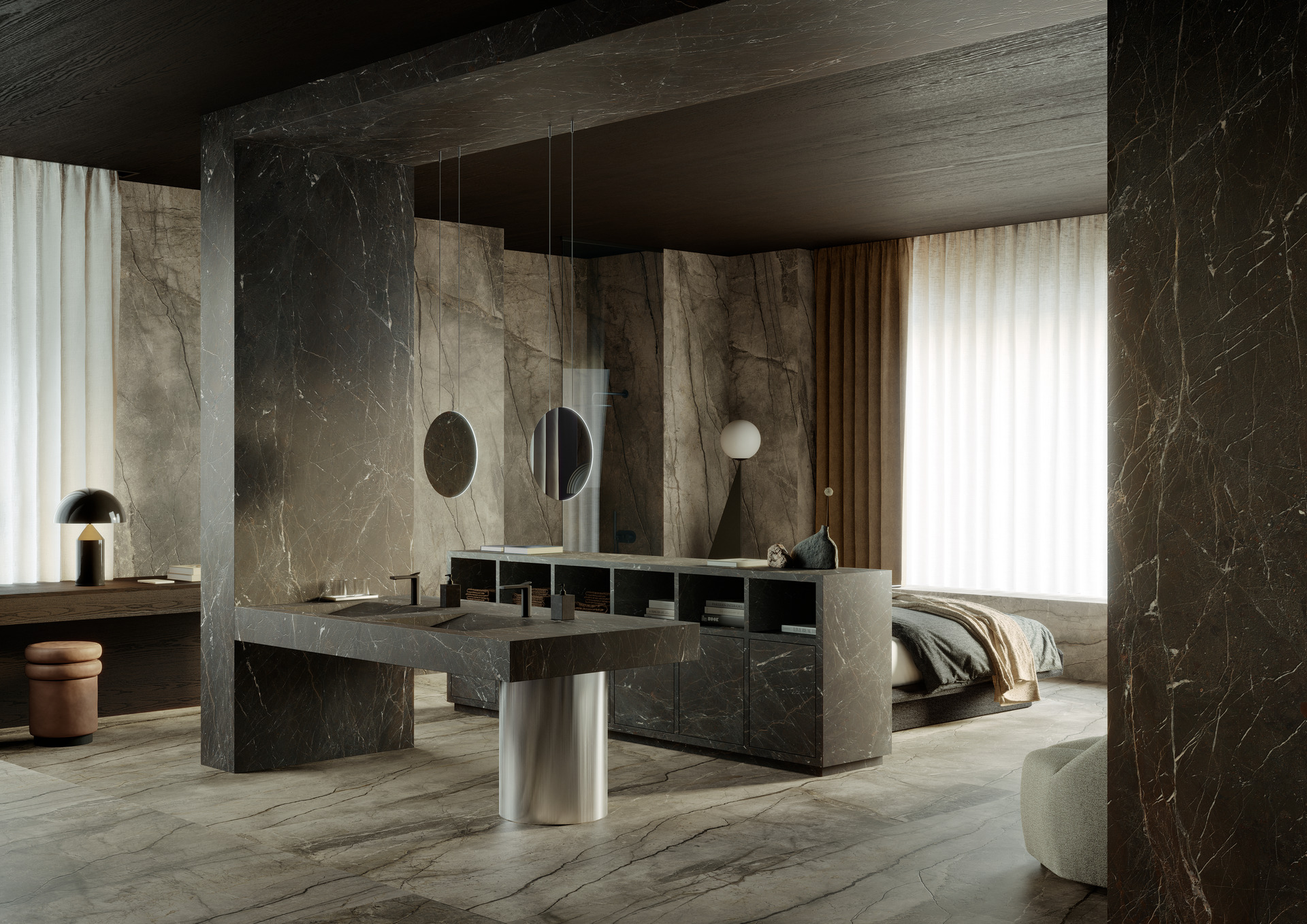 Il progetto mostra la versatilità espressiva del grande formato: l’ambiente privo di una successione di stanze, come nelle suite tradizionali, presenta un open space con aree funzionali – il living, la zona notte e il bagno – che si compenetrano osmoticamente. Questa progressione di ambienti è orchestrata proprio grazie all’uso dei materiali: se il Silver Root è estesamente impiegato nelle pareti perimetrali e a pavimento, il Breccia Imperiale è utilizzato nell’area bagno e nel suo mobile contenitore, che è anche la testiera del letto, creando una sorta di quinta tridimensionale che circoscrive la zona nell’ambiente aperto. Il tono più scuro del gres porcellanato viene a racchiudere la funzione più privata del bagno. Per questo specifico utilizzo le lastre The Top Breccia Imperiale sono trattate con la Premium Technology Puro Marazzi Antibacterial, che consente di eliminare dalla superficie fino al 99,9% batteri e altri microrganismi nocivi.