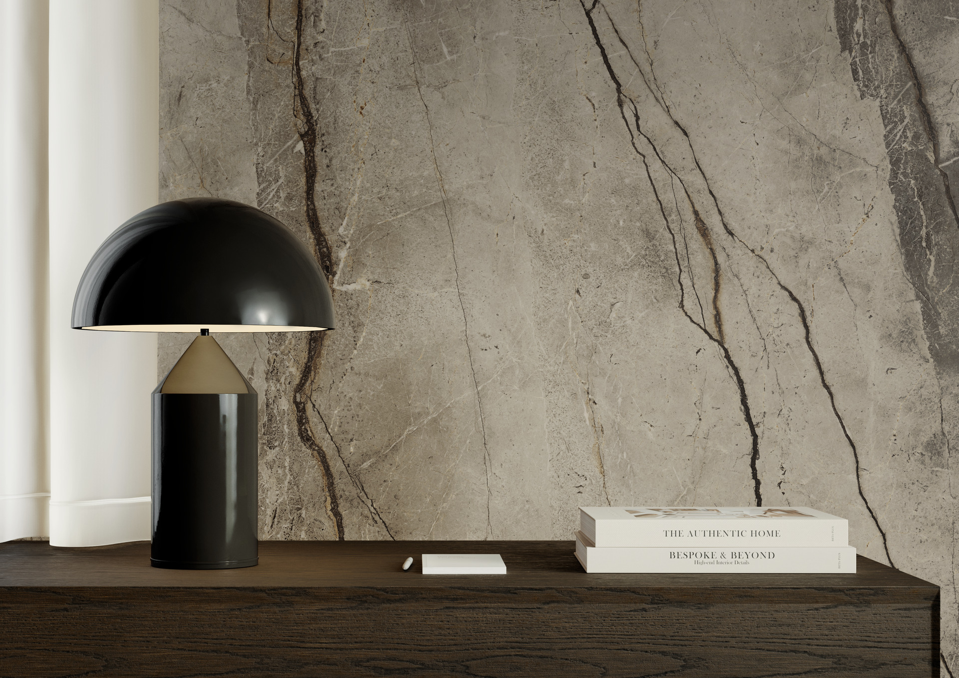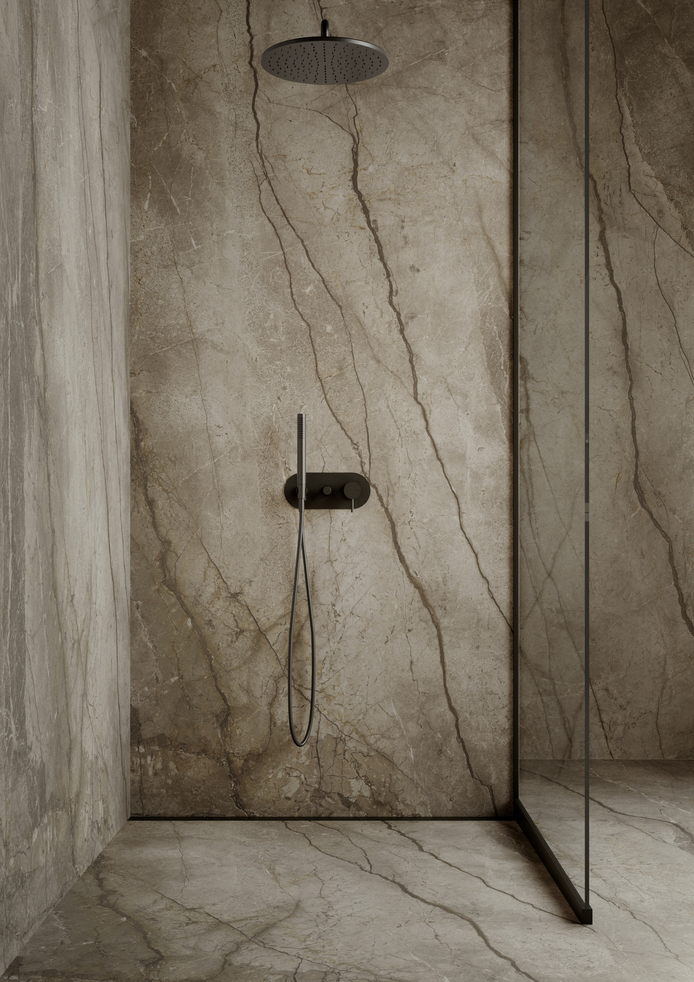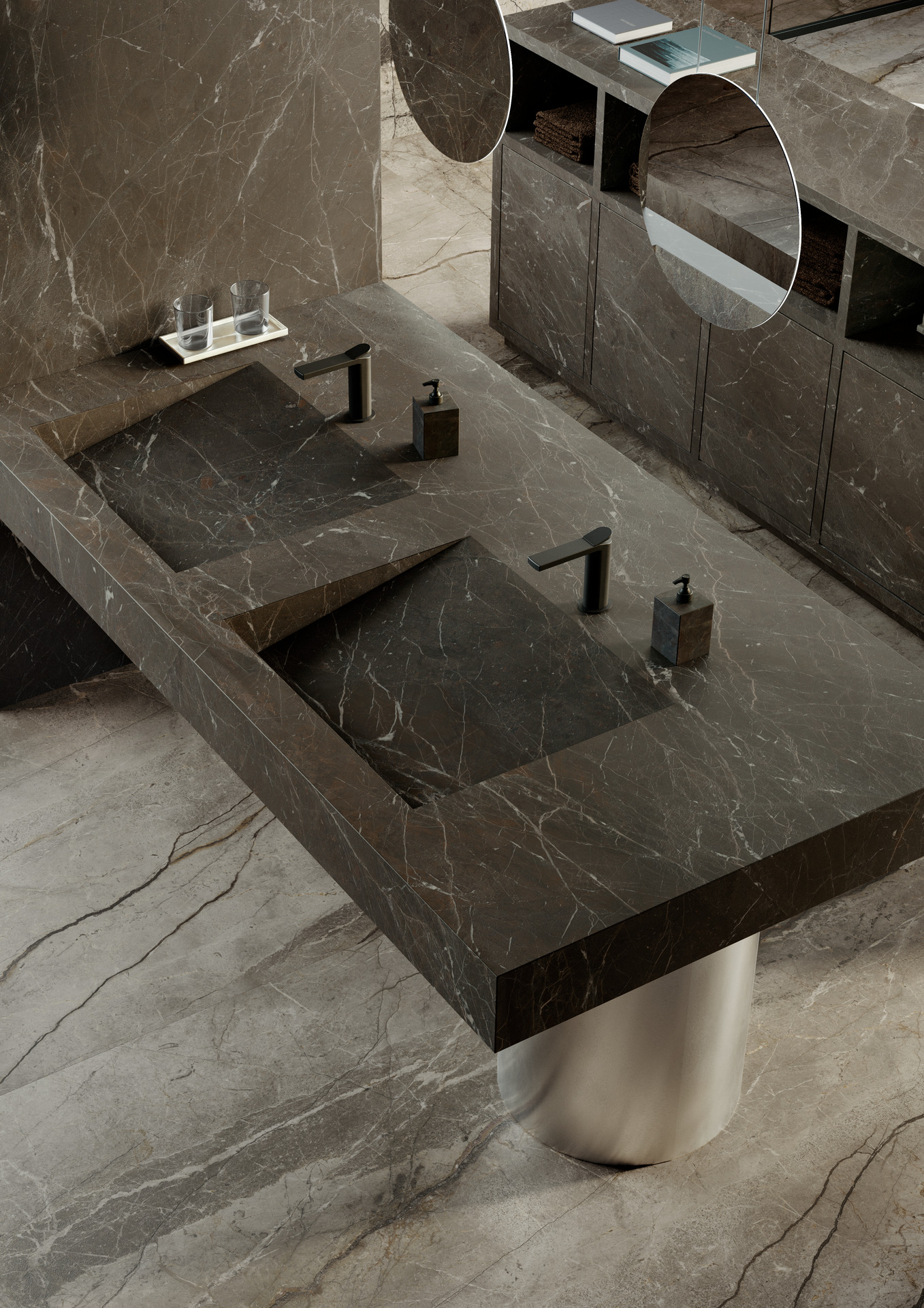 Il progetto mostra la versatilità espressiva del grande formato: l’ambiente privo di una successione di stanze, come nelle suite tradizionali, presenta un open space con aree funzionali – il living, la zona notte e il bagno – che si compenetrano osmoticamente. Questa progressione di ambienti è orchestrata proprio grazie all’uso dei materiali: se il Silver Root è estesamente impiegato nelle pareti perimetrali e a pavimento, il Breccia Imperiale è utilizzato nell’area bagno e nel suo mobile contenitore, che è anche la testiera del letto, creando una sorta di quinta tridimensionale che circoscrive la zona nell’ambiente aperto. Il tono più scuro del gres porcellanato viene a racchiudere la funzione più privata del bagno. Per questo specifico utilizzo le lastre The Top Breccia Imperiale sono trattate con la Premium Technology Puro Marazzi Antibacterial, che consente di eliminare dalla superficie fino al 99,9% batteri e altri microrganismi nocivi.