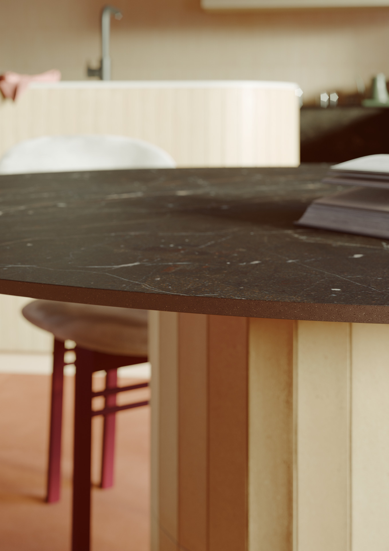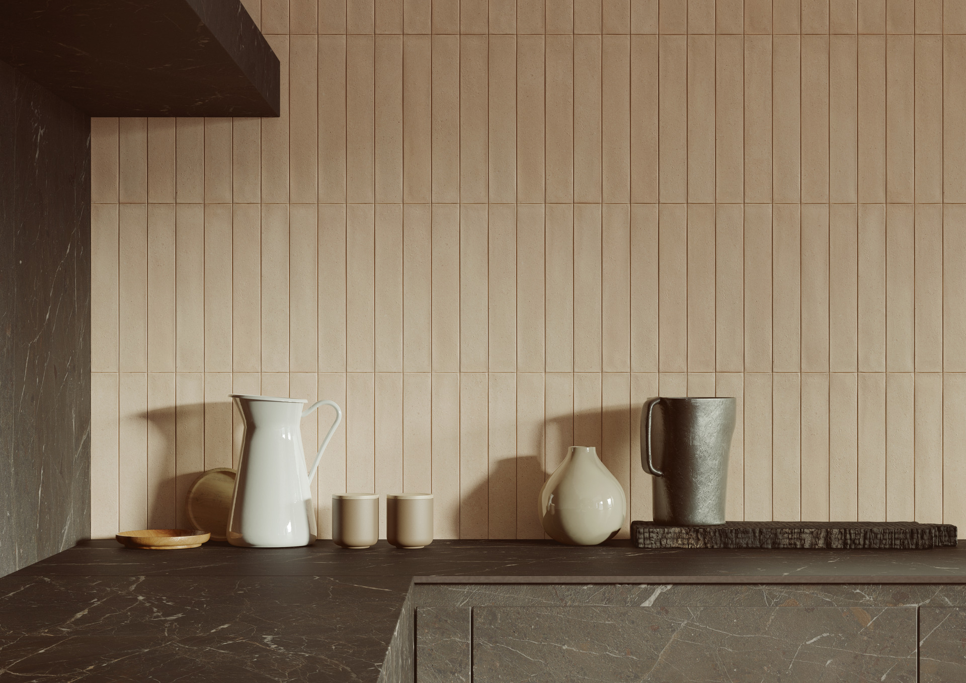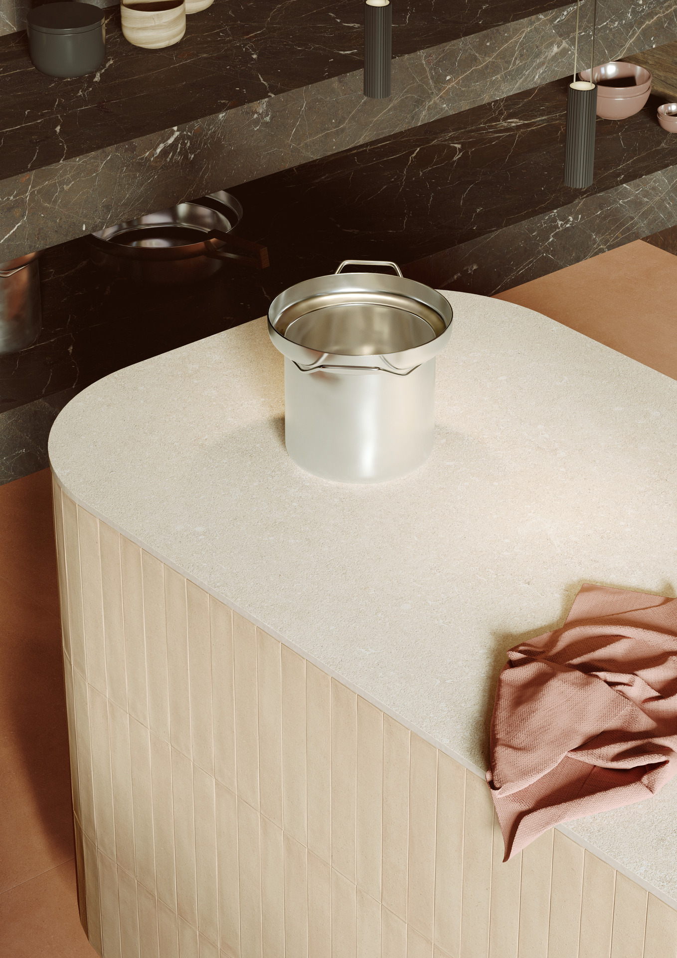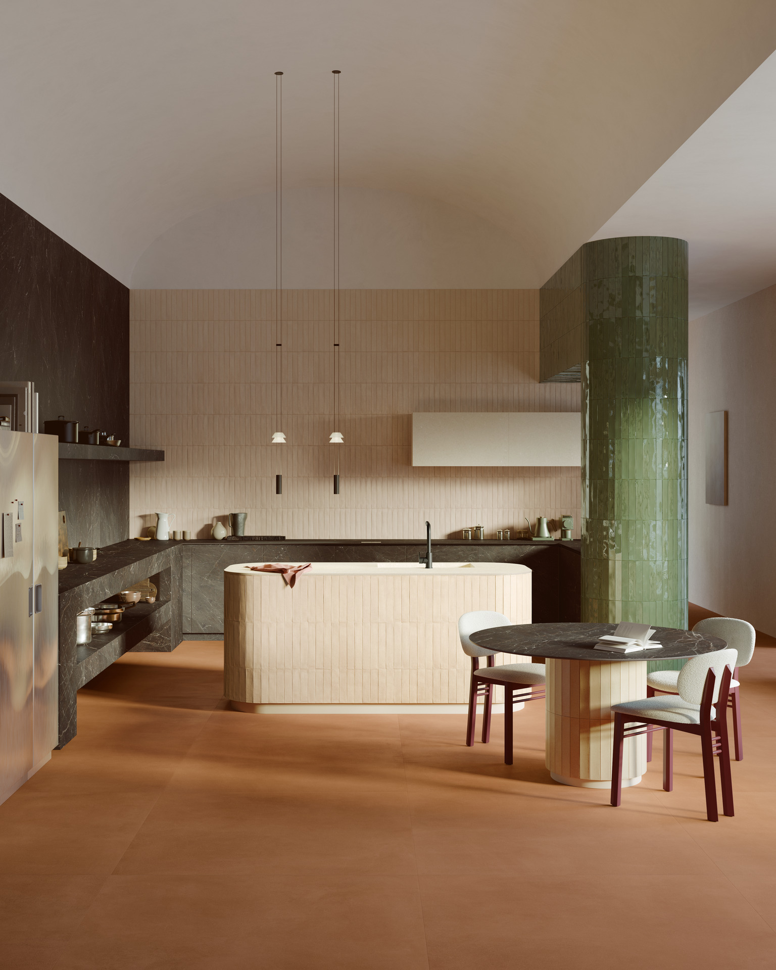 Il colore tenue di ArtCraft Pomice – una collezione della linea Crogiolo che richiama gli antichi saperi artigianali – si ritrova nel backsplash, nel rivestimento del pensile, dell’isola e del piede del tavolo. Quattro modi di percepire il medesimo mattoncino in gres, dal più comune a parete a quello più nascosto del tavolo, che mostrano quanto il cambiamento della texture o del formato incidano sulla percezione del prodotto, rimandando alla bellezza imperfetta del fatto a mano.