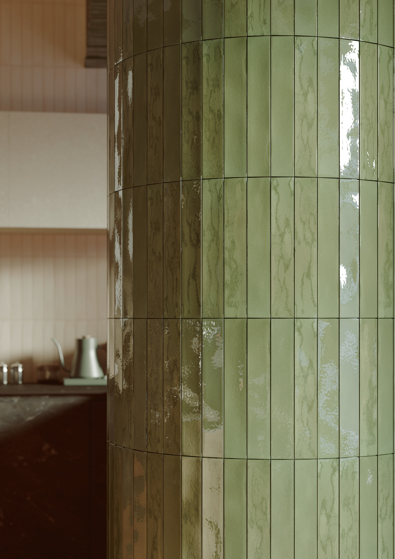 Nell’ambiente spicca il rivestimento della colonna con le piastrelle Crogiolo Luz, caratterizzate dal piccolo formato e dallo smalto super lucido. La colonna richiama quei comuni elementi strutturali e di servizio con cui si scende spesso a compromessi negli interventi di retrofit. Qui si è scelto di enfatizzarla attraverso il colore verde, proseguendo il rivestimento anche nell’architrave, rendendo la colonna l’elemento più caratteristico dell’ambiente.