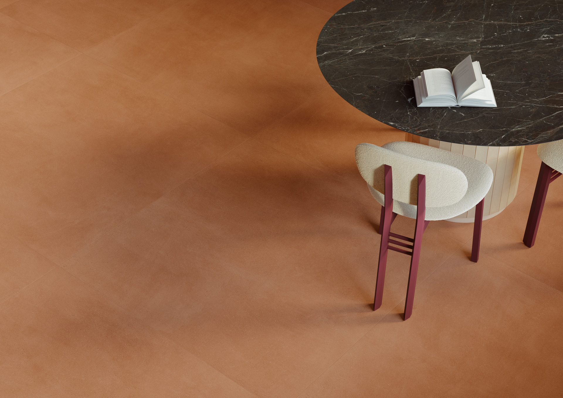 L’immagine pubblicitaria della cucina ci riporta invece a uno spazio del quotidiano: a un ambiente realistico come una residenza ristrutturata con la sua storia e trasformazioni, dove si percepisce il passaggio dell’uomo. A pavimento è stata scelta la serie Slow ispirata al cotto tradizionale, con un’estetica morbida e calda grazie agli effetti materici della tecnologia 3D Ink. Torna il Breccia Imperiale impiegato a parete, nel rivestimento dei mobili contenitori e nel top del tavolo. Un solo gres porcellanato che, al pari dell’effetto cotto, richiama i materiali della tradizione ma viene utilizzato in ruoli diversi, anche grazie alla tecnologia Puro Marazzi Antibacterial che rende le superfici sicure e adatte al contatto con il cibo.