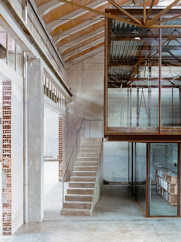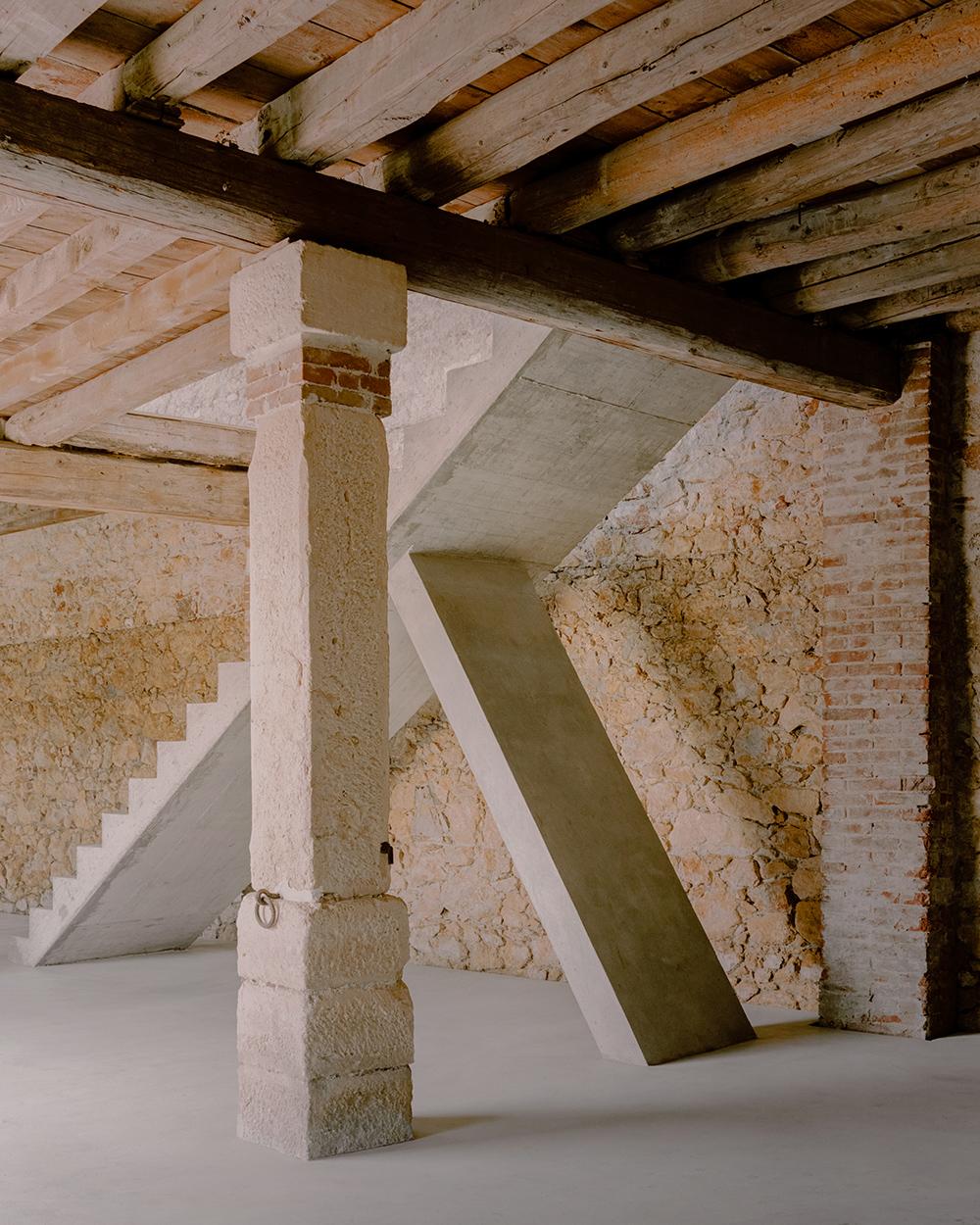 Negli anni ci siamo confrontati con il recupero e la rigenerazione di spazi ex-industriali. Tra questi, il progetto del nostro studio ad Arzignano (VI), in cui un box indipendente cerca relazioni con le geometrie e i materiali esistenti: cemento, acciaio, lamiere grecate e vetro. Il risultato è una struttura scatolare su due livelli in cui tutto appare per ciò che è. Invece, nel caso del recupero di una barchessa storica a Lonigo (VI), la tensione tra antico e nuovo si concretizza in una scala pleonastica in cemento, indipendente dal solaio ligneo e dalla muratura in pietra esistenti. Il restauro del tetto ha previsto il recupero di materiali di riuso provenienti da strutture analoghe nel territorio.