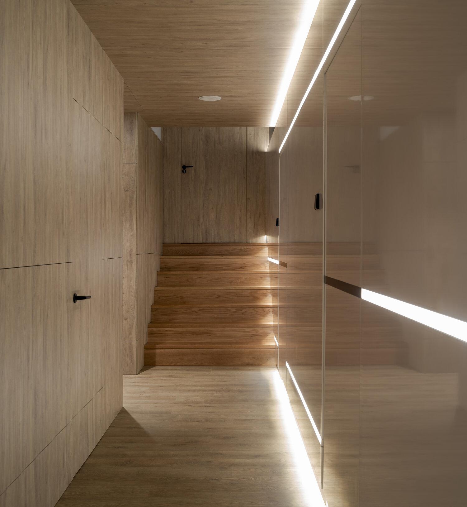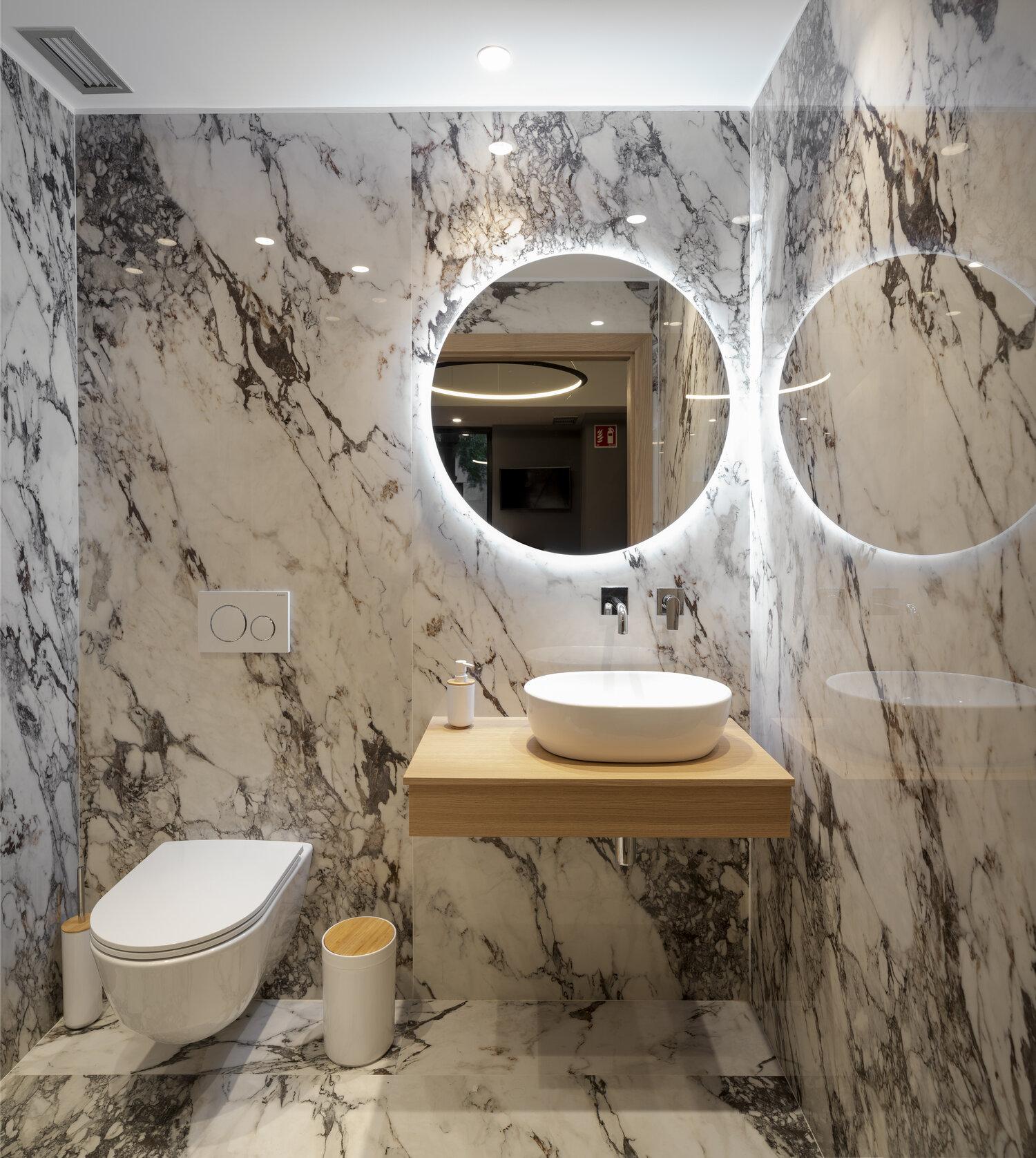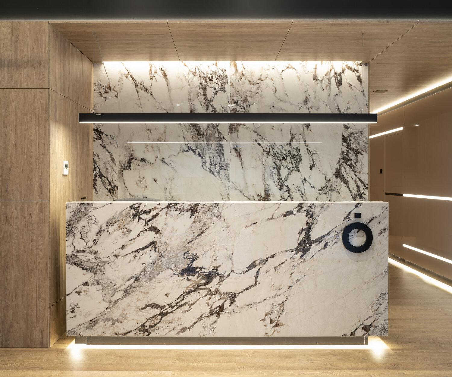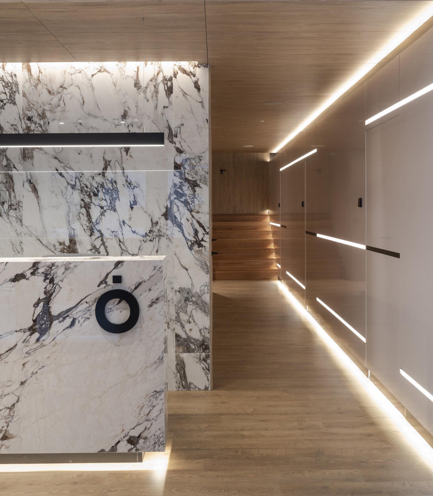 Gli spazi interni sono stati personalizzati interpretando le esigenze e i desideri del committente, ampi e accoglienti con arredi moderni ed essenziali. All’ingresso, sono stati posati pavimenti, pareti in legno e in gres porcellanato che integrano corpi illuminanti con tagli di luce che creano giochi dì chiari e scuri, mettendo in evidenza particolari dell’interior. Per lo scenografico bancone della reception, Fernando Vera ha optato a rivestimento per le lastre in grande formato 120×240 cm della collezione Grande Marble Look Capraia, con finitura Lux e spessore 6 mm, e per la superficie, la linea The Top Grande Marble Look nello stesso colore e finitura ma nel formato 162X324 cm e spessore 12 mm, che riproduce il fascino del marmo, qui con venatura a contrasto, che Marazzi sapientemente ricrea grazie a sofisticate tecnologie e lavorazioni, per progetti tailor-made. La lama di luce, che è stata inserita alla base e alla sommità del bancone, sottolinea ed esaltala il design e il materiale. Anche per le pareti dell’area accoglienza e dei servizi è stata scelta la collezione Grande Marble Look grazie al suo grande formato, lo spessore minimo e le interessanti prestazioni di leggerezza, duttilità e resistenza, caratteristiche che hanno permesso al progettista un’ampia libertà di composizione e di contrasti cromatici.