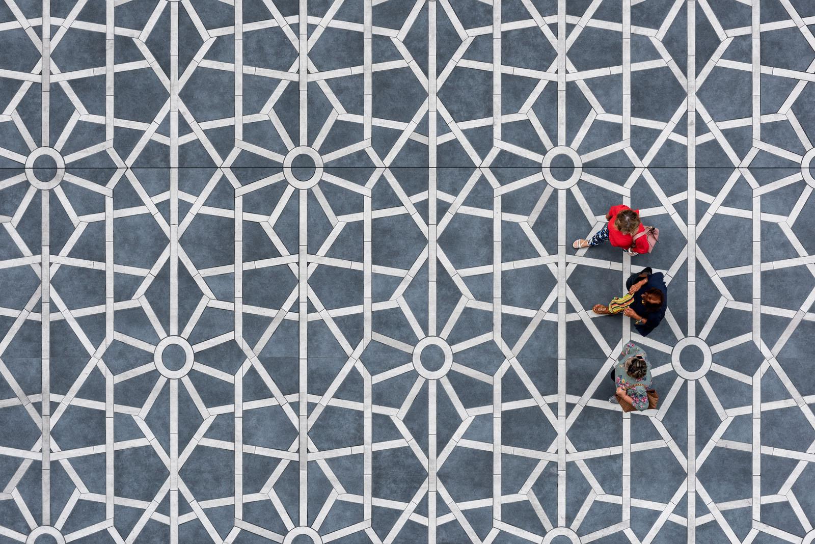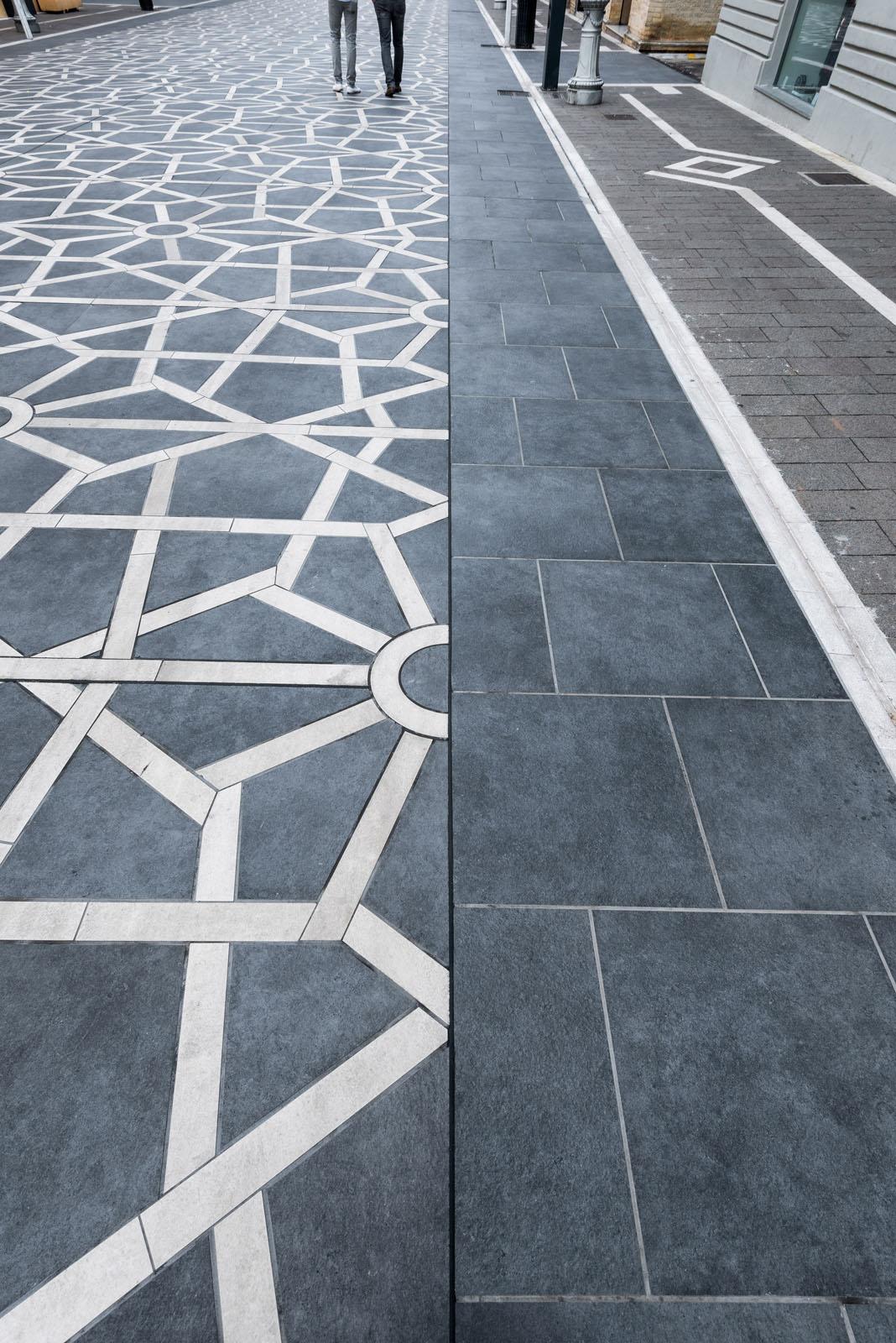 Il grande tappeto geometrico, che si estende sull’intera carreggiata, riallacciandosi ove possibile alla pavimentazione esistente in lastre di basalto, è stato realizzato con il gres porcellanato tecnico SistemN 20mm di Marazzi, nelle nuances Sabbia e Grafite, tagliato ad hoc su disegno dei progettisti. In questo progetto outdoor su larga scala, si esprimono al meglio le potenzialità della serie: la possibilità di creare un prodotto custom e di intervenire con lavorazioni personalizzate e di precisione, le elevate performance tecniche, la gamma cromatica che si presta a raffinati abbinamenti.