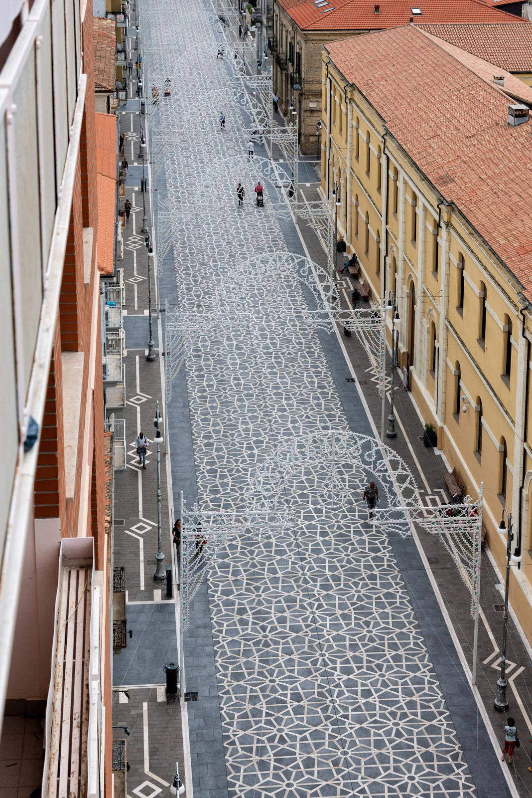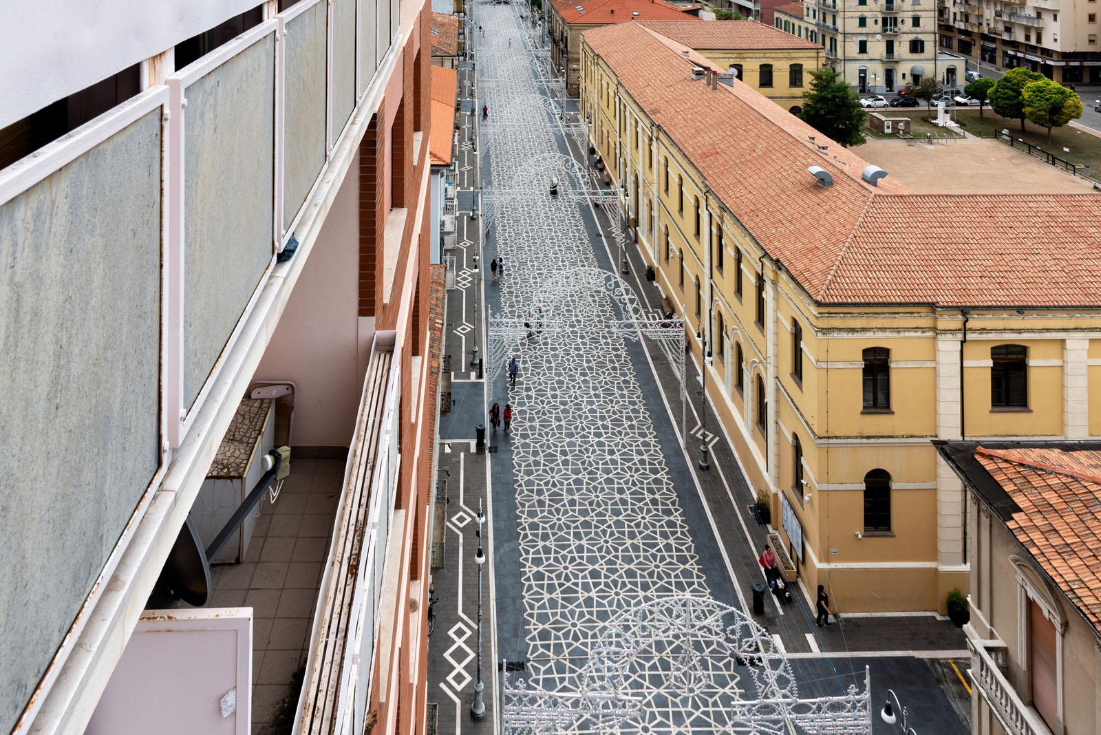 alcuni motivi decorativi della tradizione abruzzese stilizzati in una trama continua bicromatica. Come una candida filigrana, questa tessitura ornamentale è capace di ricucire la qualità disomogenea dei fronti edilizi che si affacciano sulla via, di riconnettere il tessuto storico e quello moderno della città, di imprimere una forte identità visiva al corso.