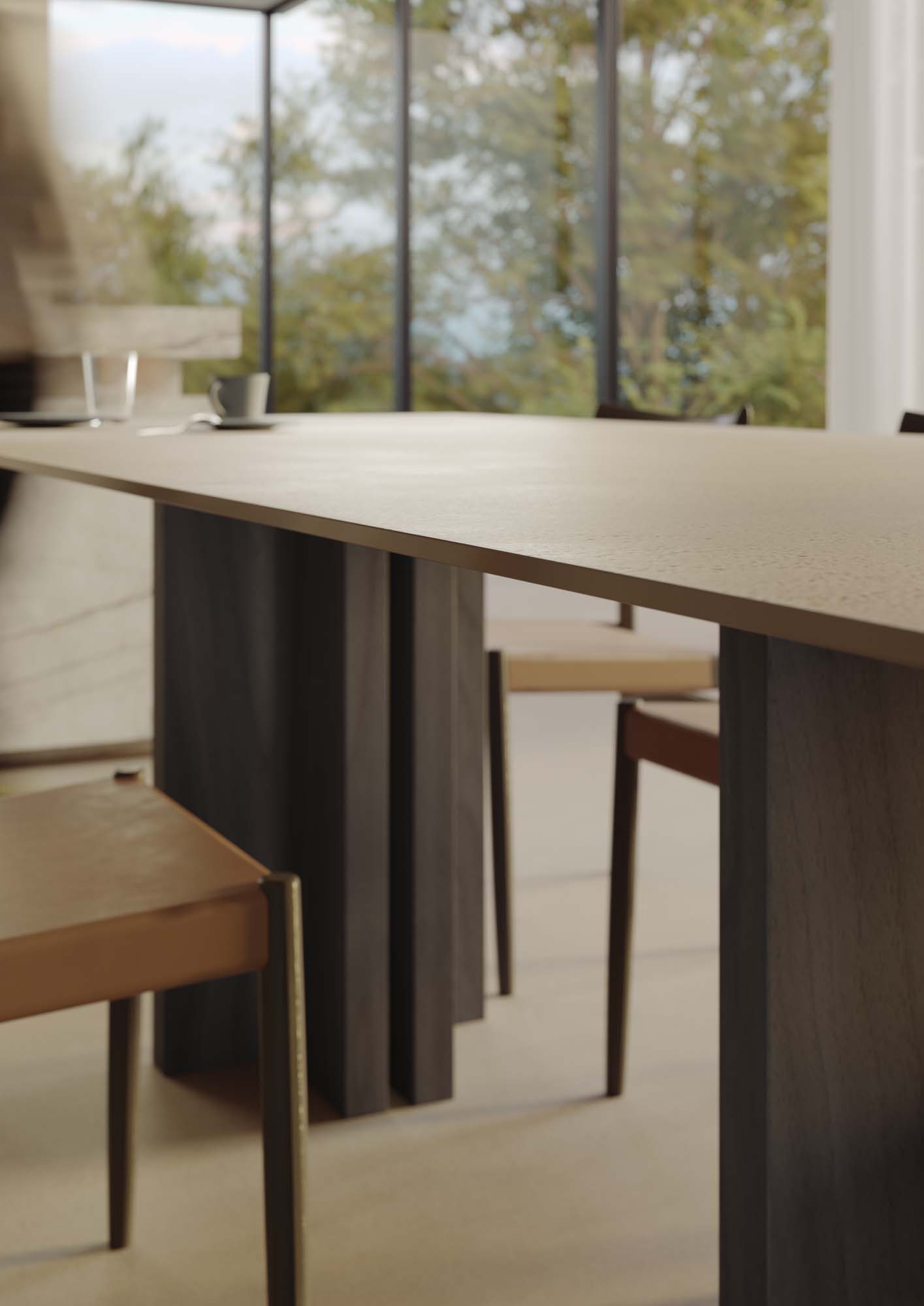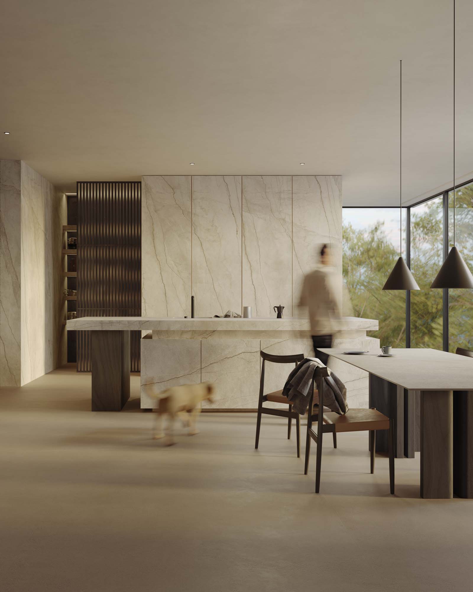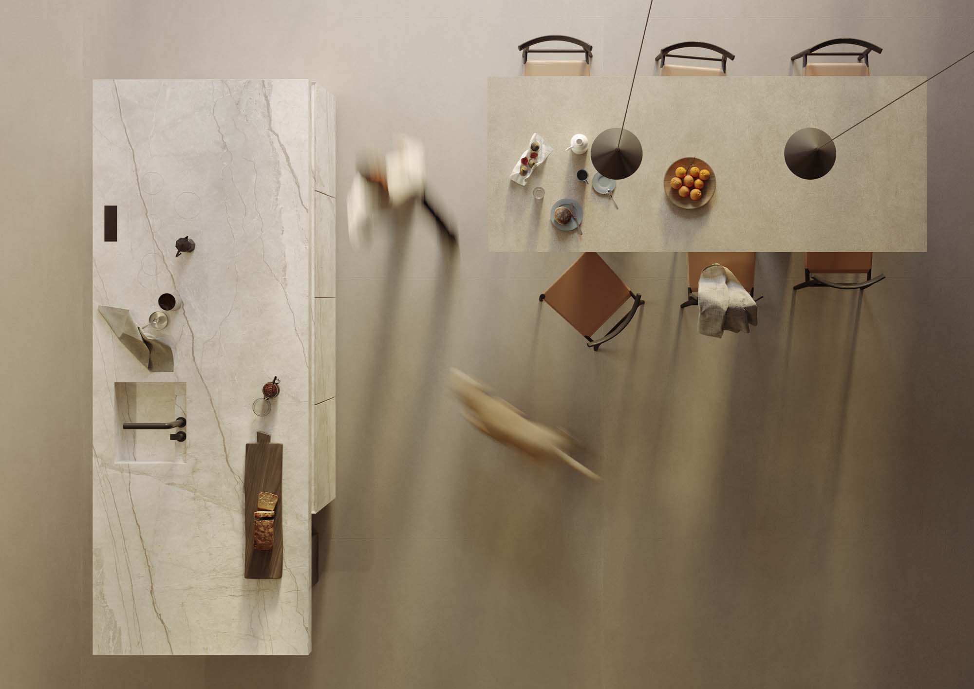 “Le finestre a nastro che si affacciano sulla natura e la stanza ampia e luminosa ci hanno ispirato un’idea di azione più che un semplice ambiente funzionale: una colazione mattutina in un’atmosfera nordica all’interno di uno spazio aperto e meno mediterraneo. Sono presenti dettagli e oggetti che richiamano momenti della giornata, come la colazione, e le funzioni di ciascuna delle zone, ad esempio, si percepisce un po’ di disordine nella dispensa, mentre il giradischi sopra la mensola aiuta a fondere gli ambienti living e cucina”. La composizione architettonica mette in risalto la collezione effetto cotto Slow proposta nella nuova versione in lastra 12 mm colore Calce, posata a pavimento e sul piano del grande tavolo, abbinata alla sensazione lapidea della Silver Root nella nuova versione più chiara, posata sulla cucina, sulla parete alle spalle e sulla mensola.