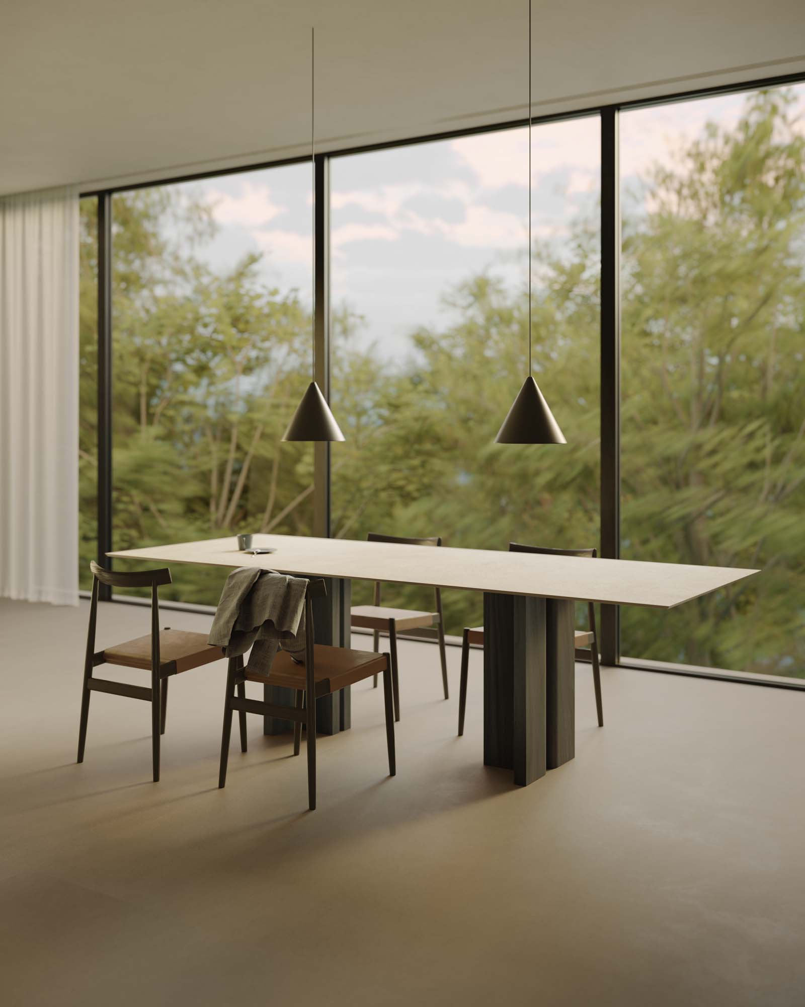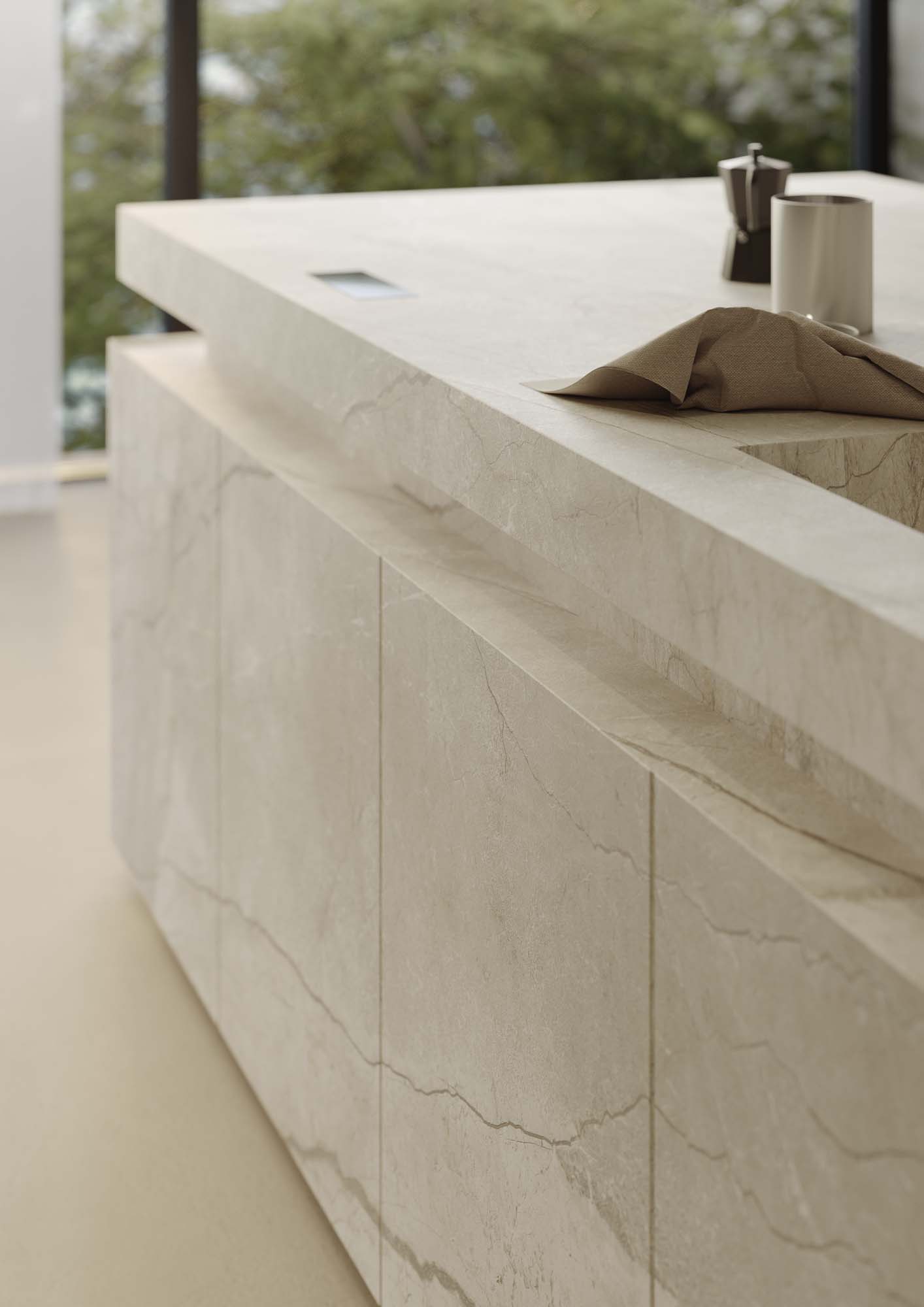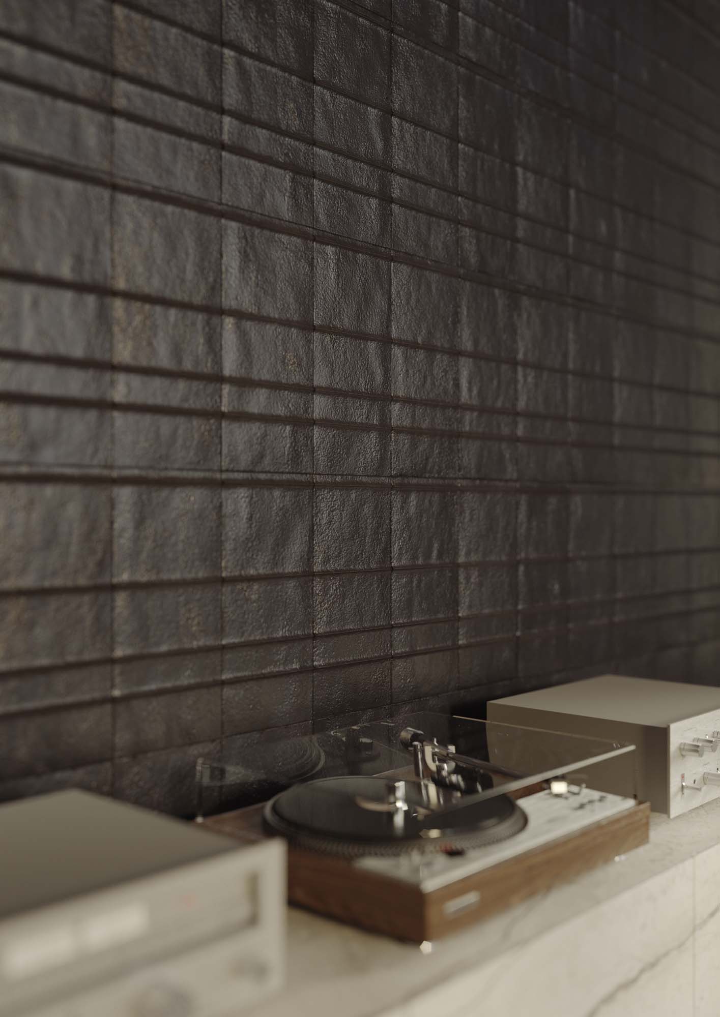 “Le finestre a nastro che si affacciano sulla natura e la stanza ampia e luminosa ci hanno ispirato un’idea di azione più che un semplice ambiente funzionale: una colazione mattutina in un’atmosfera nordica all’interno di uno spazio aperto e meno mediterraneo. Sono presenti dettagli e oggetti che richiamano momenti della giornata, come la colazione, e le funzioni di ciascuna delle zone, ad esempio, si percepisce un po’ di disordine nella dispensa, mentre il giradischi sopra la mensola aiuta a fondere gli ambienti living e cucina”. La composizione architettonica mette in risalto la collezione effetto cotto Slow proposta nella nuova versione in lastra 12 mm colore Calce, posata a pavimento e sul piano del grande tavolo, abbinata alla sensazione lapidea della Silver Root nella nuova versione più chiara, posata sulla cucina, sulla parete alle spalle e sulla mensola.