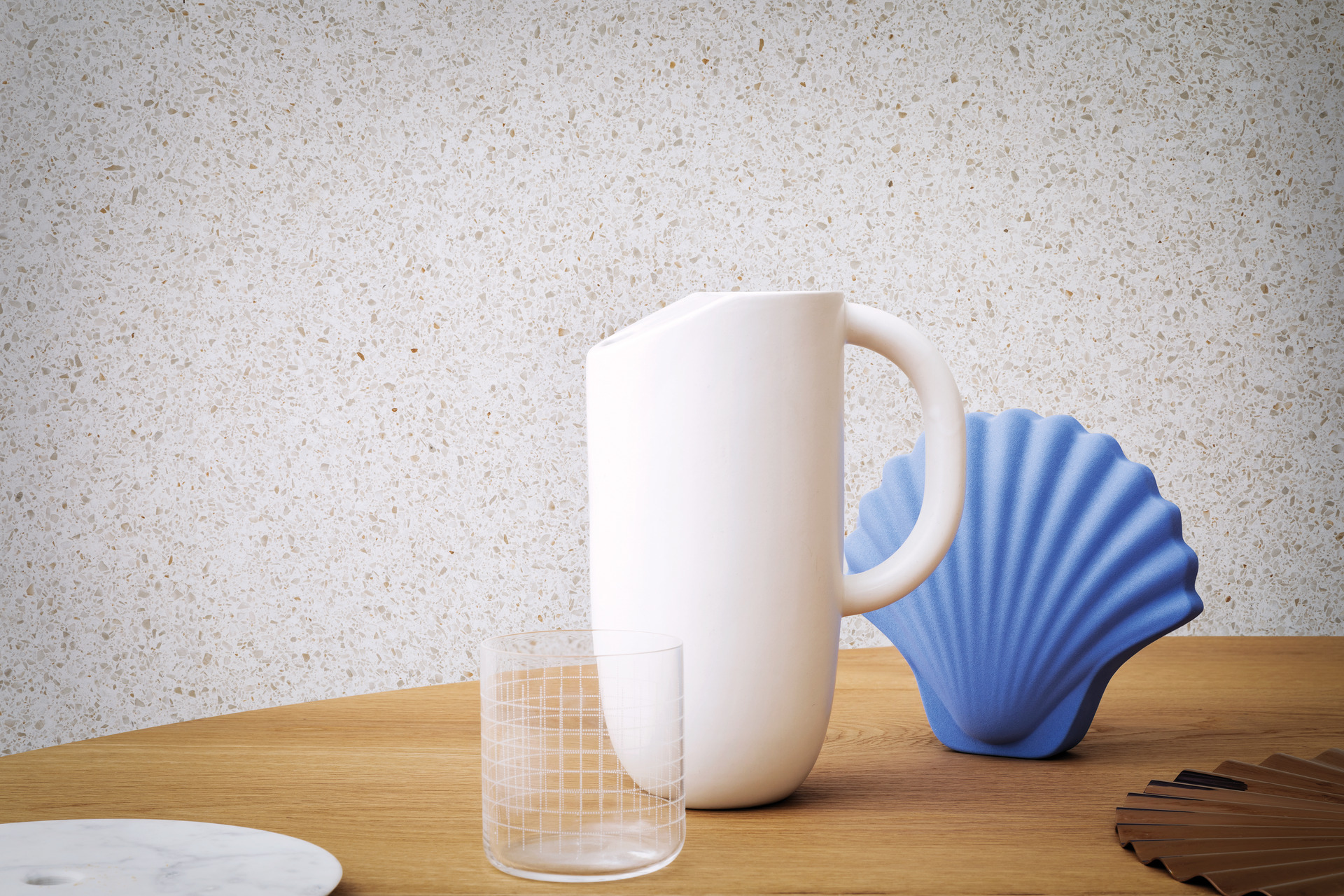 I legni chiari sono una soluzione particolarmente efficace perché aggiungono calore senza appesantire; allo stesso modo, i colori pieni ma ben calibrati, come verde profondo, blu polveroso, sabbia o grigio caldo, possono dialogare bene con la graniglia se inseriti in un insieme coerente.