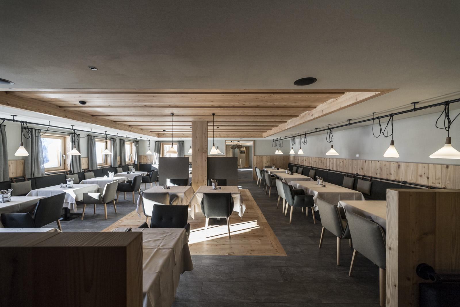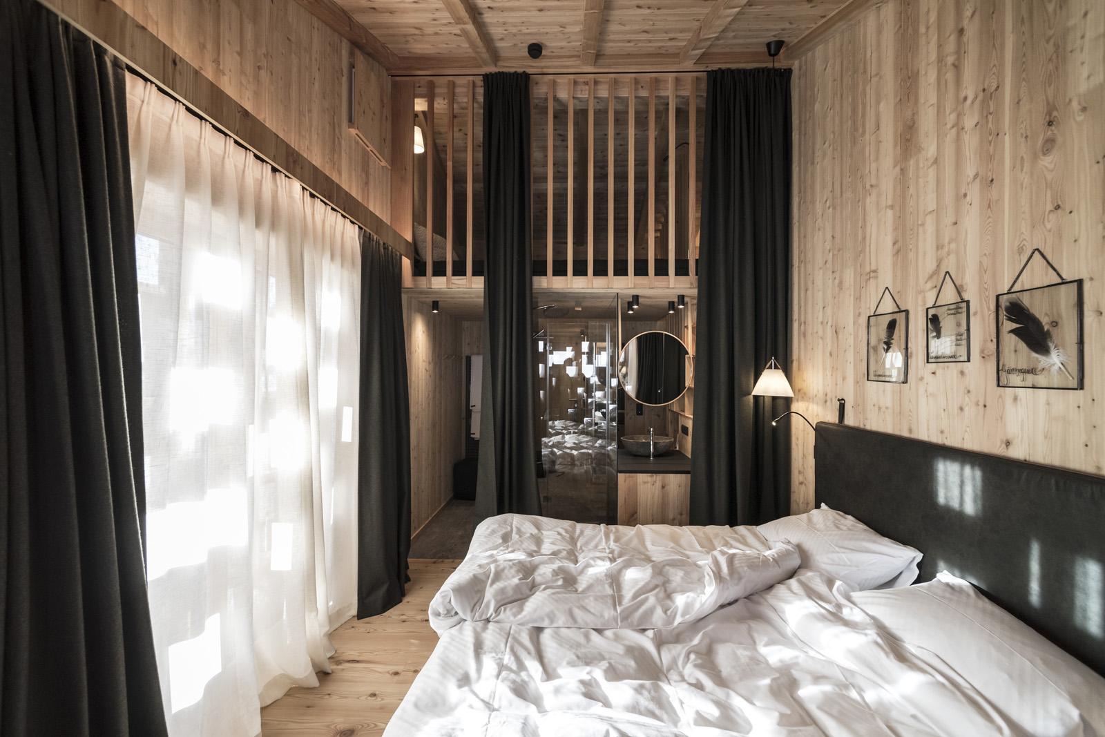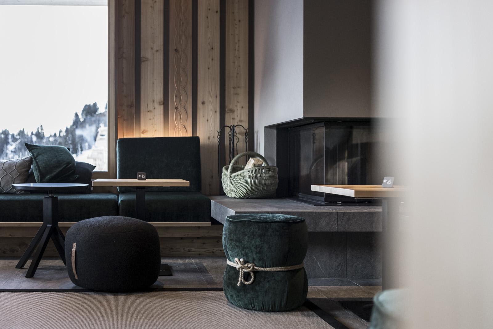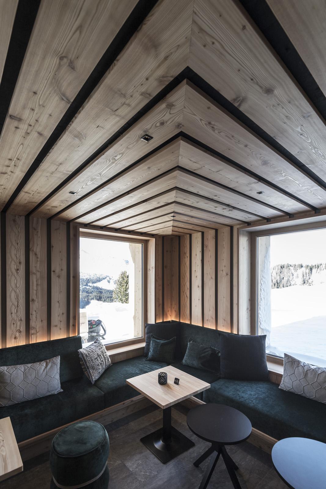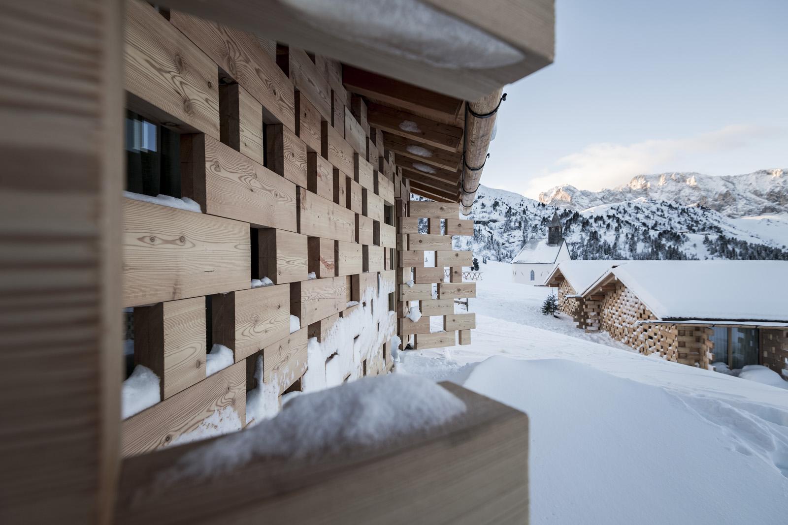 All'esterno dei nuovi chalet, un sistema di pannelli scorrevoli in legno in corrispondenza delle vetrate consente l'apertura sullo spettacolare scenario alpino; quando chiusi, i pannelli creano suggestivi effetti di luce e ombra nelle stanze. All'interno degli chalet e del corpo centrale, gli architetti fanno ampio uso del legno al naturale, applicato a pavimento e a parete per evocare l'atmosfera delle tradizionali stube.