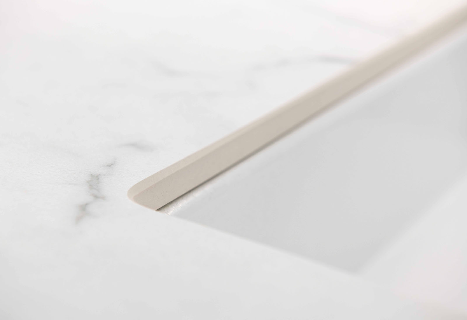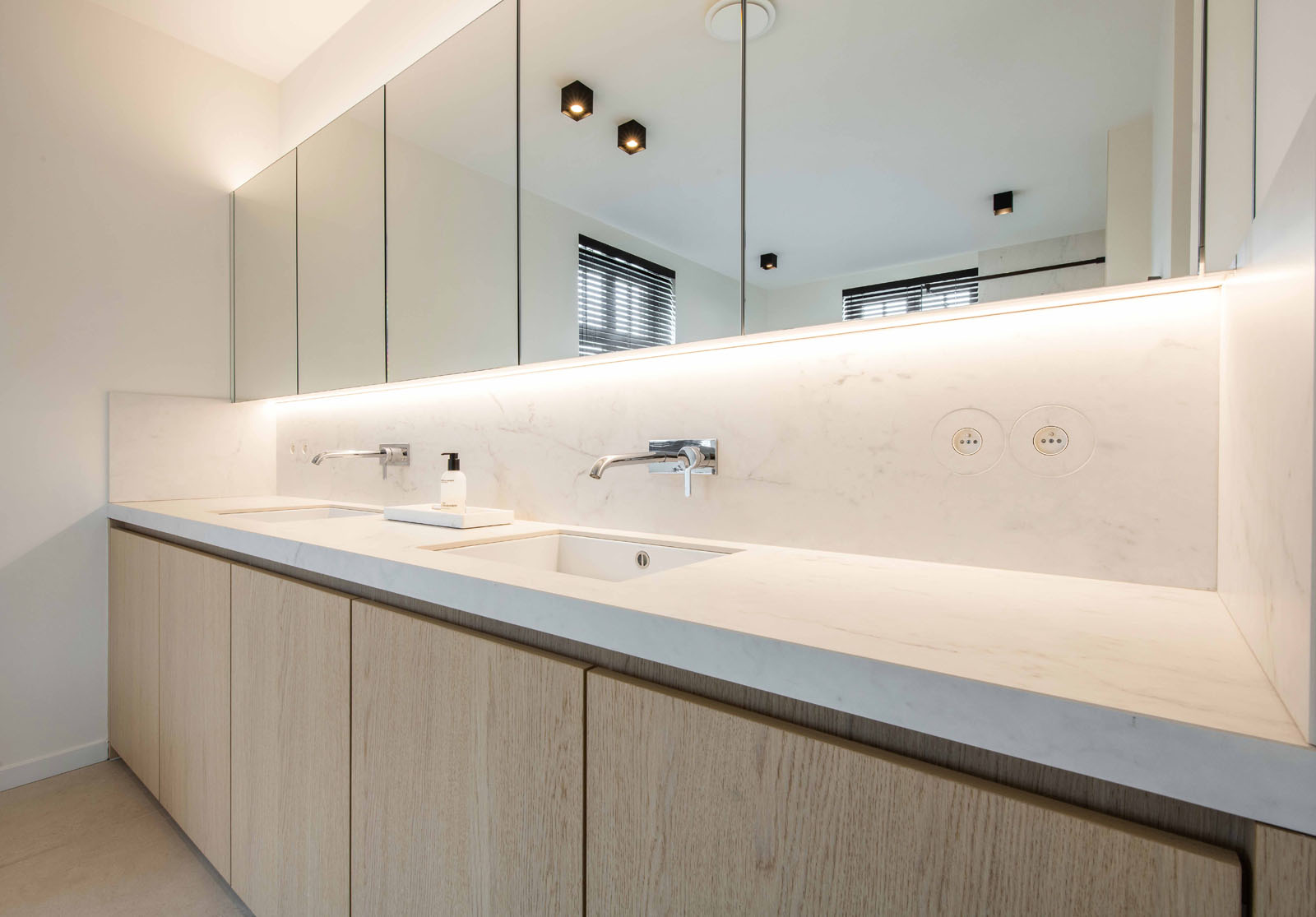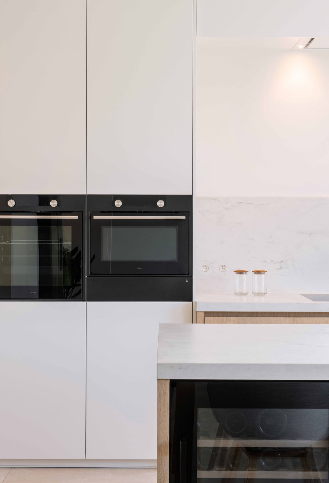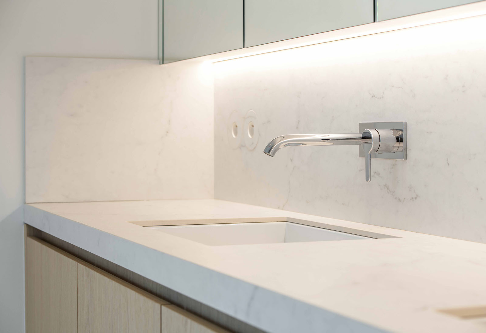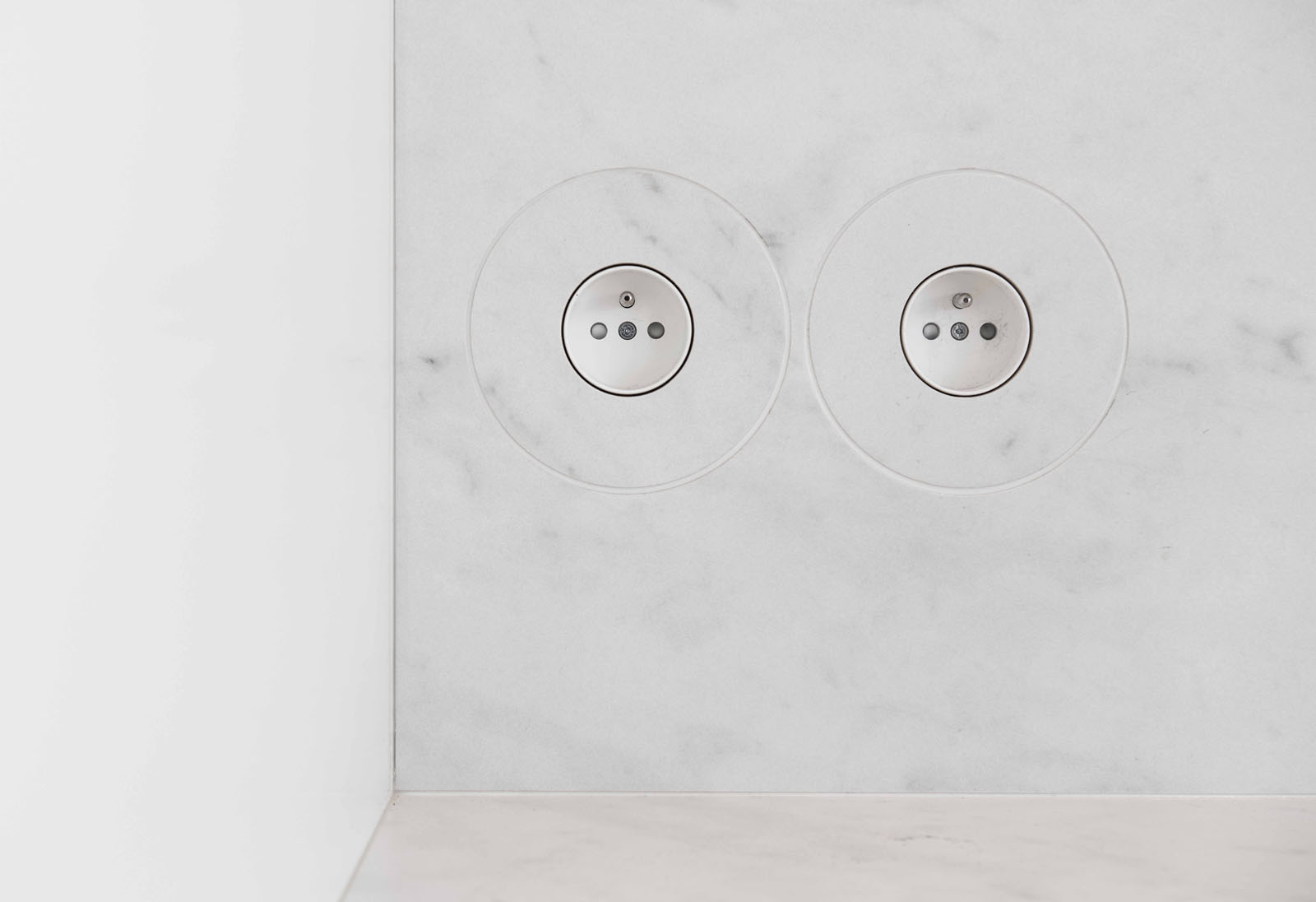 Per la realizzazione dei piani della cucina, coordinati con i colori e i materiali utilizzati nell’appartamento, sono state scelte le grandi lastre in gres porcellanato The Top Marble Look Altissimo con finitura Satin nel formato 162x324 cm e spessore 12 mm di Marazzi, collezione che reinterpreta i marmi pregiati con sofisticate venature e cromatismi, grazie a un’avanzata ricerca stilistica e tecnologica. La stessa collezione di grandi dimensioni, appositamente pensata per la realizzazione di top, backsplash, tavoli, ante e infinite opzioni di arredo tailor made per spazi residenziali e commerciali, è stata utilizzata nel bagno, adiacente alla camera da letto, per la realizzazione del top del mobile bagno e per la parete dell’ampia doccia per una maggiore continuità materica e cromatica.