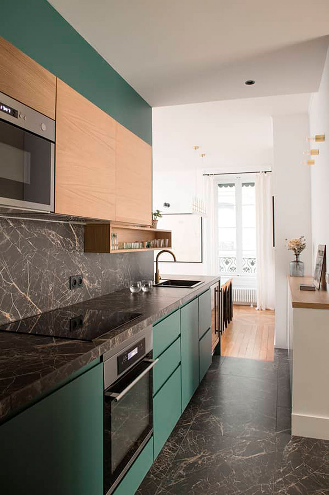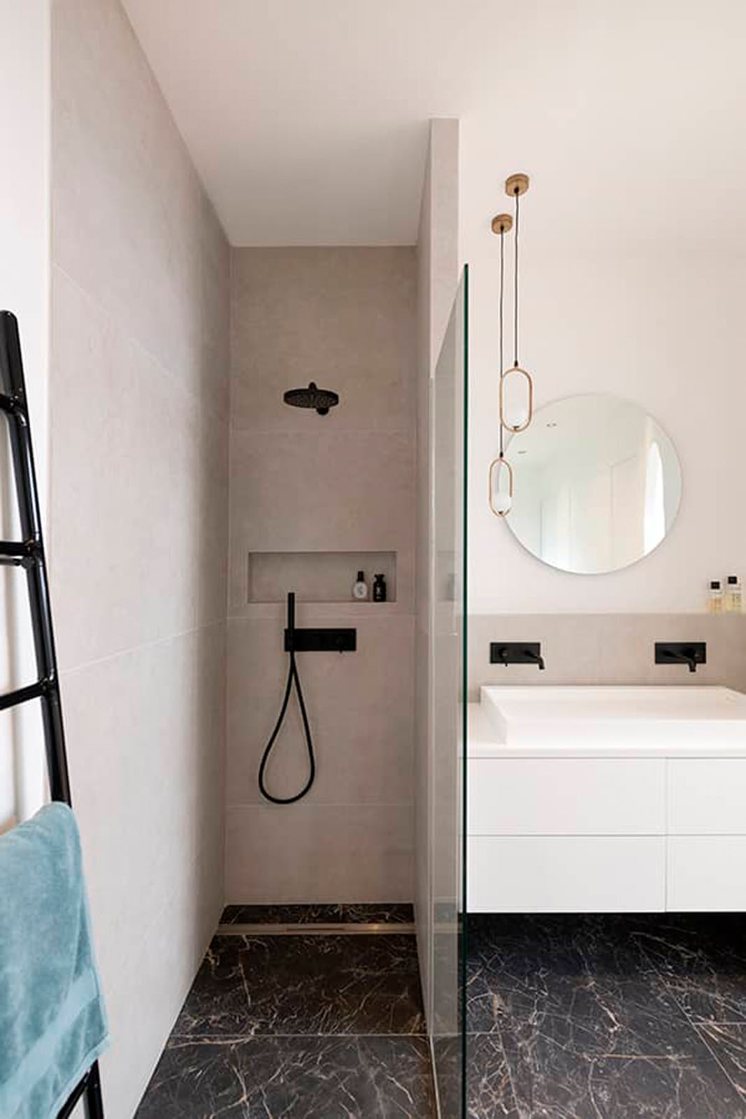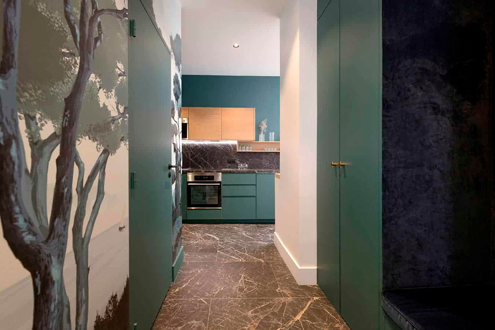 Le lastre in gres porcellanato Allmarble 120x60 cm nella tonalità decisa Saint Laurent sono state scelte dall’interior designer per conferire agli spazi un’autentica dimensione architettonica. In particolare, il gres effetto marmo Saint Laurent compare a pavimento dell’ingresso - completamente riprogettato che si apre su una prospettiva stupefacente: la cucina, esaltata da un blu-verde ipnotico – e negli spazi cucina e bagno anch’essi oggetto di una rilettura più contemporanea.