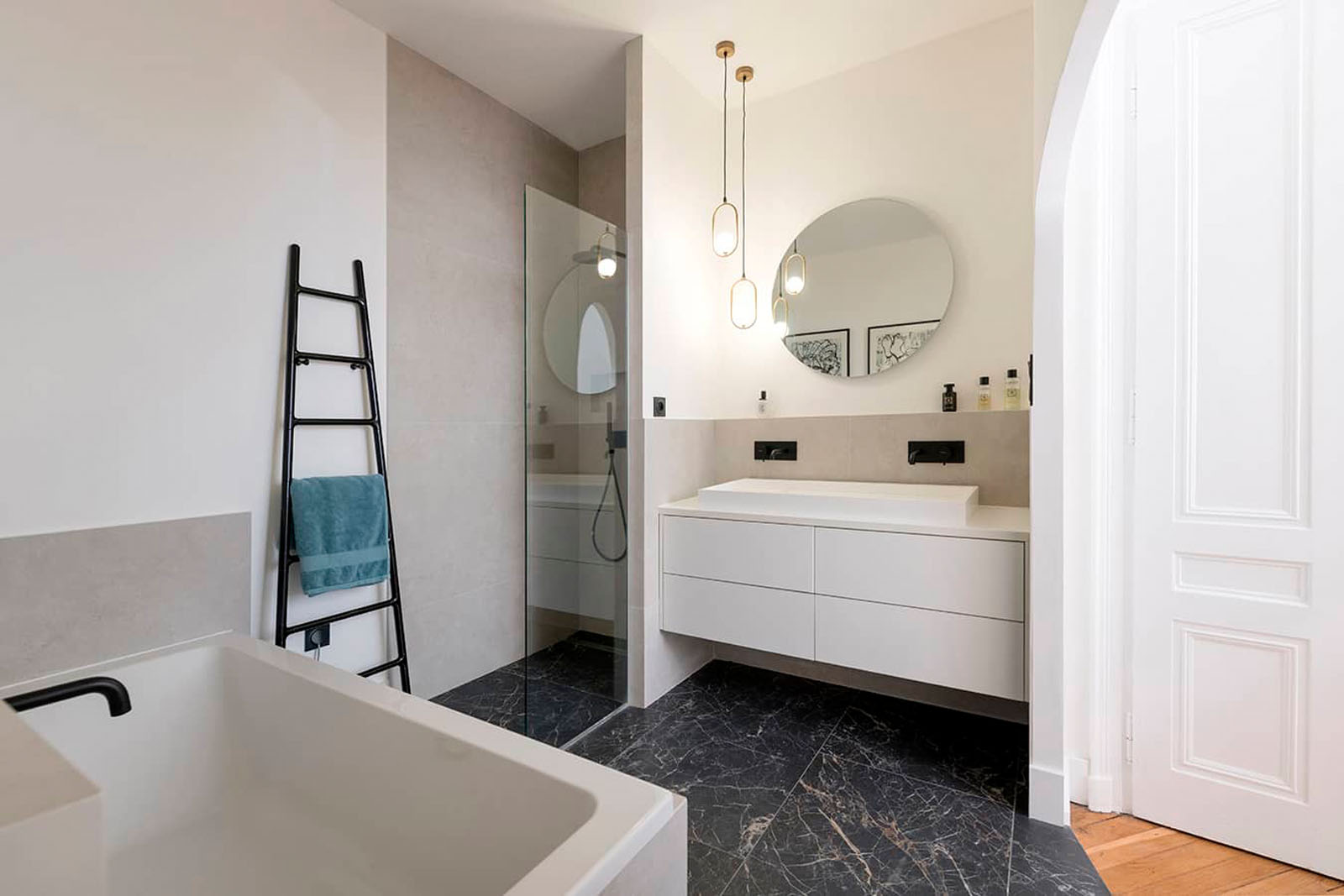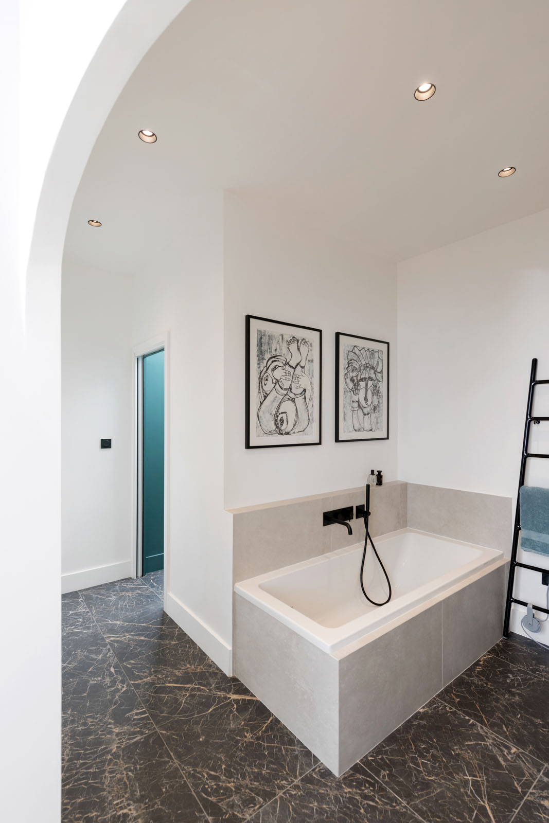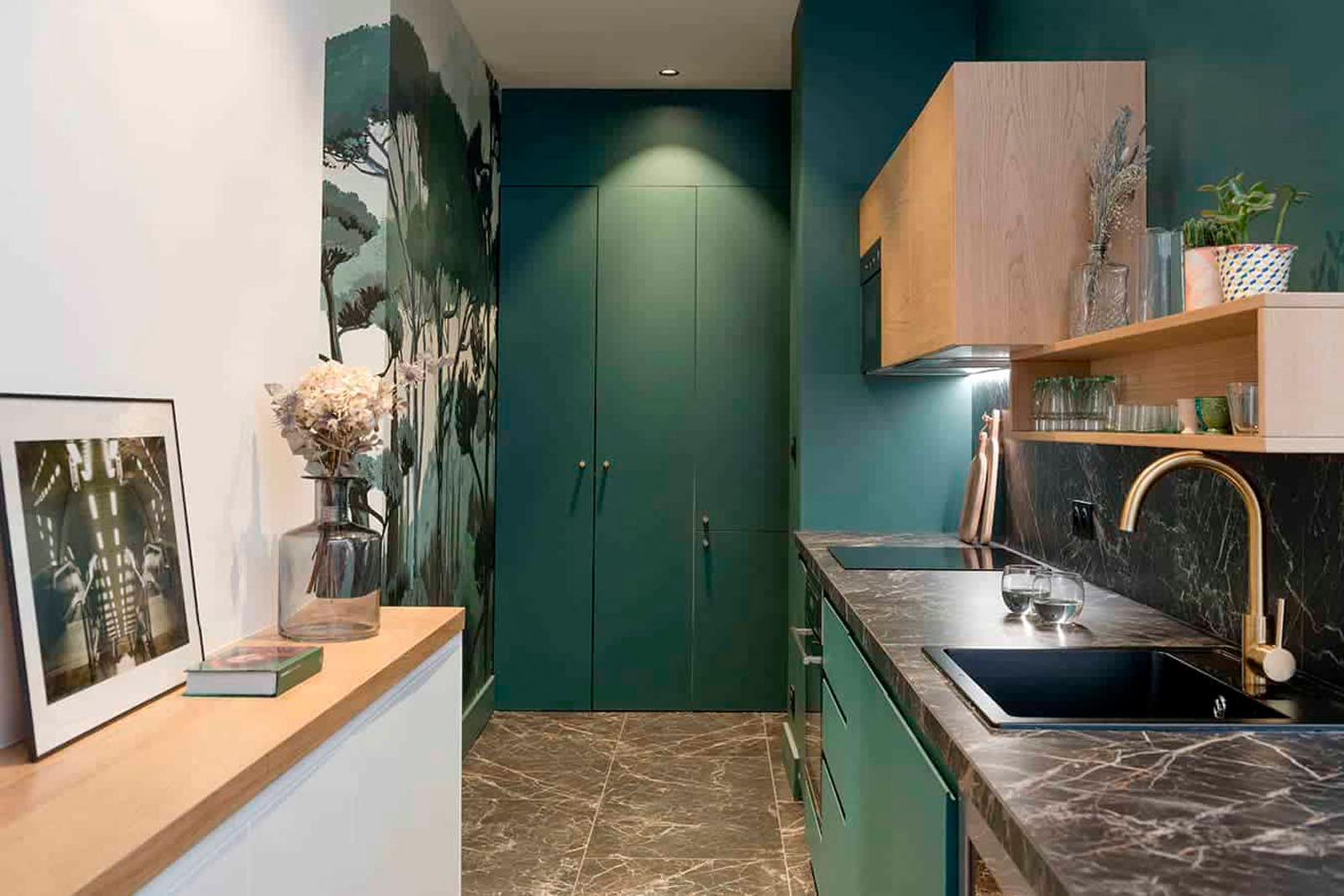 Le lastre in gres porcellanato Allmarble 120x60 cm nella tonalità decisa Saint Laurent sono state scelte dall’interior designer per conferire agli spazi un’autentica dimensione architettonica. In particolare, il gres effetto marmo Saint Laurent compare a pavimento dell’ingresso - completamente riprogettato che si apre su una prospettiva stupefacente: la cucina, esaltata da un blu-verde ipnotico – e negli spazi cucina e bagno anch’essi oggetto di una rilettura più contemporanea.
