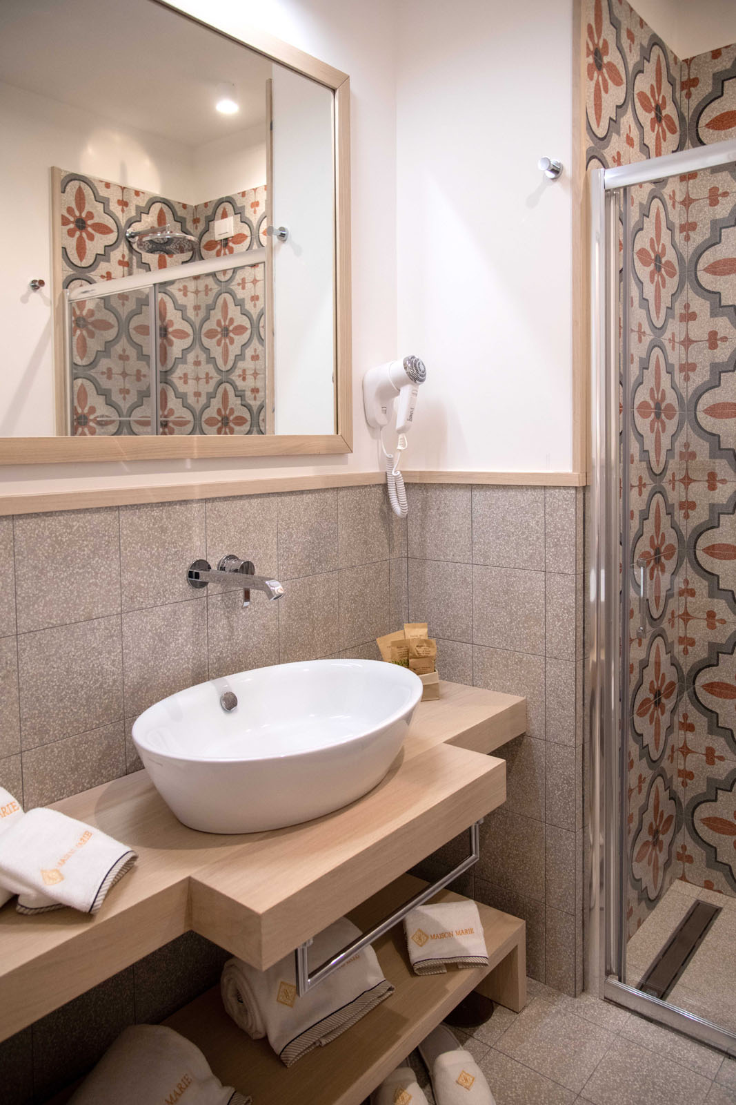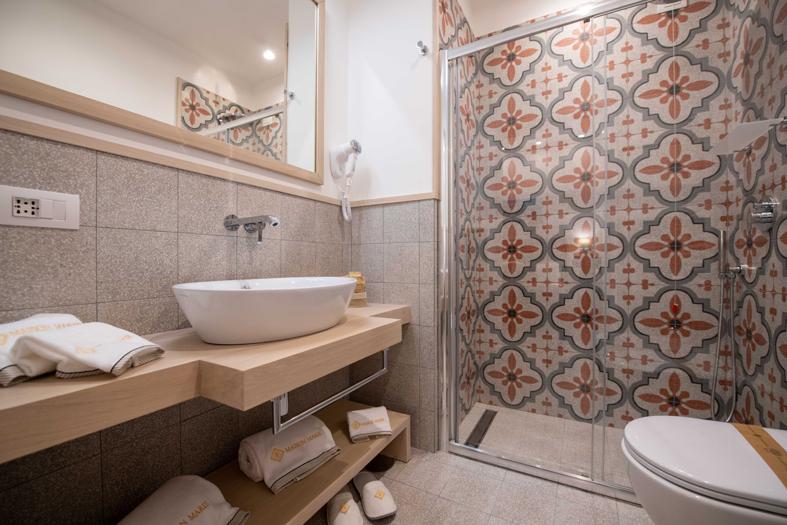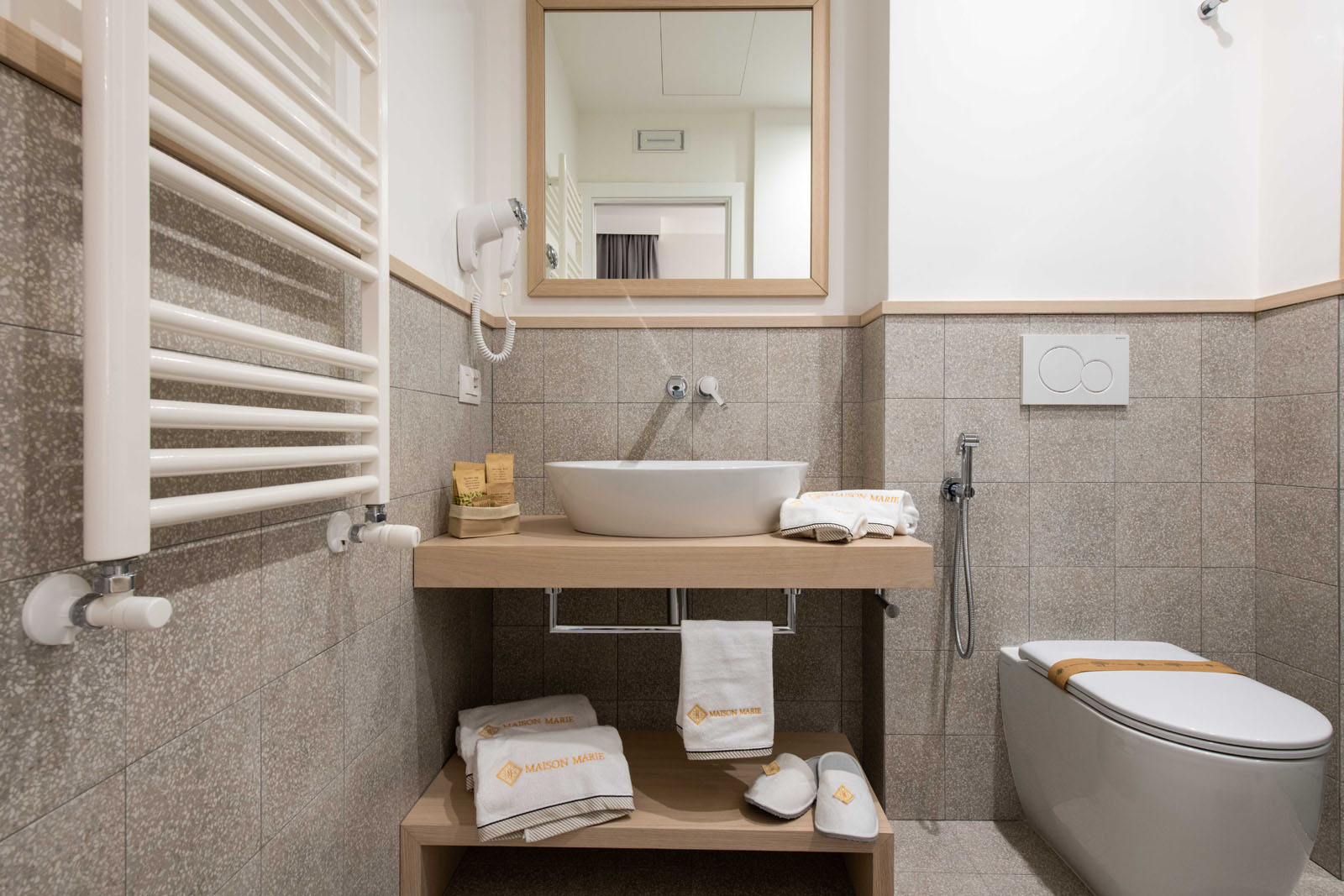 Maison Marie è composta da cinque stanze matrimoniali, tre delle quali con terrazzino. Tutte sono dotate di servizi privati. La scelta stilistica è stata quella di riproporre le rifiniture classiche delle case sorrentine, con pavimentazione in graniglie di marmo.