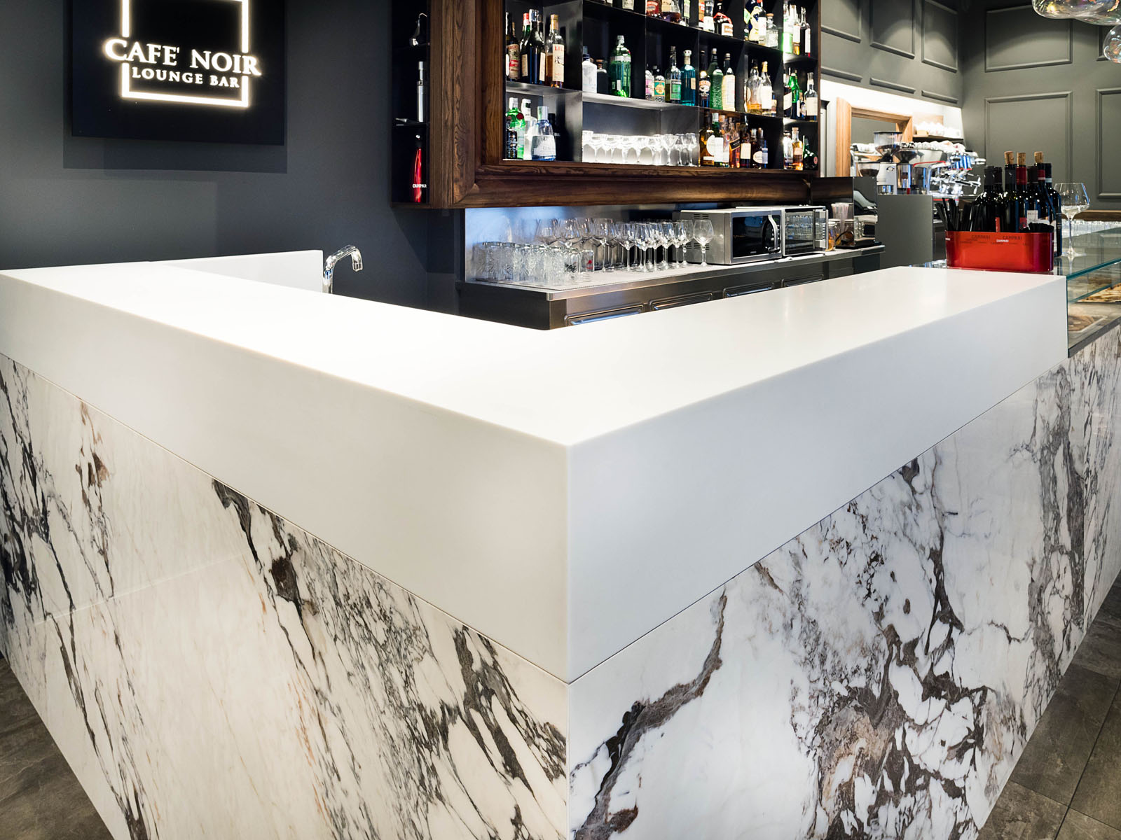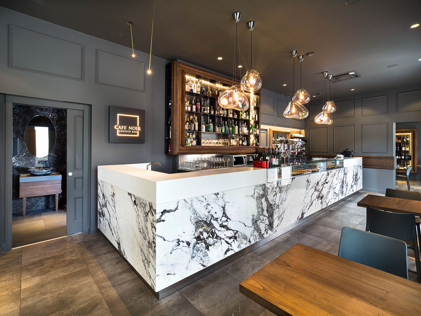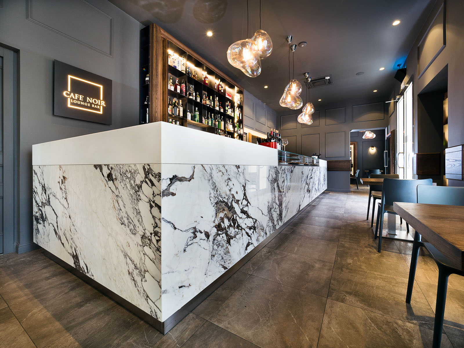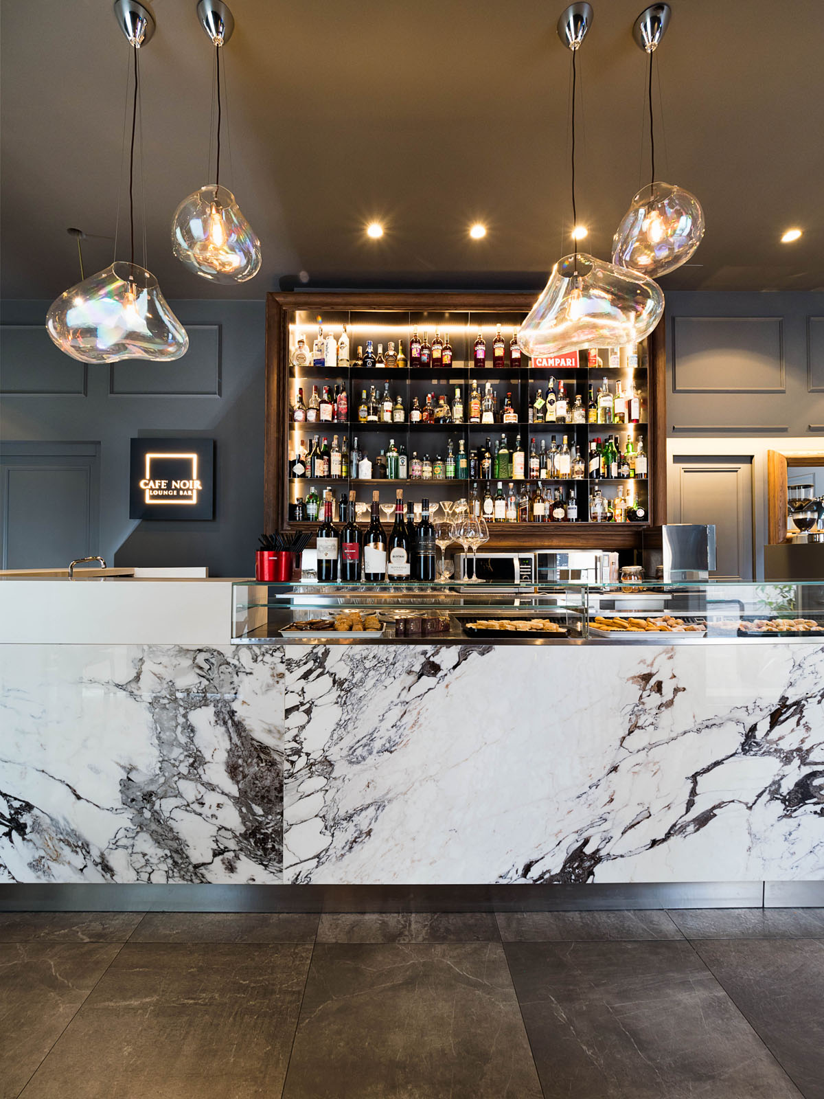 Cafe Noir è un lounge bar situato nel cuore di Reggio Calabria recentemente restaurato dall’architetto Consolato Alampi dello studio Expodesign. Lo stile scelto per il locale è un mix di modernità e mood vintage; le note scure del grigio delle pareti e del soffitto restituiscono un’atmosfera calda ed elegante e dialogano perfettamente con il gres effetto pietra Blend, scelto nel colore Brown e nel formato 60x60, e con le delicate venature di Grande Marble Look Capraia, selezionato nel formato 160x320.