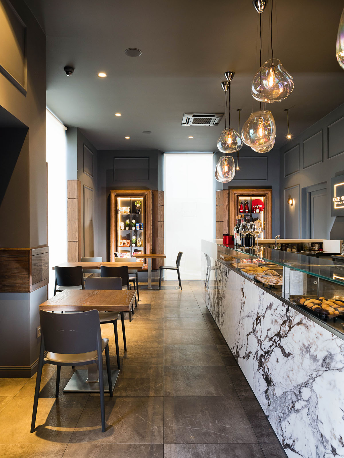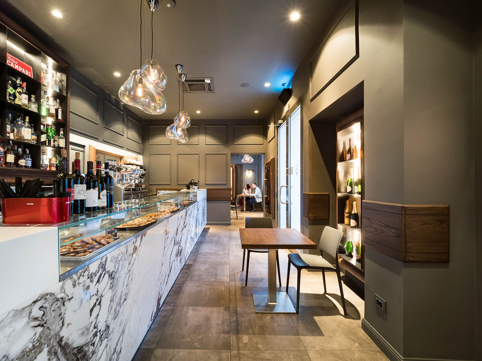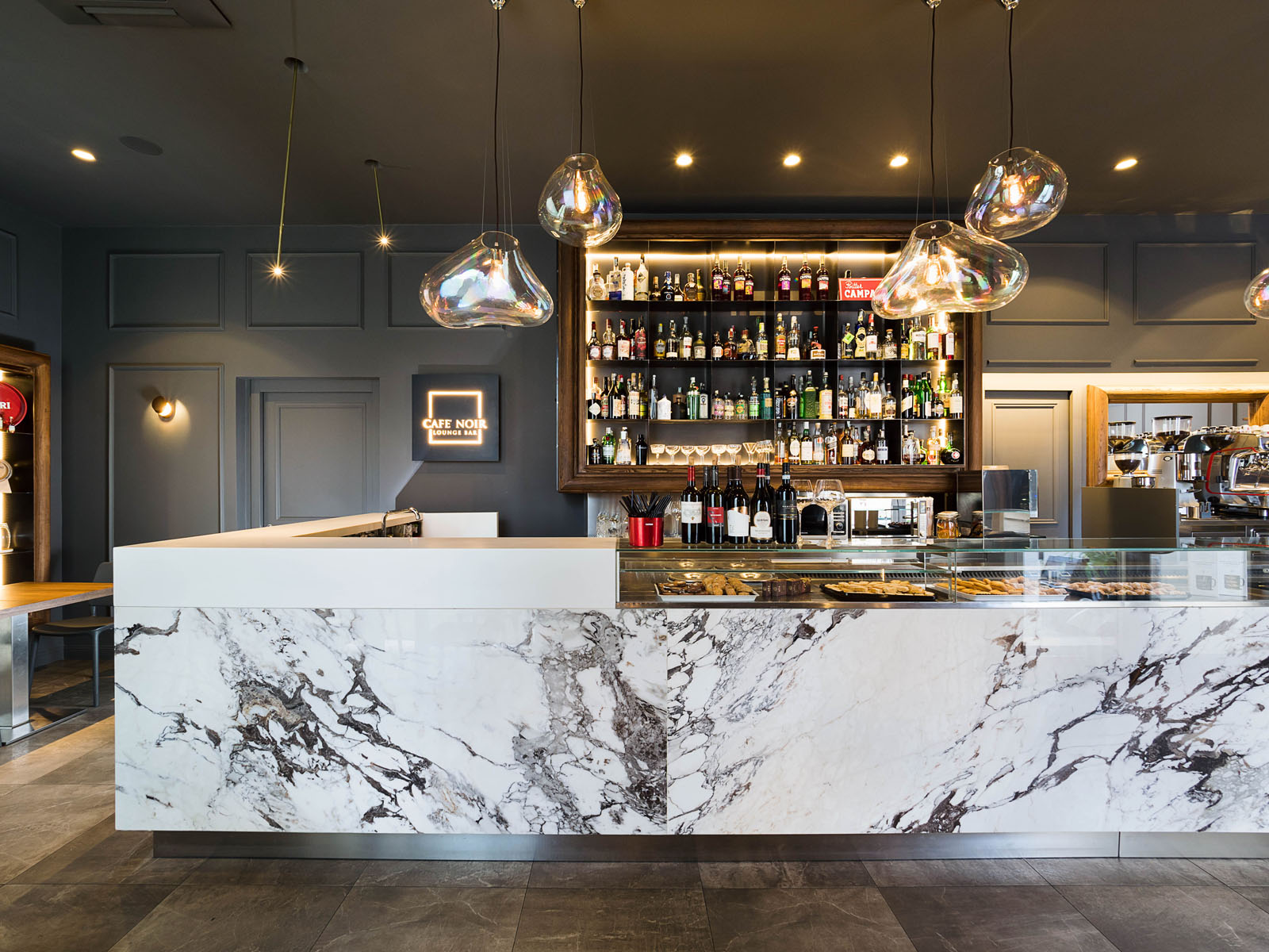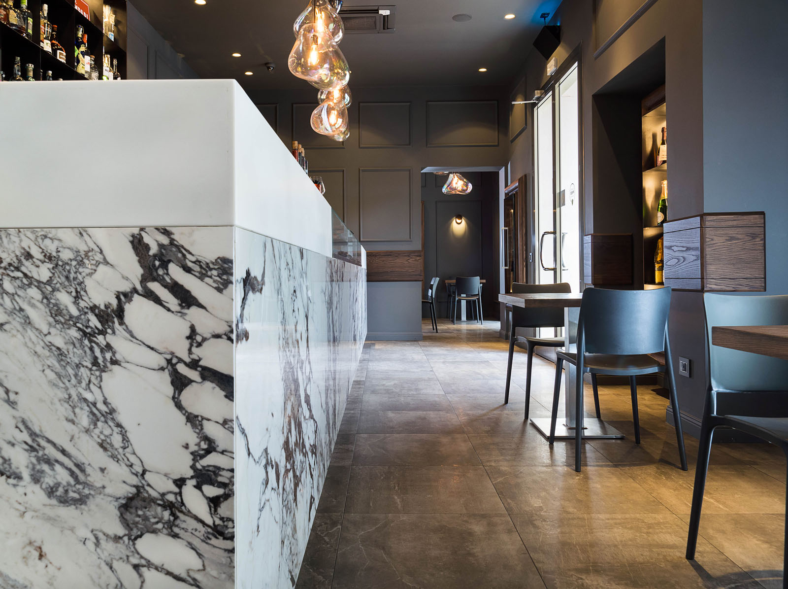 Cafe Noir è un lounge bar situato nel cuore di Reggio Calabria recentemente restaurato dall’architetto Consolato Alampi dello studio Expodesign. Lo stile scelto per il locale è un mix di modernità e mood vintage; le note scure del grigio delle pareti e del soffitto restituiscono un’atmosfera calda ed elegante e dialogano perfettamente con il gres effetto pietra Blend, scelto nel colore Brown e nel formato 60x60, e con le delicate venature di Grande Marble Look Capraia, selezionato nel formato 160x320.