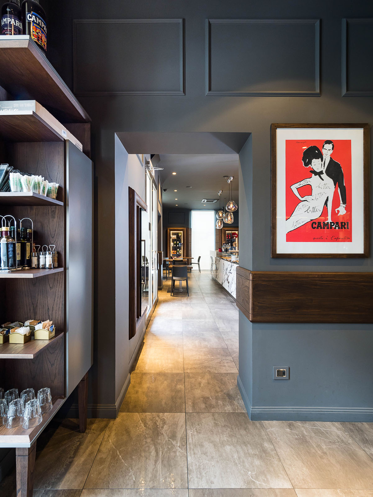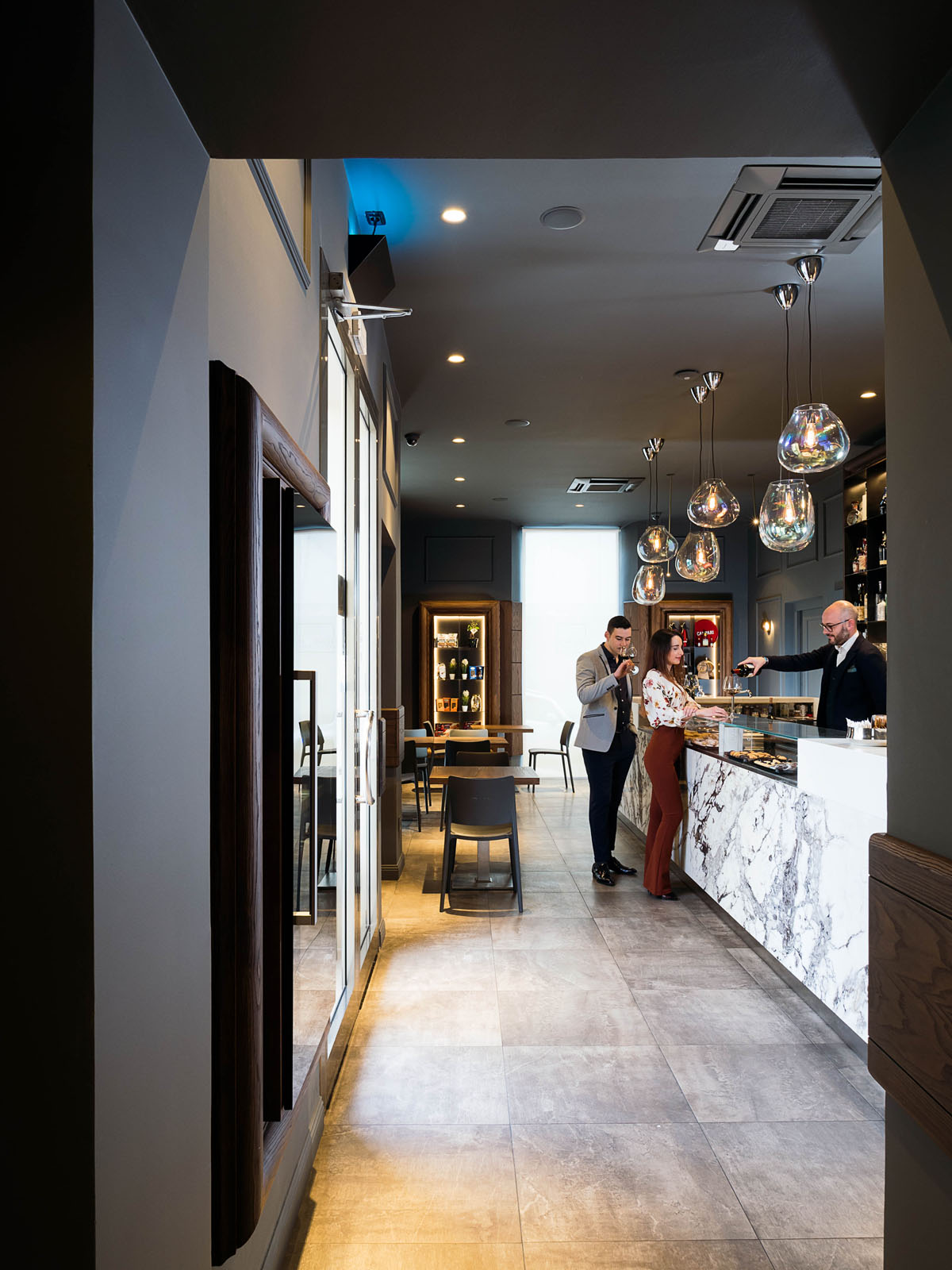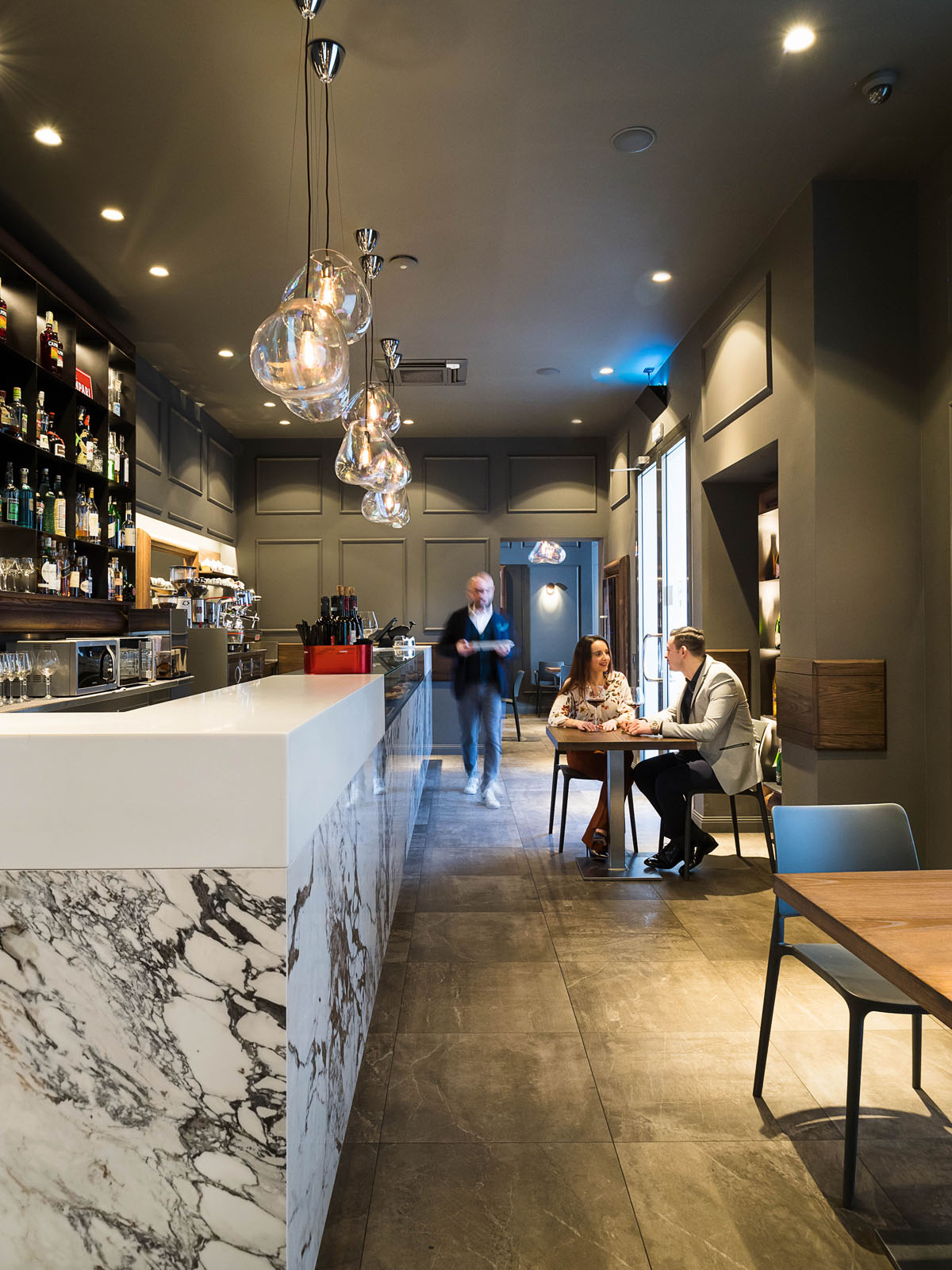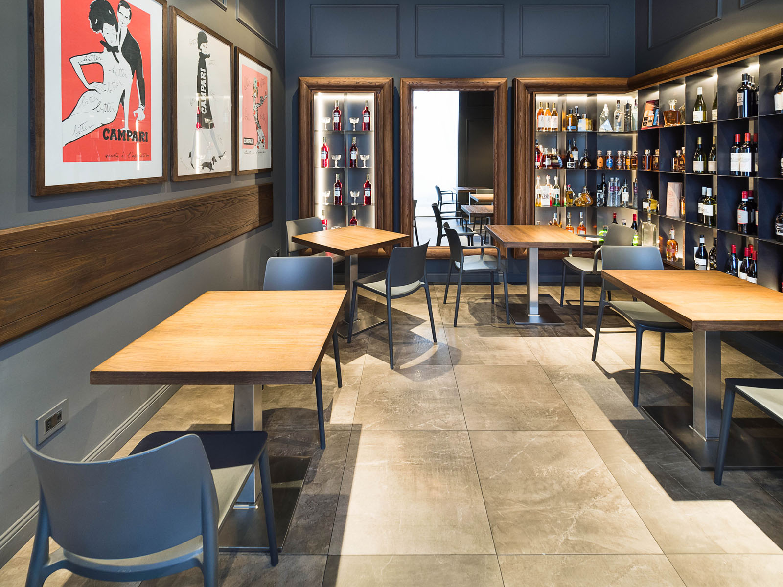 Cafe Noir è un lounge bar situato nel cuore di Reggio Calabria recentemente restaurato dall’architetto Consolato Alampi dello studio Expodesign. Lo stile scelto per il locale è un mix di modernità e mood vintage; le note scure del grigio delle pareti e del soffitto restituiscono un’atmosfera calda ed elegante e dialogano perfettamente con il gres effetto pietra Blend, scelto nel colore Brown e nel formato 60x60, e con le delicate venature di Grande Marble Look Capraia, selezionato nel formato 160x320.