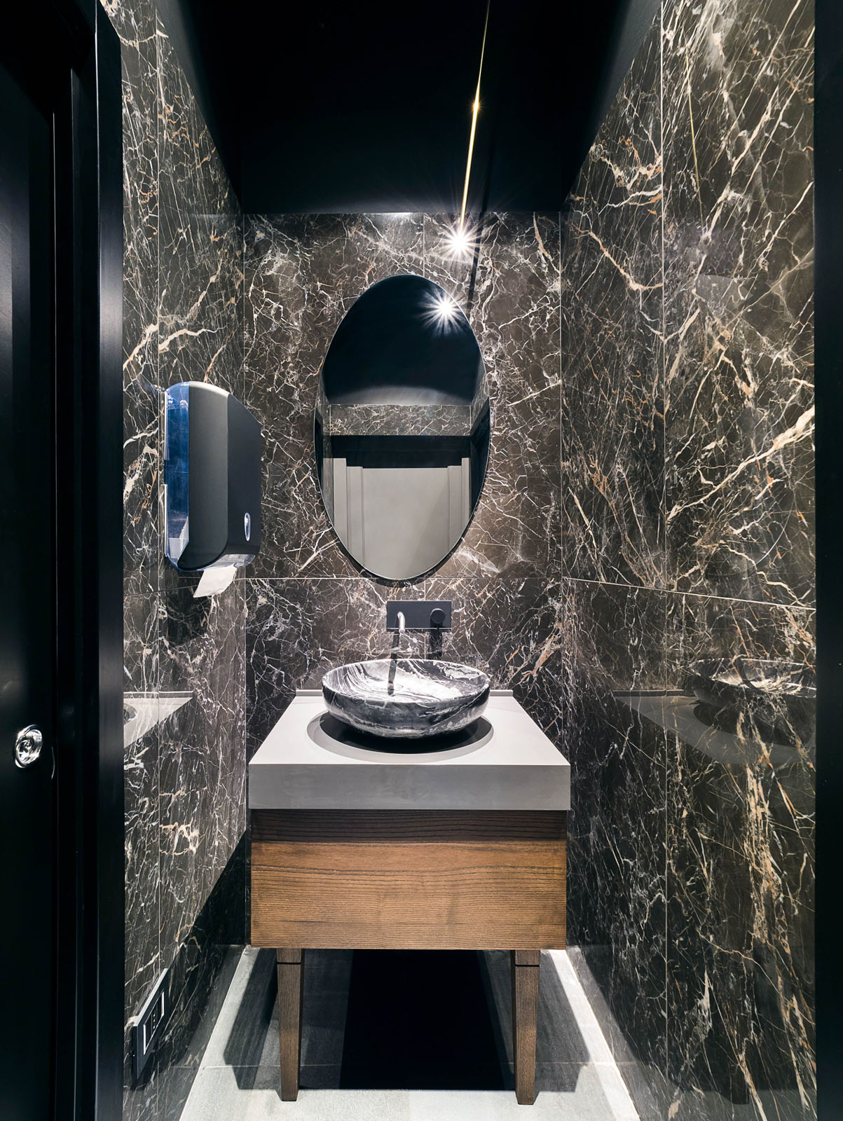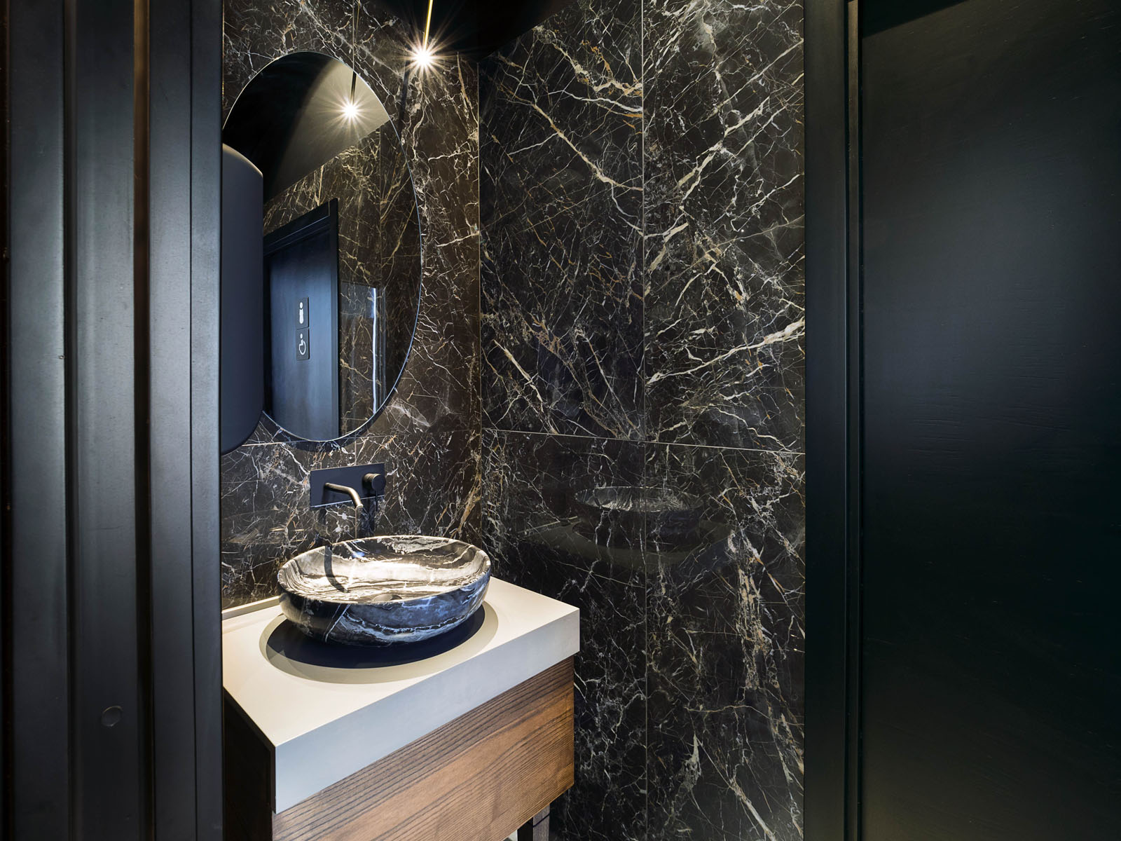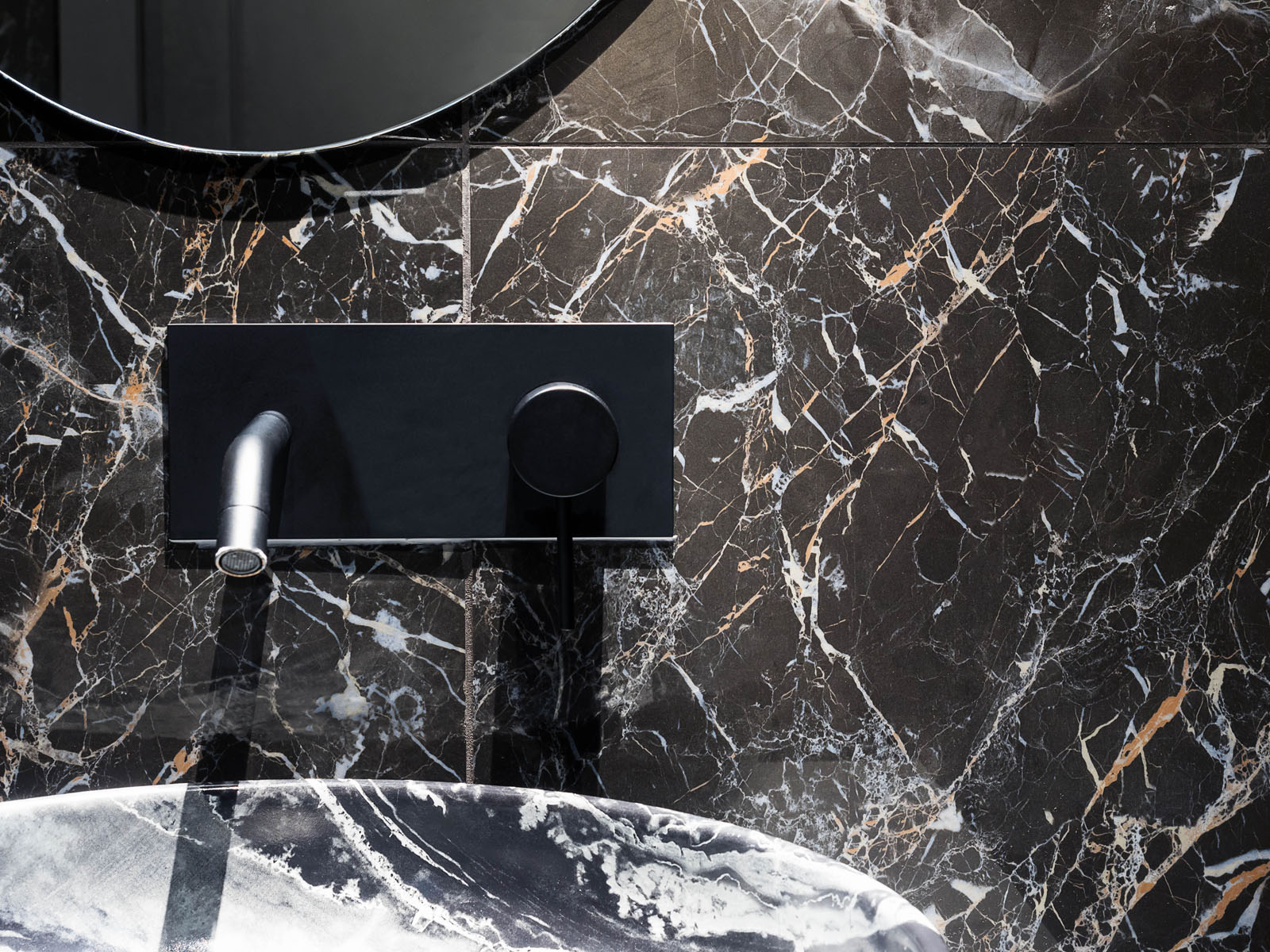 La collezione Blend si ispira alle materie utilizzate per le costruzioni di antiche strutture in cemento ed è il prodotto scelto per il pavimento. Grande Marble Look si è rivelato ideale per rivestire invece il bancone del bar, sormontato da un piano servizio realizzato in corian bianco. Grande è la collezione di lastre Marazzi disponibile nei formati 120x120, 120x240, 160x320, 162x324 e in due spessori 6 e 12 mm ed è ideale per la progettazione di top cucina e bagno, back-splash, tavoli ed elementi d’arredo. Per il bagno si è optato sempre per un gres porcellanato effetto marmo, la collezione Allmarble nell’elegante finitura Saint Laurent Lux 60x120.