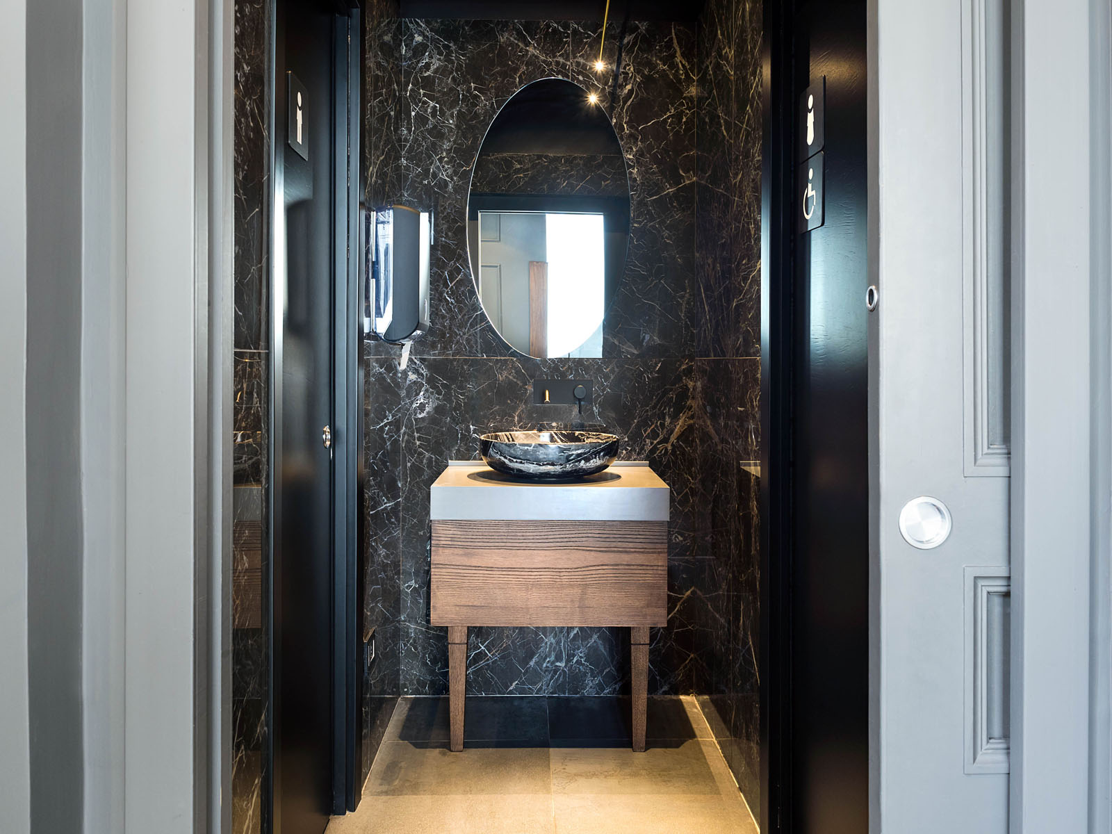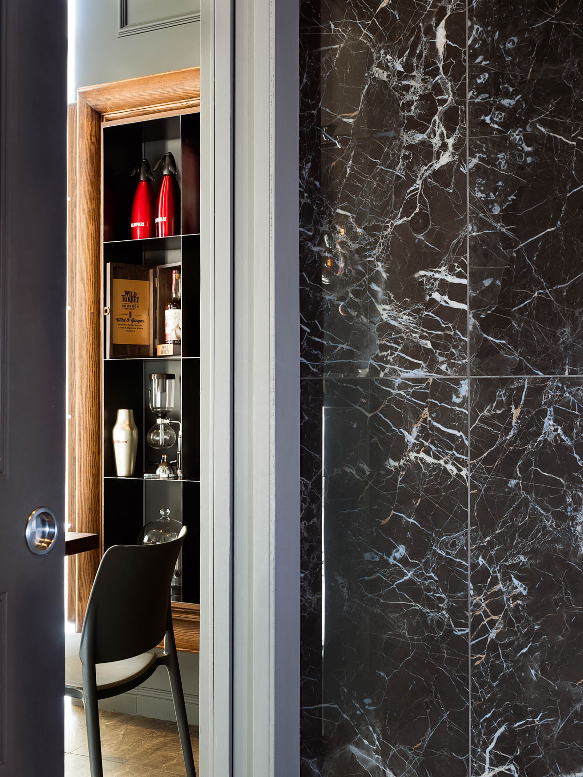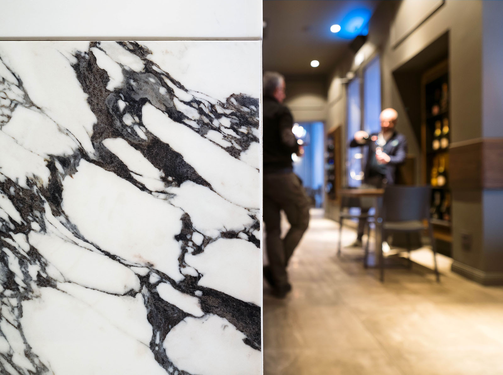 La collezione Blend si ispira alle materie utilizzate per le costruzioni di antiche strutture in cemento ed è il prodotto scelto per il pavimento. Grande Marble Look si è rivelato ideale per rivestire invece il bancone del bar, sormontato da un piano servizio realizzato in corian bianco. Grande è la collezione di lastre Marazzi disponibile nei formati 120x120, 120x240, 160x320, 162x324 e in due spessori 6 e 12 mm ed è ideale per la progettazione di top cucina e bagno, back-splash, tavoli ed elementi d’arredo. Per il bagno si è optato sempre per un gres porcellanato effetto marmo, la collezione Allmarble nell’elegante finitura Saint Laurent Lux 60x120.