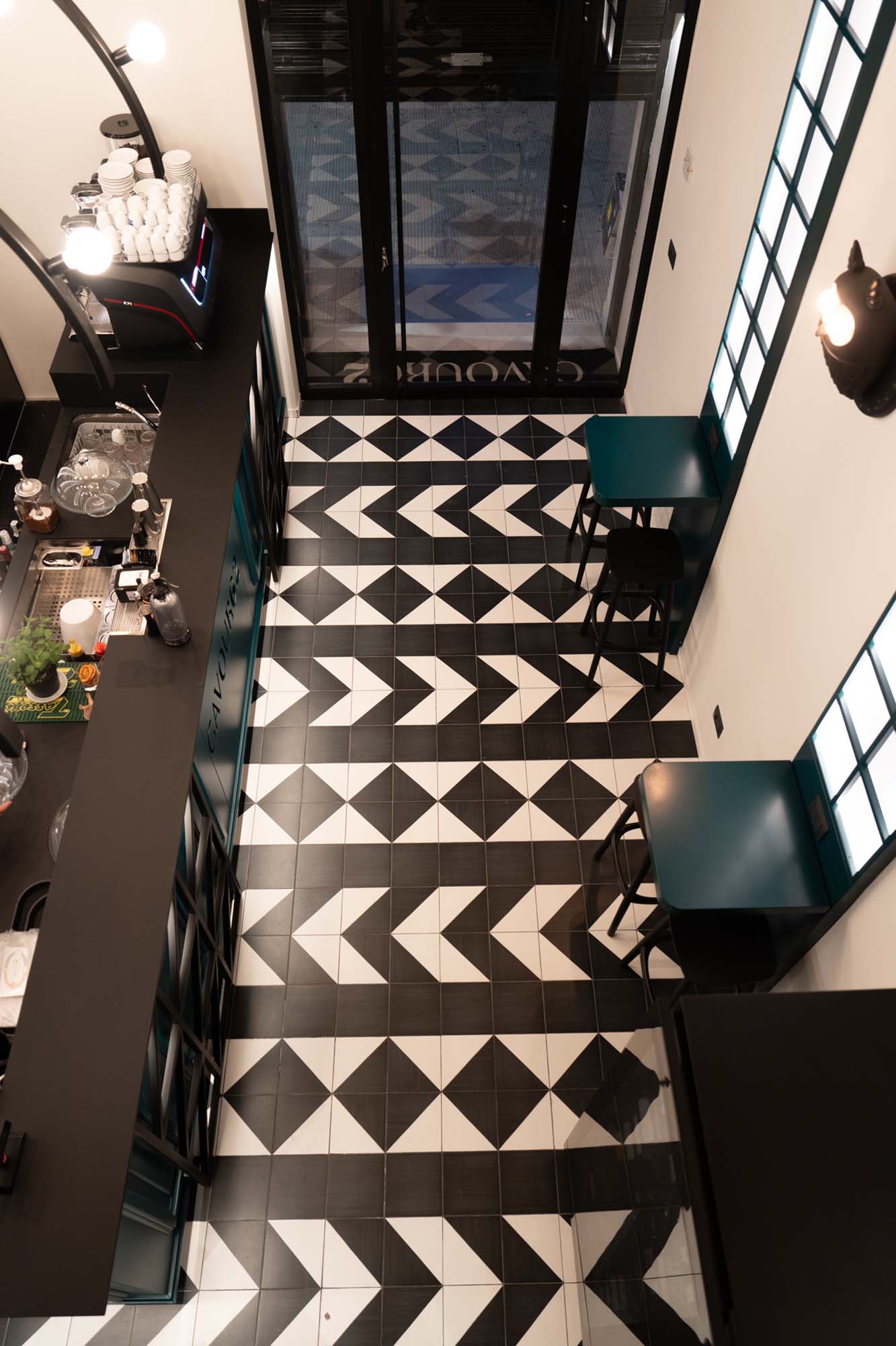 La posa delle mattonelle a contrasto è stata progettata per ampliare lo spazio, alternando fasce piene bicolor e decori triangolari, posati in modo da creare movimenti alternati e dare maggiore profondità all’ambiente.