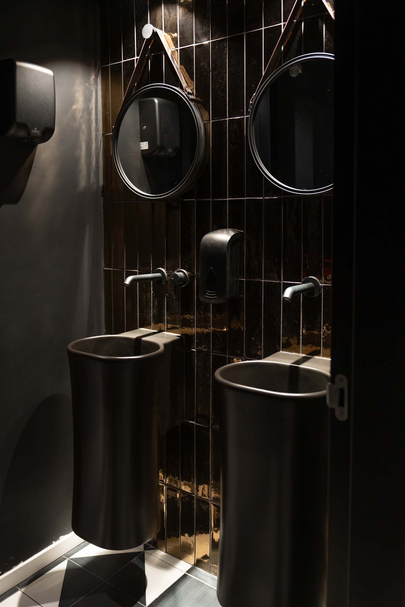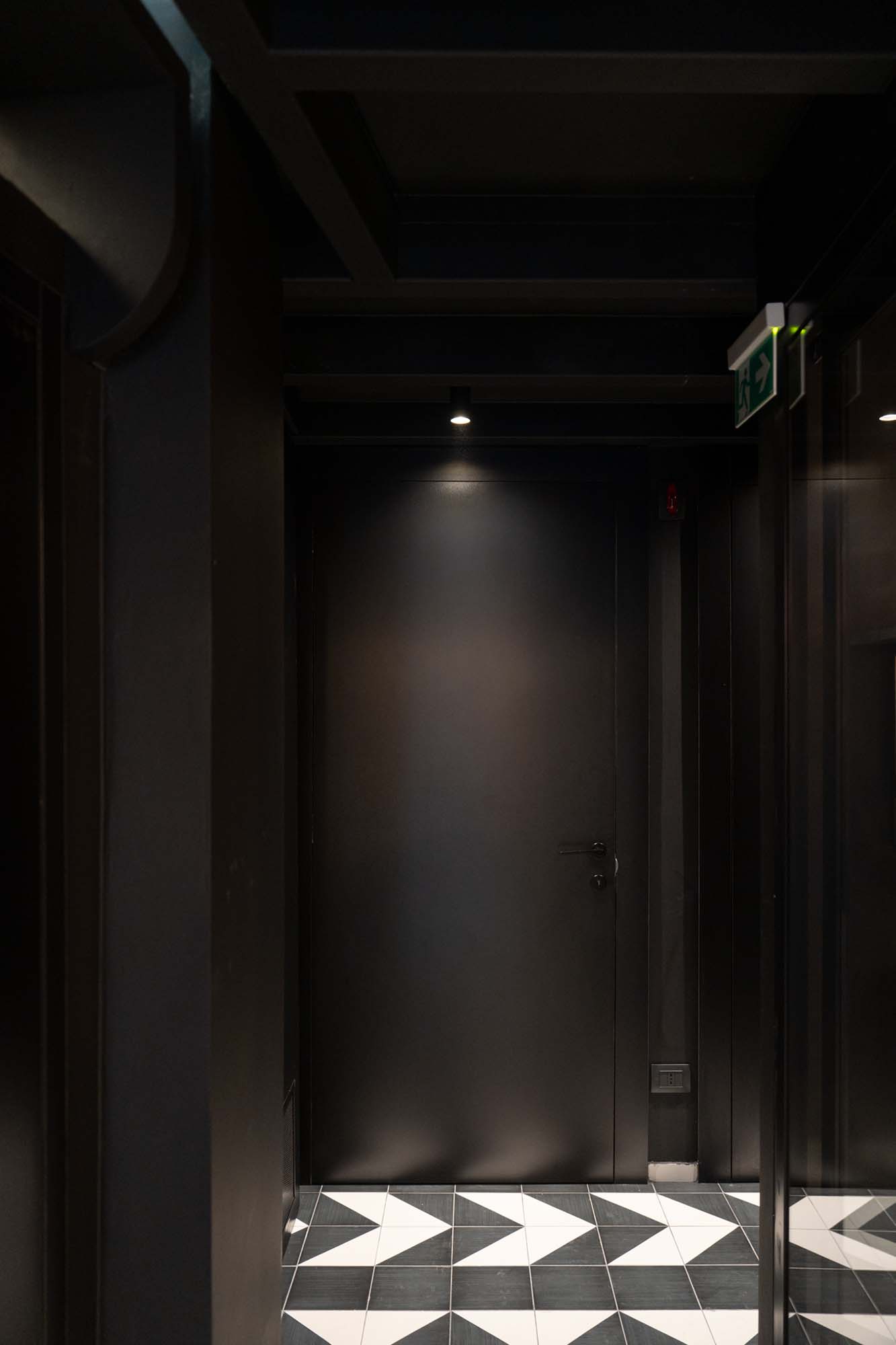 Lo stesso concept optical è stato utilizzato per le sale da bagno, dove il pavimento bicolor diventa il focus degli ambienti, in abbinamento a pareti e sanitari total black.
