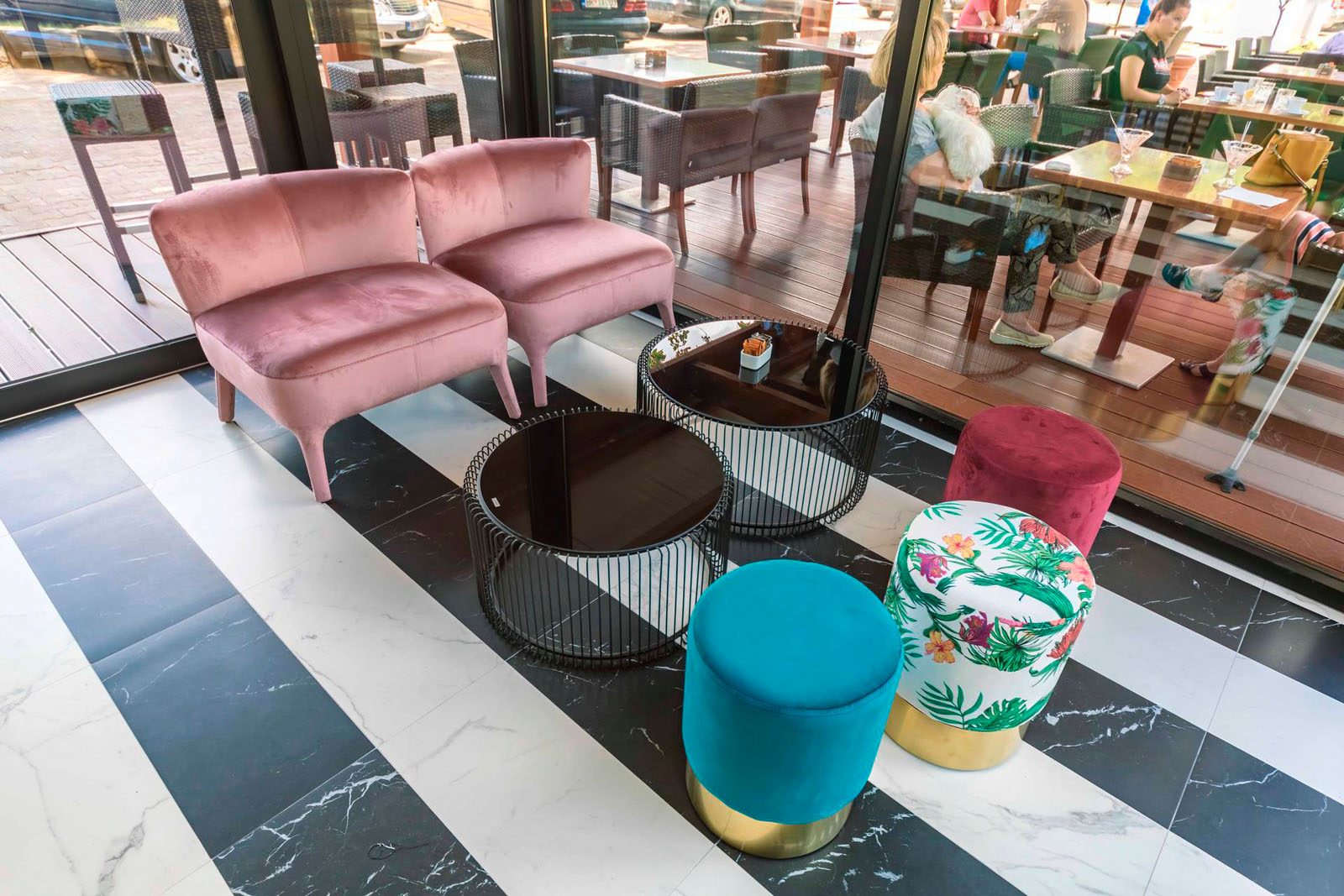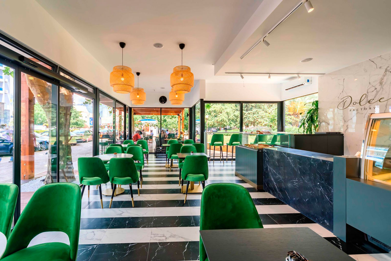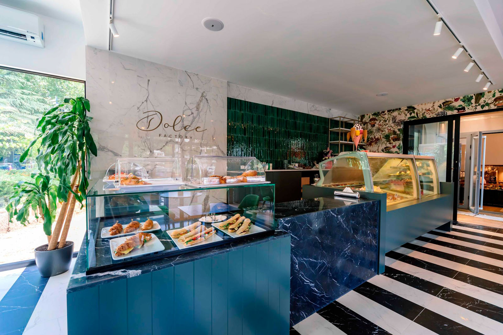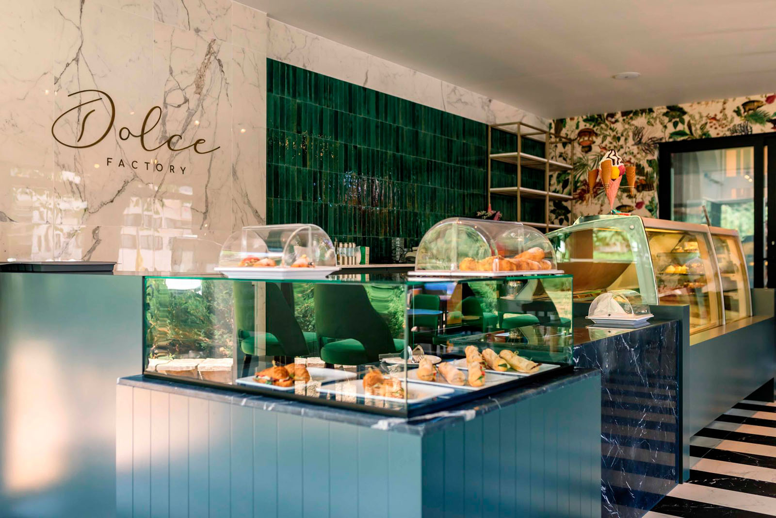 Passeggiando sul lungomare è impossibile restare indifferenti all’originale mix di colori di Dolce Factory, pasticceria progettata dallo studio Art&Craft: velluti accesi, sospensioni intrecciate, tappezzeria tropicale e un elegante pavimento di gres effetto marmo Allmarble di Marazzi, posato in lunghe fasce continue che alternano Elegant Black al bianco Statuario. Altrettanto calibrato l’utilizzo delle piastrelle Crogiolo Lume, nella dimensione di 6x24 cm, un gres porcellanato che, nella finitura lucida del verde, produce interessanti variazioni cromatiche sulla parete dietro il bancone.