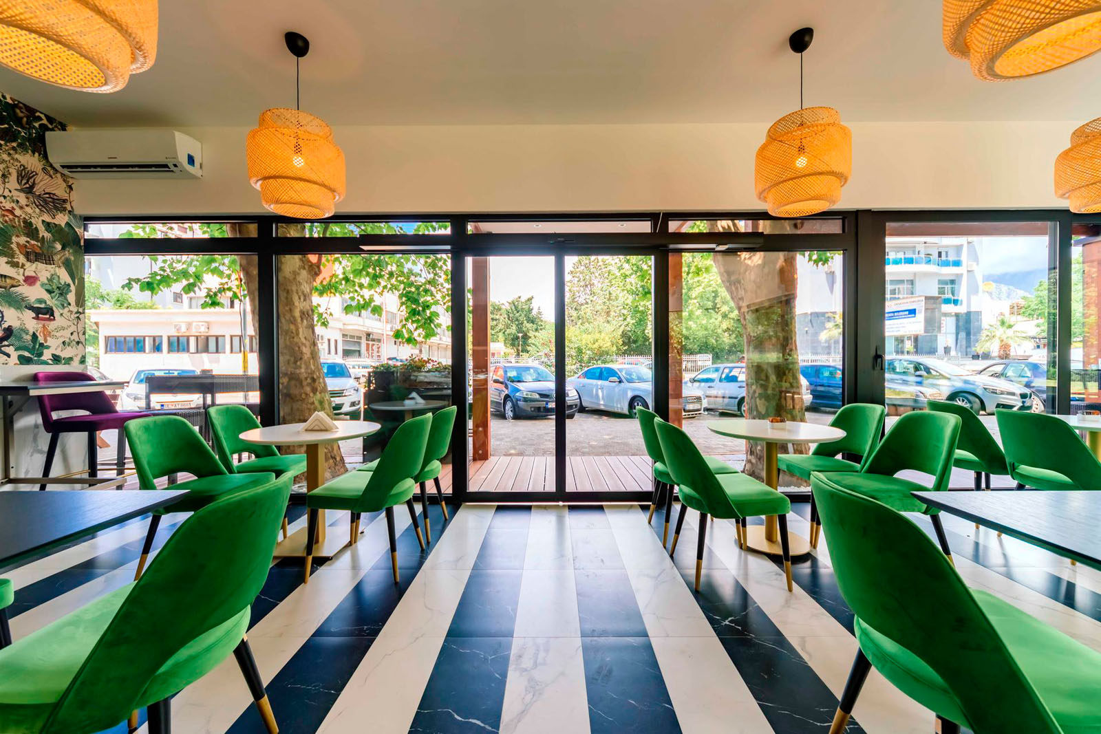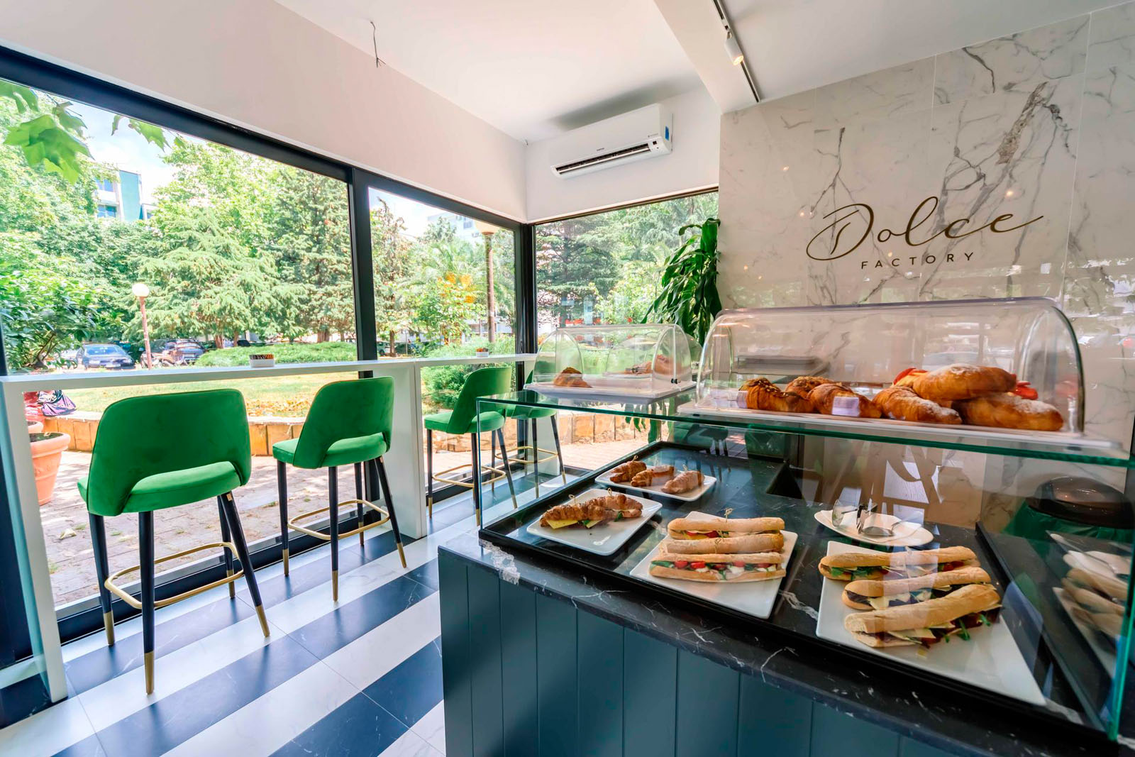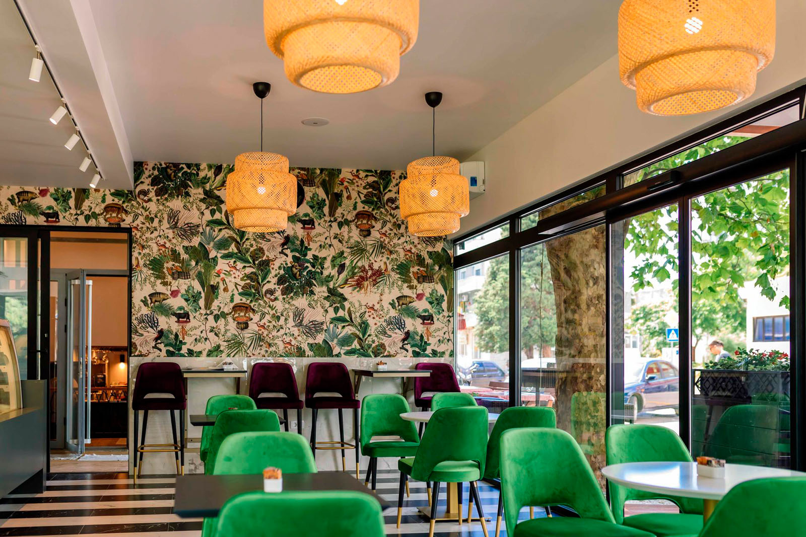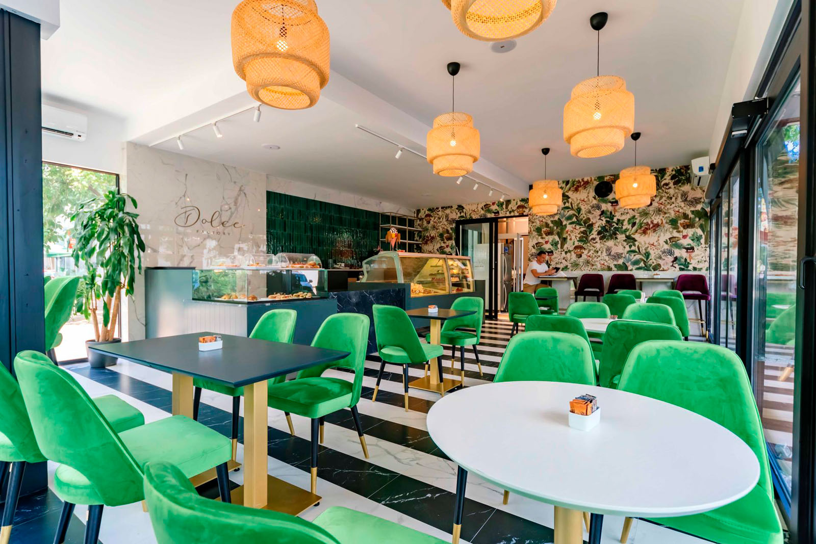 Passeggiando sul lungomare è impossibile restare indifferenti all’originale mix di colori di Dolce Factory, pasticceria progettata dallo studio Art&Craft: velluti accesi, sospensioni intrecciate, tappezzeria tropicale e un elegante pavimento di gres effetto marmo Allmarble di Marazzi, posato in lunghe fasce continue che alternano Elegant Black al bianco Statuario. Altrettanto calibrato l’utilizzo delle piastrelle Crogiolo Lume, nella dimensione di 6x24 cm, un gres porcellanato che, nella finitura lucida del verde, produce interessanti variazioni cromatiche sulla parete dietro il bancone.