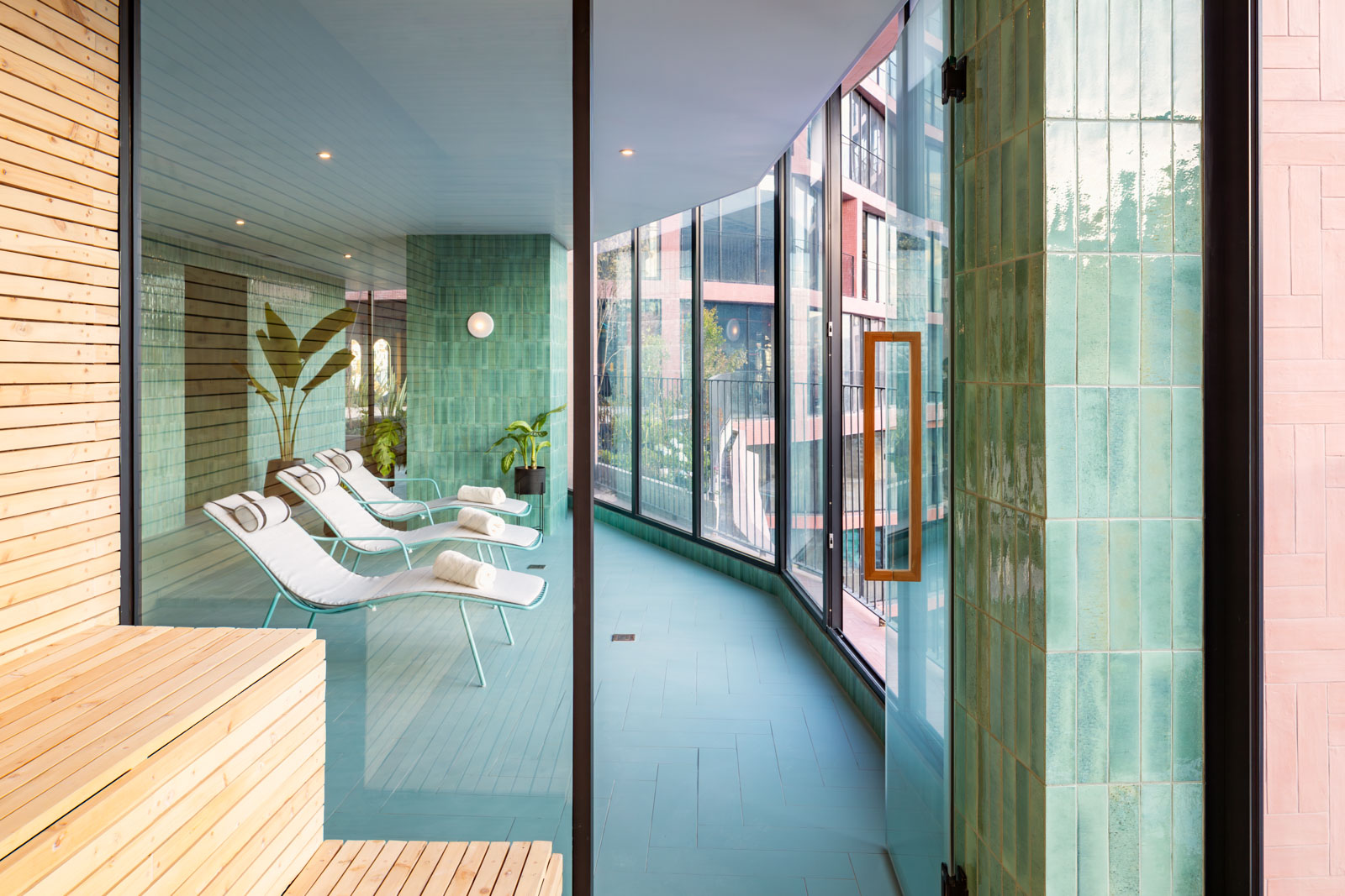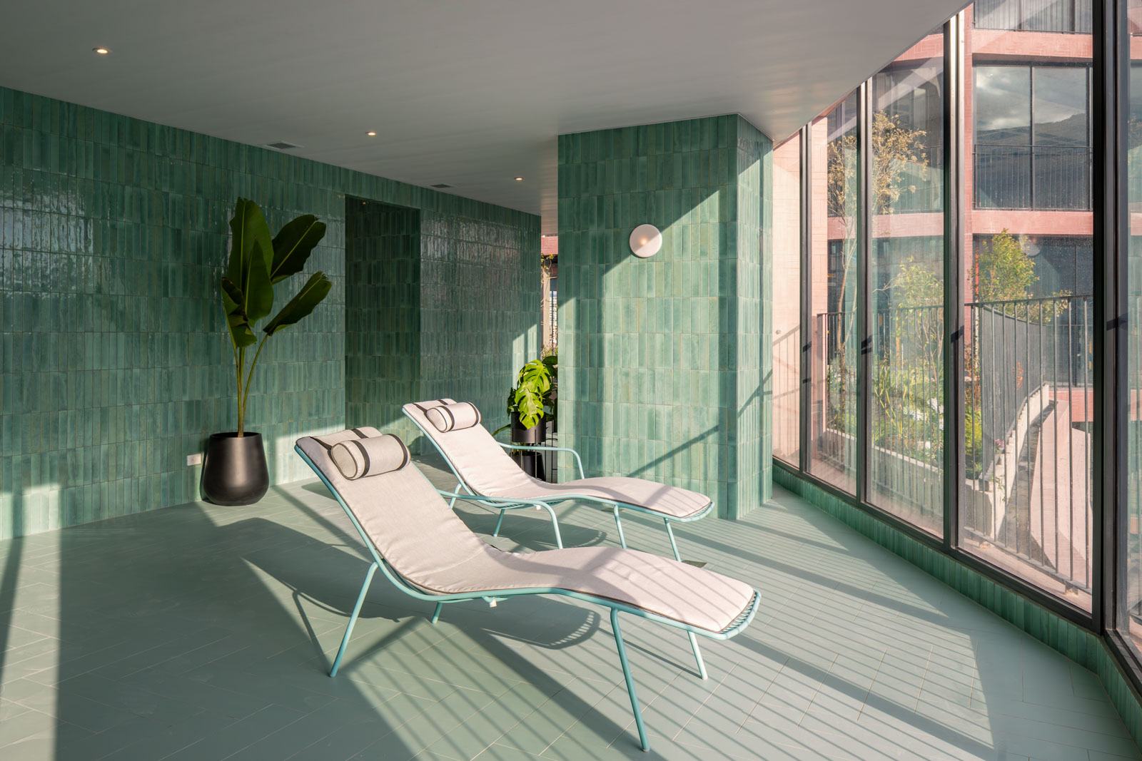 Una ulteriore concessione al benessere è l’area spa interna alla torre residenziale, rivestita dai mattoncini super lucidi maiolicati in gres porcellanato della serie Crogiolo Lume nel colore Turquoise. Anche in questo caso la tinta accesa e l’estetica del “fatto a mano” tornano a parlare della tradizione, anche locale, della ceramica e dei colori accesi delle abitazioni storiche equadoregne.