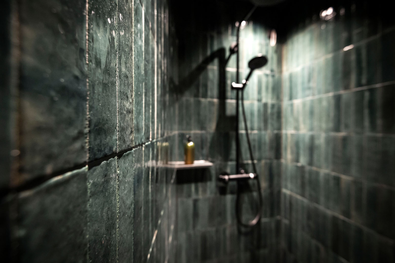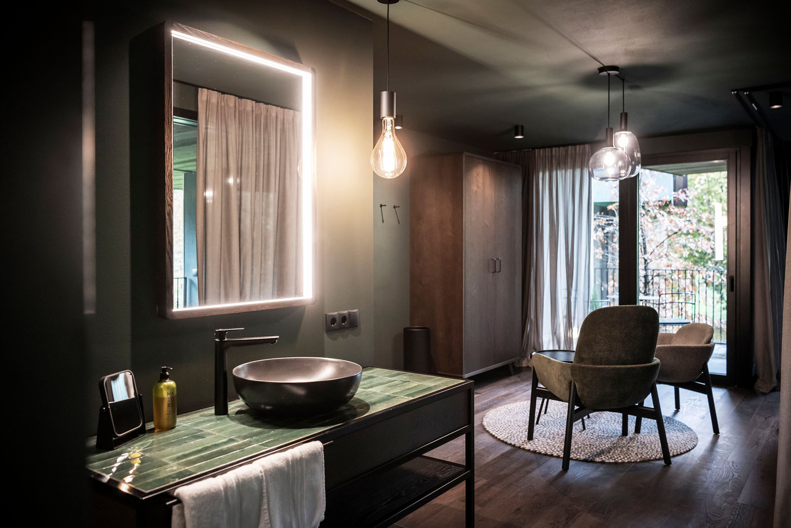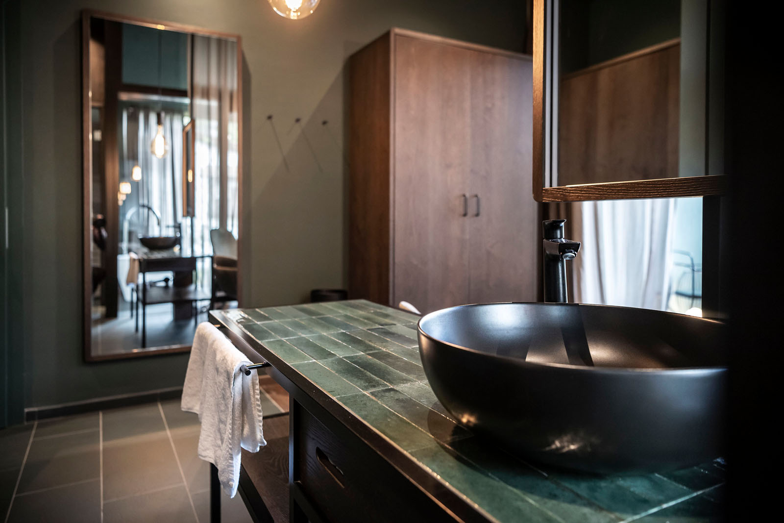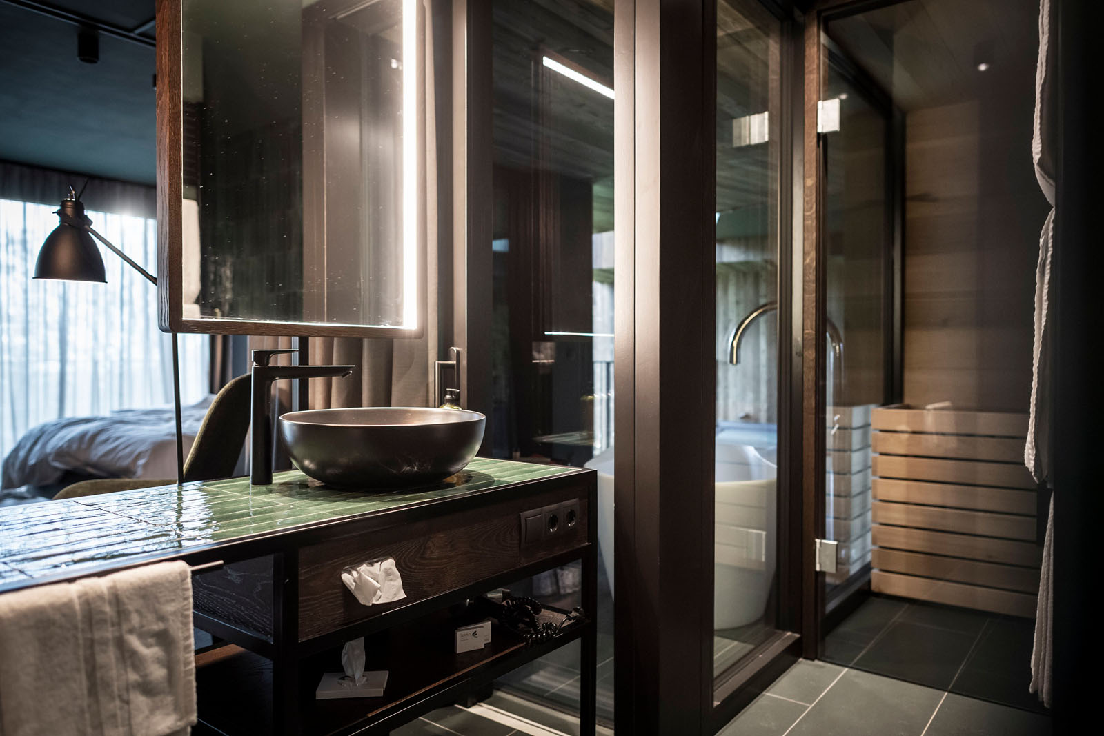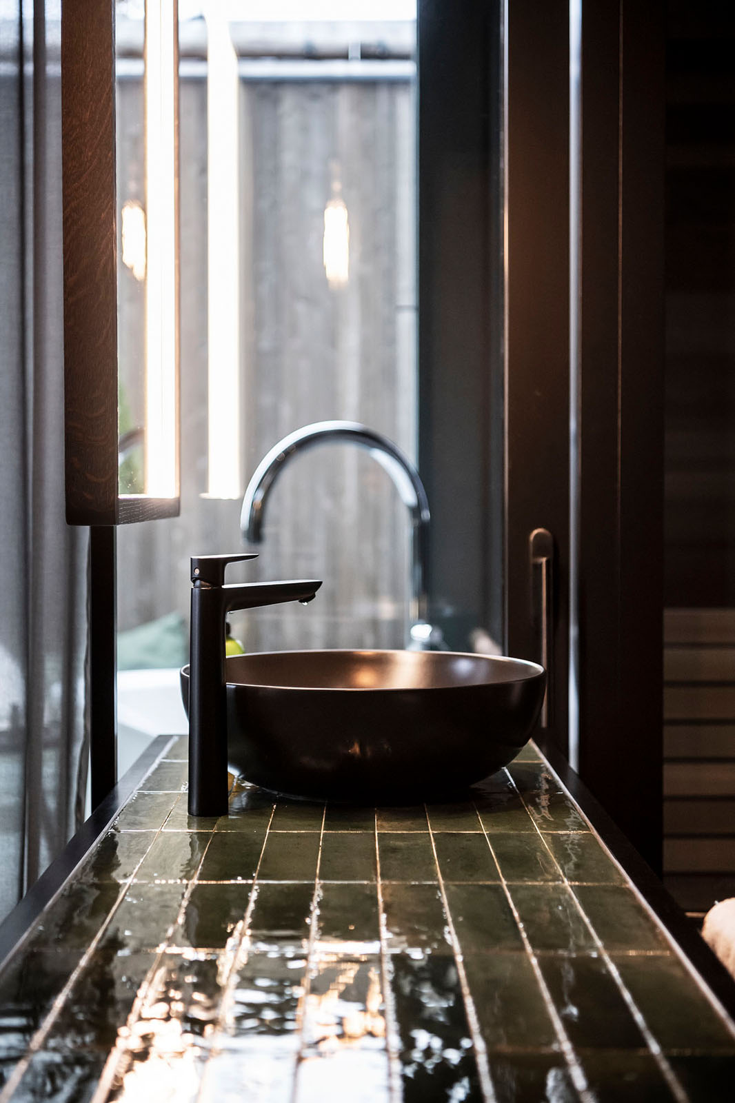 All’interno, materiali e colori sono un continuo rimando al territorio. Così è per Crogiolo Lume, la serie in gres di piccolo formato, le cui mutevoli rifrazioni di luce sono sapientemente utilizzate nella zona doccia e sul top del lavabo autoportante in un brillante colore Green nel nuovo formato di 6x24 cm, in rimando alle eleganti spa d’Oltralpe.