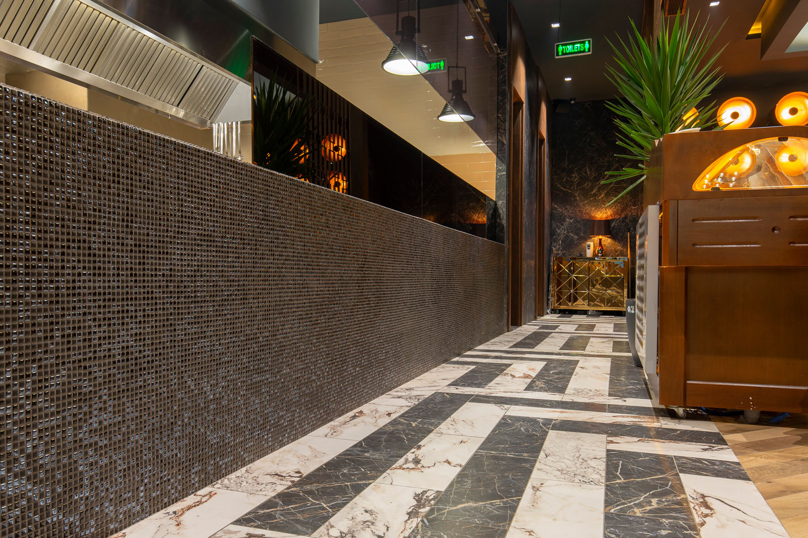 Sono tre le collezioni Marazzi scelte da Musa per progettare il ristorante e delimitare i vari spazi: i gres effetto legno Treverkfusion e le due collezioni in gres effetto marmo Allmarble e Grande Marble Look.
