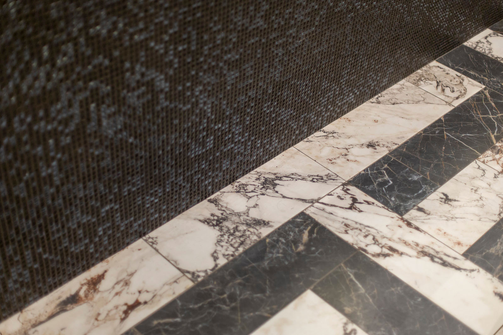 Per il corridoio si è deciso invece di combinare le due finiture della collezione Allmarble - Capraia e Saint Laurent in finitura Matt – tagliate ad hoc per ottenere un decoro personalizzato.