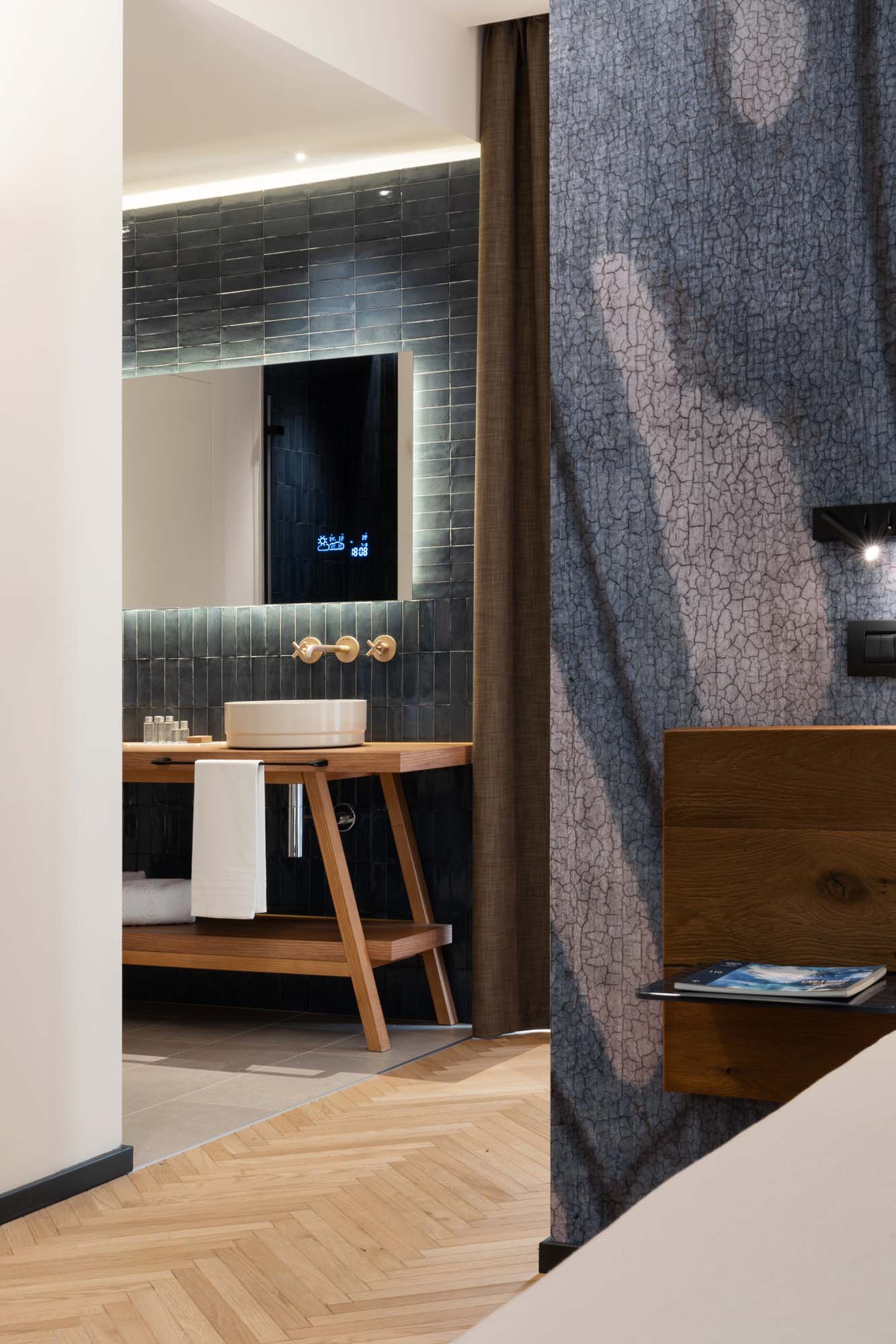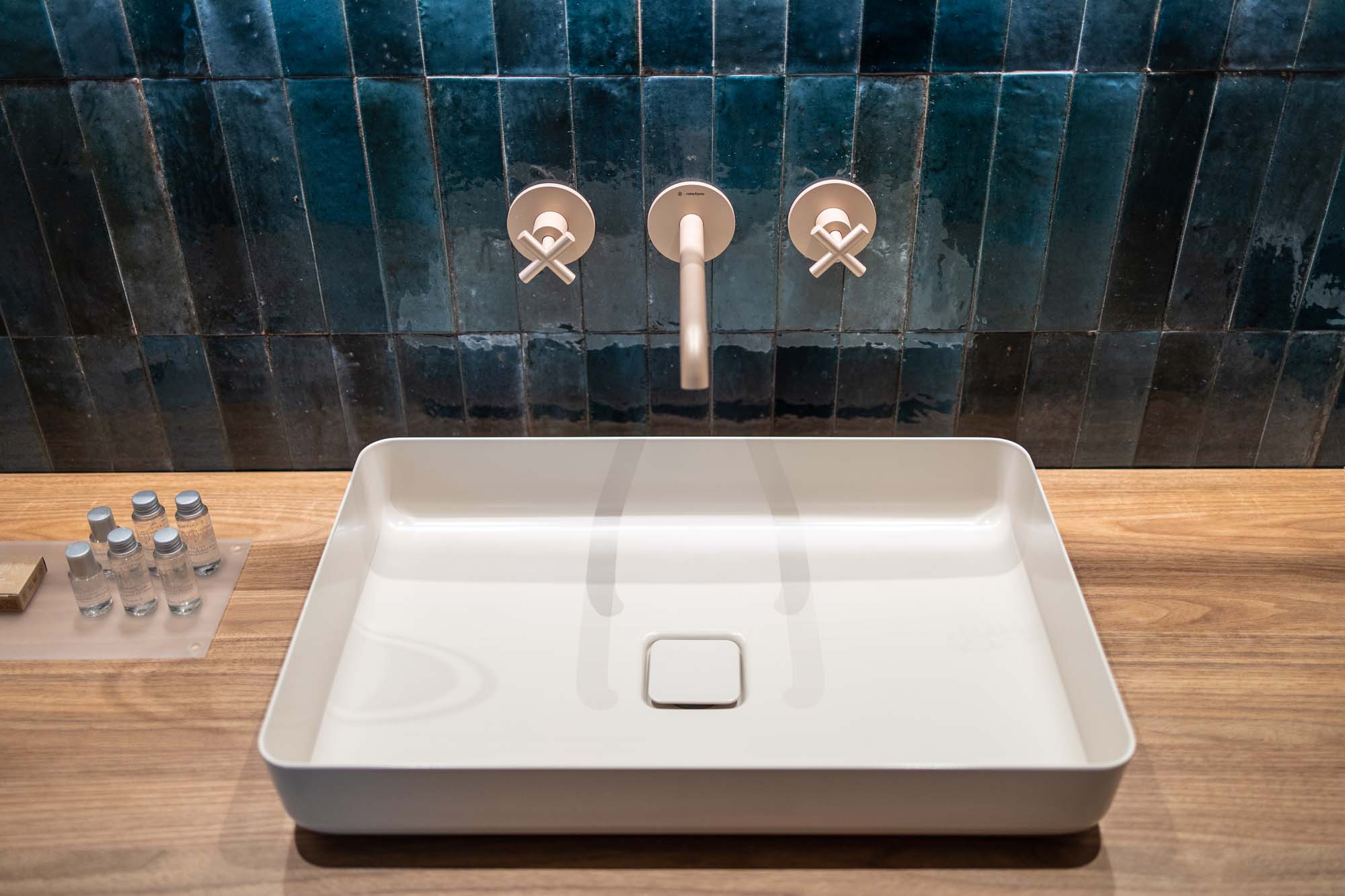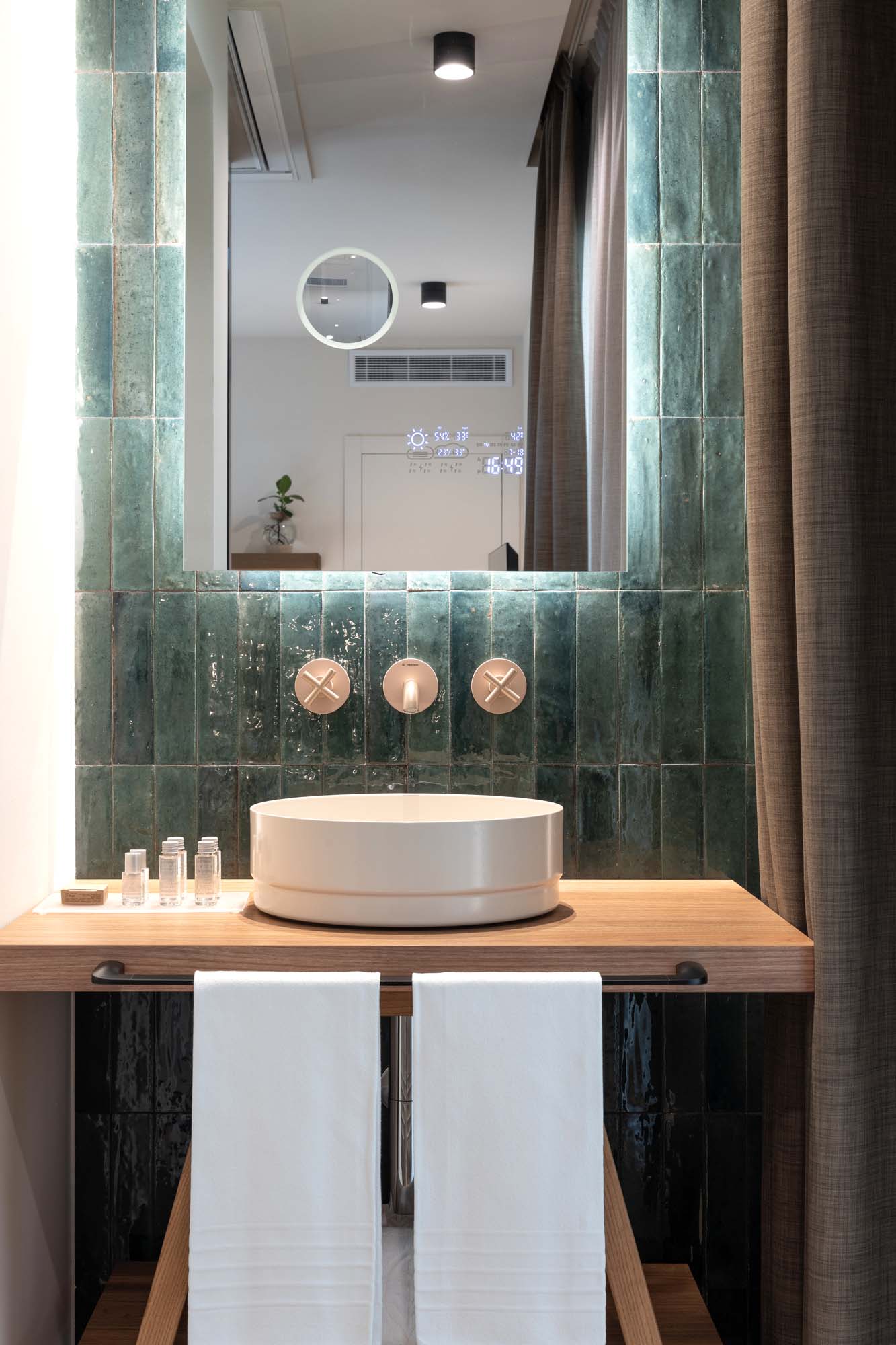 Le stanze da bagno delle camere sono state progettate per dare grande luminosità e carattere all’ambiente, con l’utilizzo di due diversi rivestimenti dalla grande forza espressiva e dall’effetto vibrante, scelti tra le proposte della serie di piccoli formati Crogiolo, che interpreta il sapere artigianale e la manualità in chiave contemporanea. L’area doccia è stata realizzata con Crogiolo Zellige, piccoli mattoncini quadrati dall’effetto handmade ispirati alla tradizione nordafricana. Caratteristica distintiva della collezione sono i passaggi di gradazione che, insieme alla posa random, creano un effetto blend di grande impatto. Per ogni stanza la zona lavabo è stata realizzata con diversi colori di Crogiolo Lume, mattoncini nel formato 6x24 cm dall’appeal contemporaneo e dall’effetto lucidissimo, che connota l’ambiente con variazioni cromatiche e grafiche dall’aspetto imperfetto e vissuto, capaci di far vibrare gli spazi.