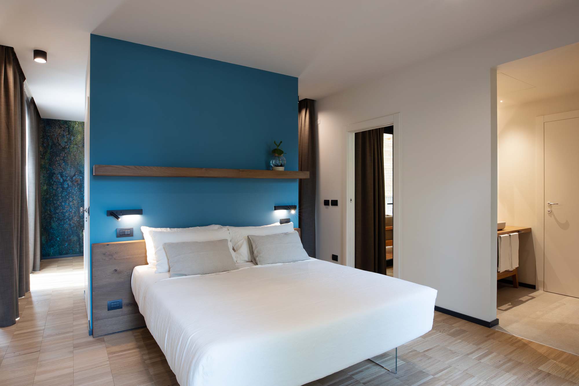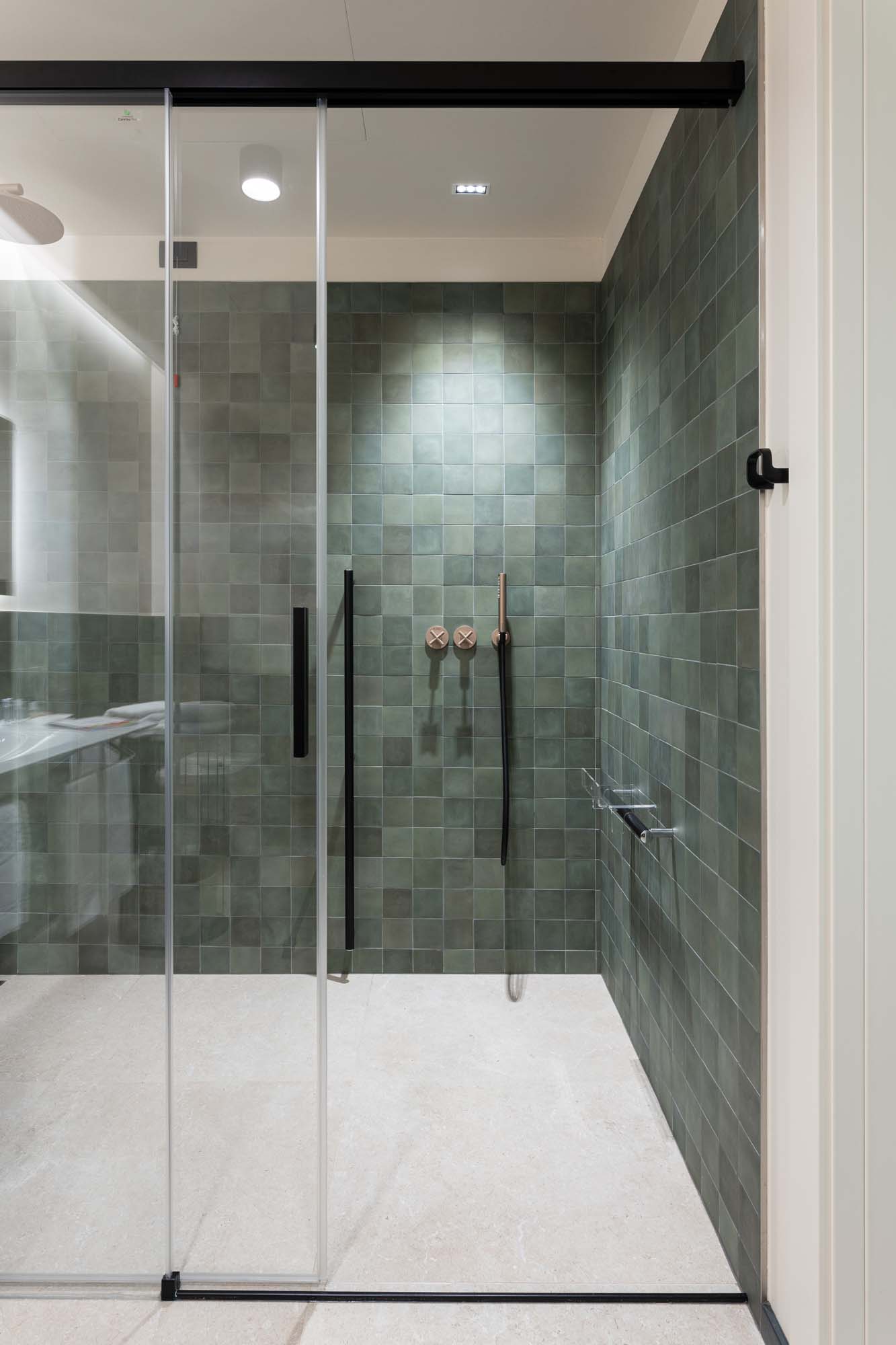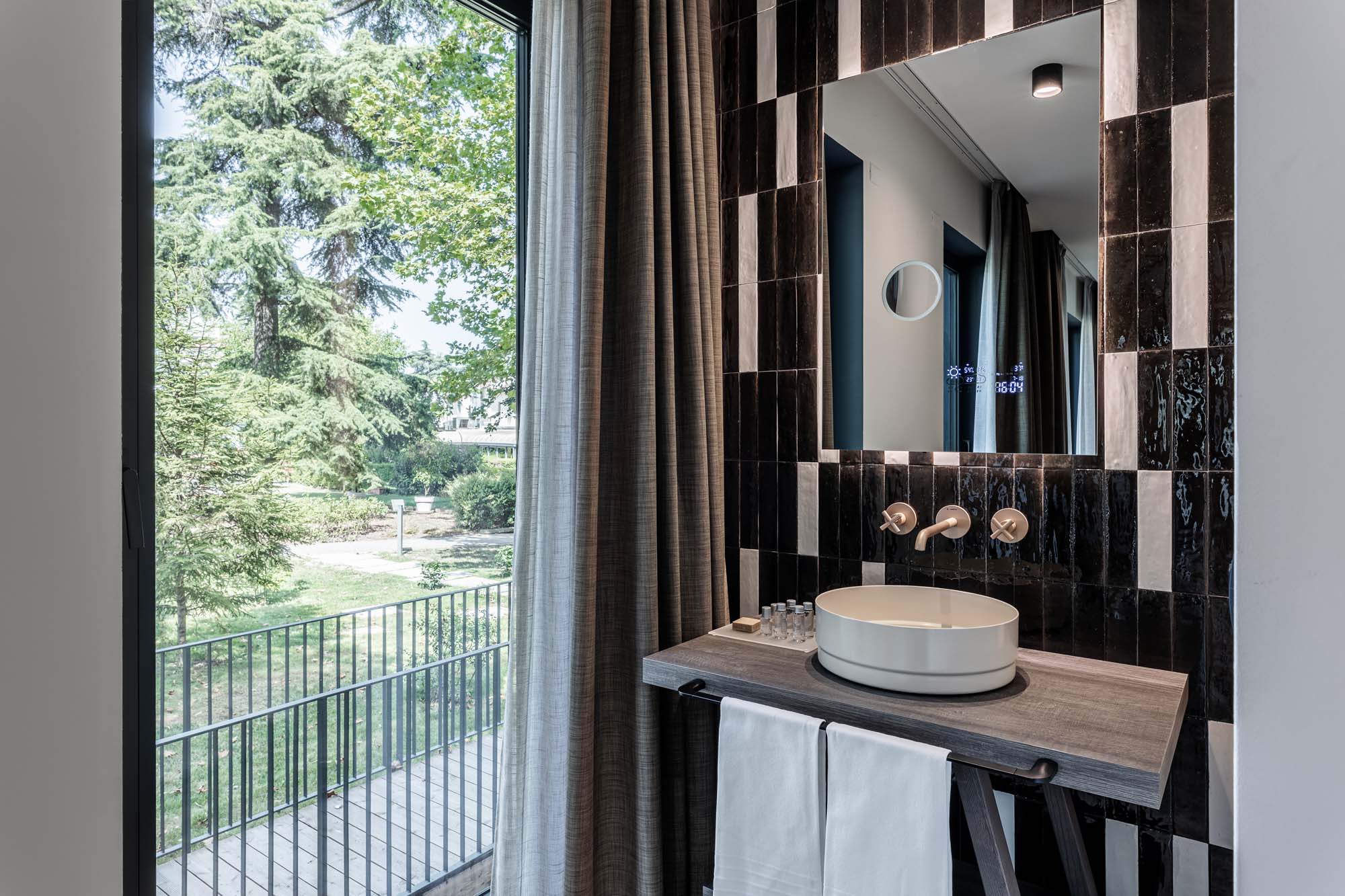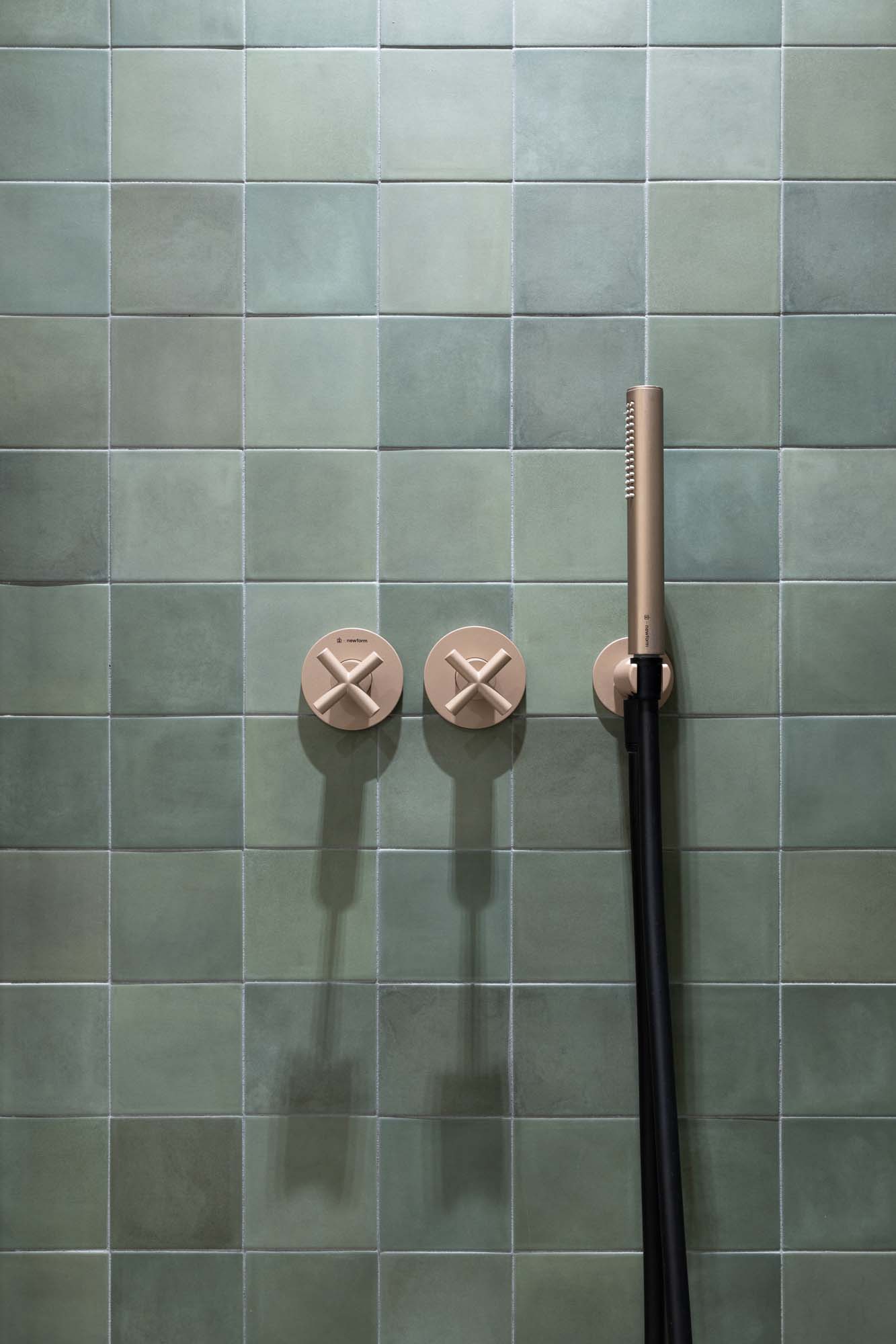 Le stanze da bagno delle camere sono state progettate per dare grande luminosità e carattere all’ambiente, con l’utilizzo di due diversi rivestimenti dalla grande forza espressiva e dall’effetto vibrante, scelti tra le proposte della serie di piccoli formati Crogiolo, che interpreta il sapere artigianale e la manualità in chiave contemporanea. L’area doccia è stata realizzata con Crogiolo Zellige, piccoli mattoncini quadrati dall’effetto handmade ispirati alla tradizione nordafricana. Caratteristica distintiva della collezione sono i passaggi di gradazione che, insieme alla posa random, creano un effetto blend di grande impatto. Per ogni stanza la zona lavabo è stata realizzata con diversi colori di Crogiolo Lume, mattoncini nel formato 6x24 cm dall’appeal contemporaneo e dall’effetto lucidissimo, che connota l’ambiente con variazioni cromatiche e grafiche dall’aspetto imperfetto e vissuto, capaci di far vibrare gli spazi.